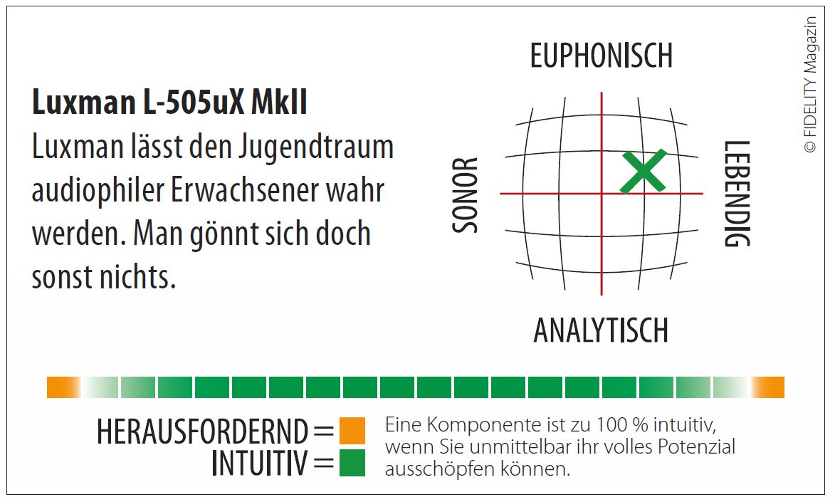 Derlei Exzellenz – das soll schlussendlich nicht verschwiegen werden – hat natürlich ihren Preis, wenngleich einen durchaus reellen: Mit 4500 Euro liegt die Mark-II-Weiterentwicklung des Luxman L-505uX leicht über dem Preis des Vorgängers, man befindet sich also im Bereich einer ernsthaften Investition und zugleich am unteren Ende der preislichen Luxman-Skala. Dafür bekommt man aber ein Gerät, das ein langjähriger musikalischer Weggefährte sein wird, in absolut jeder musikalischen Situation vollends überzeugt und auch bei weiter wachsenden Ansprüchen das Herzstück der Wiedergabekette bleiben wird. Und von sowas hat man doch früher schon geträumt, oder?