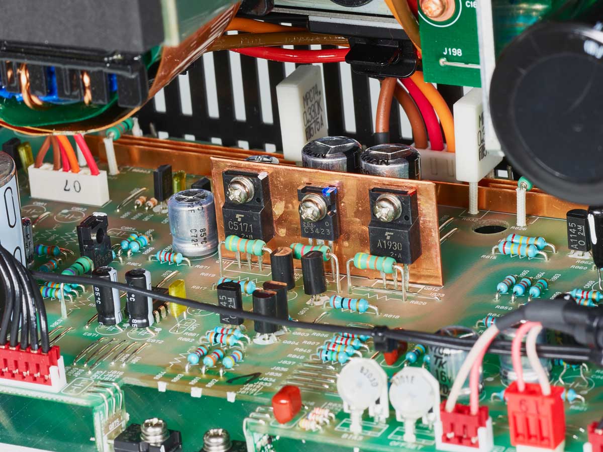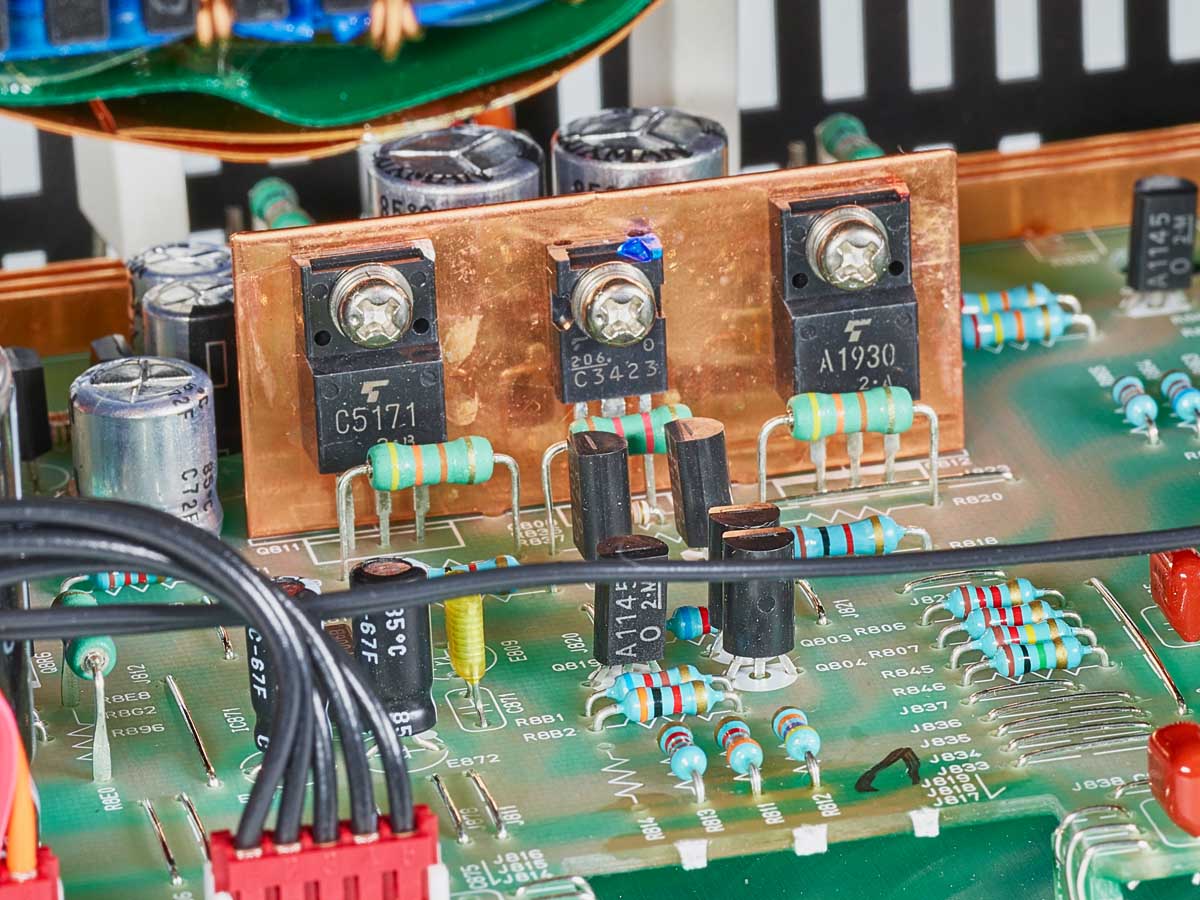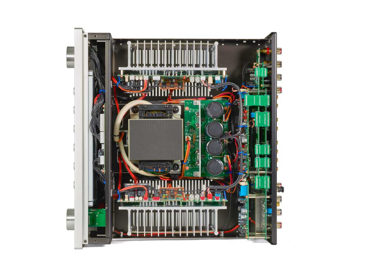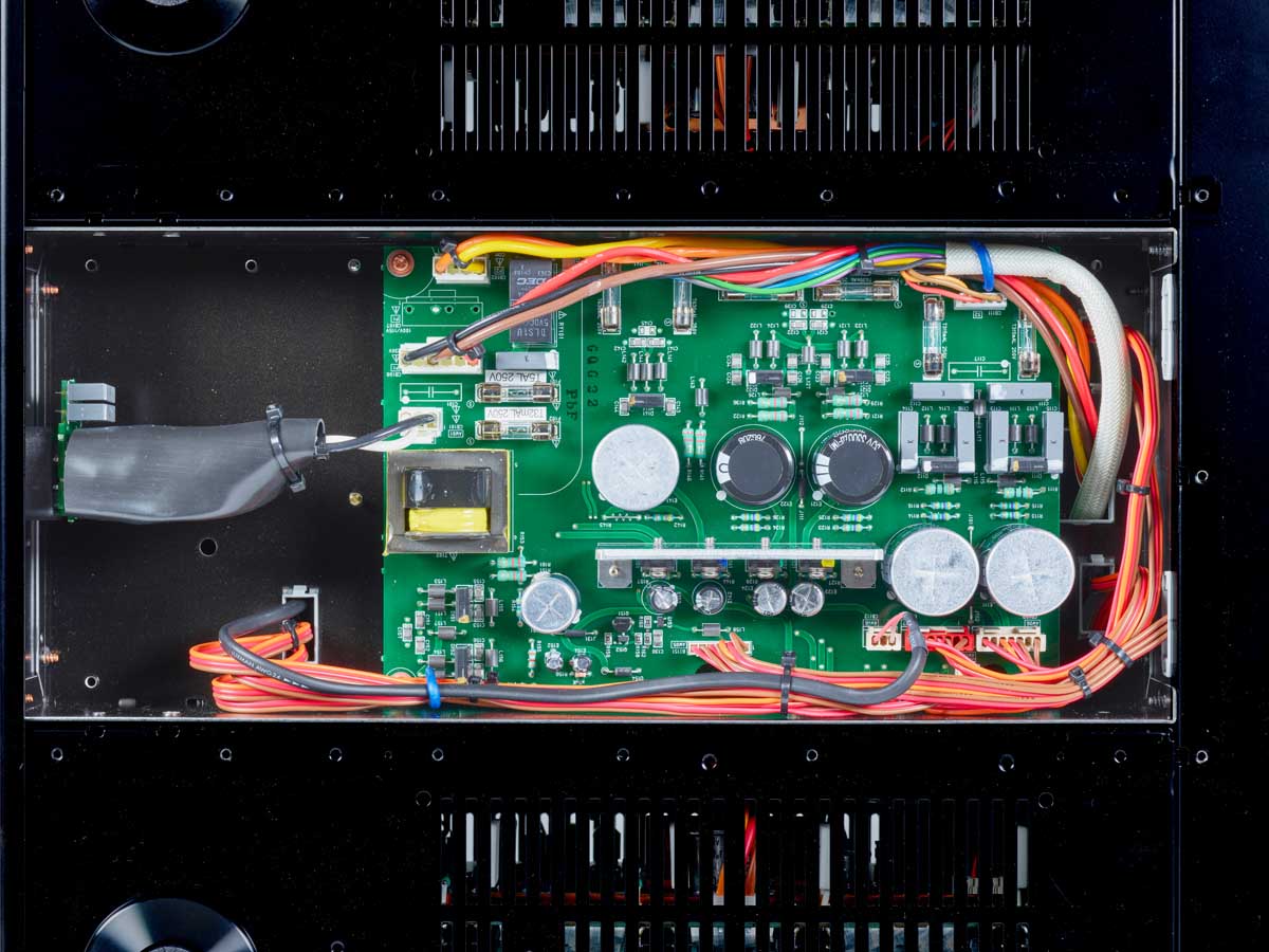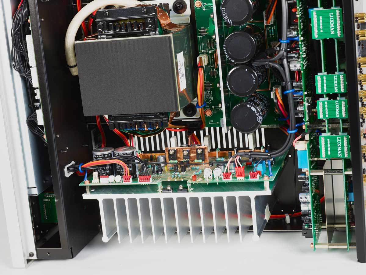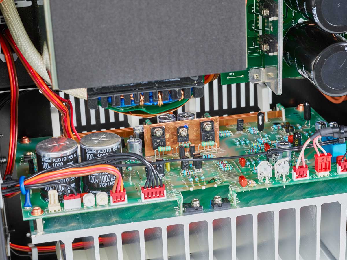 Im Inneren des Class-AB-Verstärkers befindet sich eine Mischung aus Bewährtem und Neuem. Besonders stolz ist man auf eine spezielle Gegenkopplung, die unter der Bezeichnung „ODNF“ firmiert und nunmehr in der Version 4.0 implementiert wurde. Das Buchstabenkürzel steht für „Only Distortion Negative Feedback“ und bedeutet, dass ausschließlich verzerrte Audioanteile zurückgeführt werden. Die neue Schaltung soll Verzerrungen wesentlich schneller und genauer erkennen und im Ergebnis mehr Bandbreite und ein verbessertes Signal-Rausch-Verhältnis liefern. Ferner hat man der Vorverstärkereinheit eine neue diskrete Pufferschaltung in der Ausgangsstufe spendiert, wie man sie ähnlich bereits in der ungleich teureren Luxman-Vorstufe C-900u findet.