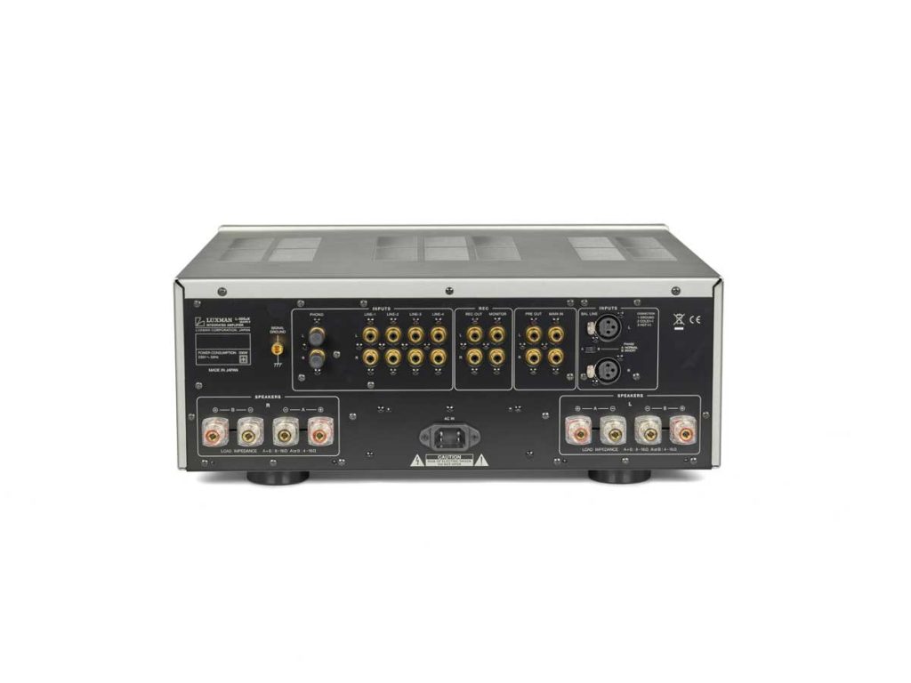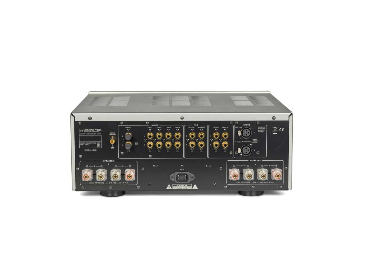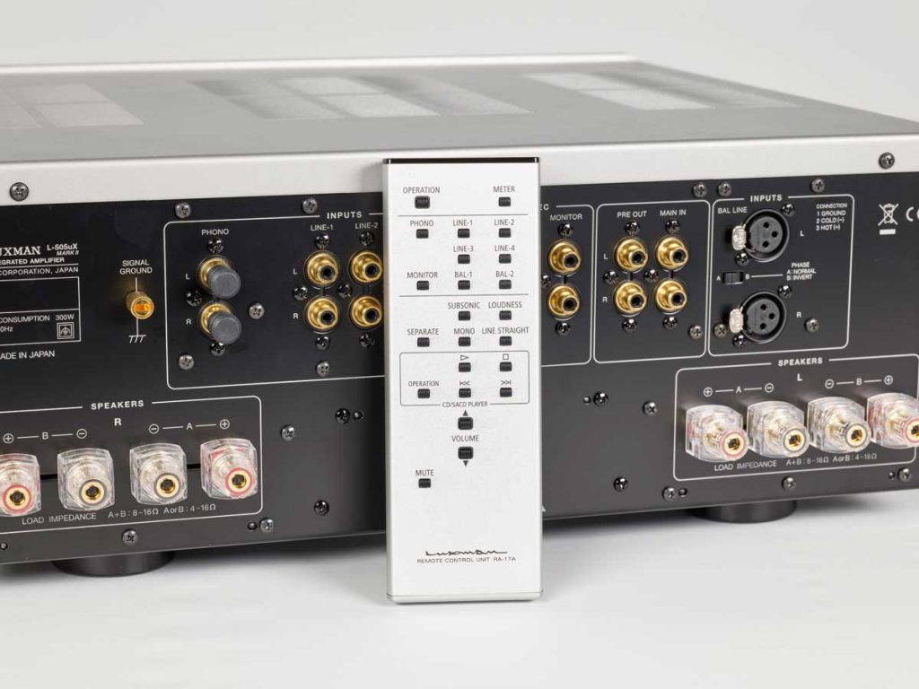 Einmal an Ort und Stelle, erweist sich der Luxman als recht anspruchslos. Für Zuspieler stehen an der Geräterückseite neben einem Phono-Terminal (sowohl für MM- als auch MC-Systeme) vier unsymmetrische Cinch-Eingänge und ein symmetrischer XLR-Eingang zur Verfügung. Dass es sich um ein traditionsreiches Modell handelt, wird augenfällig angesichts der Record-Buchsen – man bekommt förmlich Lust, das alte Kassettendeck anzuschließen oder das Tonbandgerät vom Dachboden zu holen … Schallwandler lassen sich zwei Paar anschließen und entweder simultan oder wahlweise beschicken. Der Anschluss mit Kabelschuh oder Litze ist leicht zu bewerkstelligen, Bananenstecker hingegen erfordern die Herausnahme der Schutzzapfen aus Kunststoff, dazu braucht es etwas Fingerspitzengefühl. Im Bedarfsfall lässt sich das Vorverstärkersignal für weitere oder alternative Endverstärker abzapfen. Das Layout der Anschlüsse ist logisch, angenehm übersichtlich und – von einem Phasenumschalter für den symmetrischen Eingang abgesehen – vollkommen überraschungsfrei.