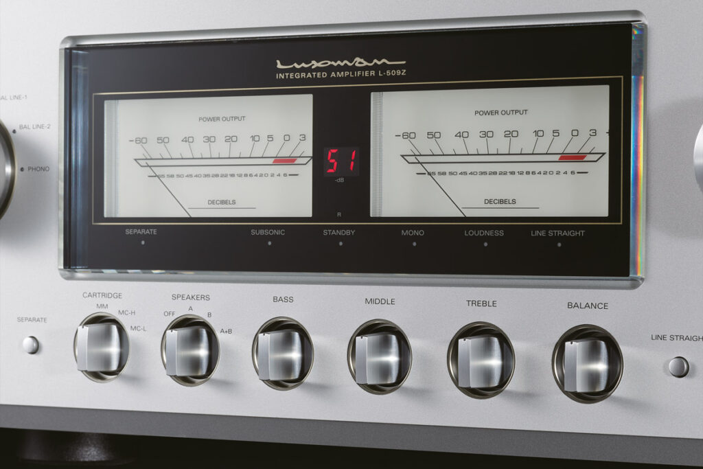 Das Gehäuse aus dickem Aluminium mit Hairline-Finish sorgt nicht nur für eine effiziente Wärmeableitung, sondern verleiht dem Verstärker auch eine edle Optik, die das Innere widerspiegelt. Sorgfältig gefertigte Lüftungsöffnungen gewährleisten eine optimale Luftzirkulation, während robuste Isolierfüße aus Gusseisen unerwünschte Vibrationen minimieren und das Hauptchassis vor externen Störungen schützen. Der L-509Z ist nicht nur ein technisches Meisterwerk, sondern auch ein ästhetisches Highlight für jeden Musikliebhaber: Auf der Frontplatte repräsentieren zwei zentral angeordnete analoge VU-Meter die klassische Luxman-Verstärkertradition. Diese Meter können auf Wunsch auch abgeschaltet werden, um sich ganz auf die Musik zu konzentrieren.
