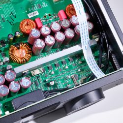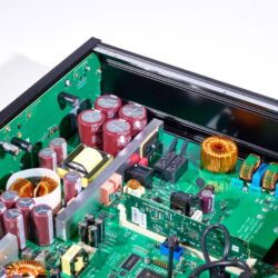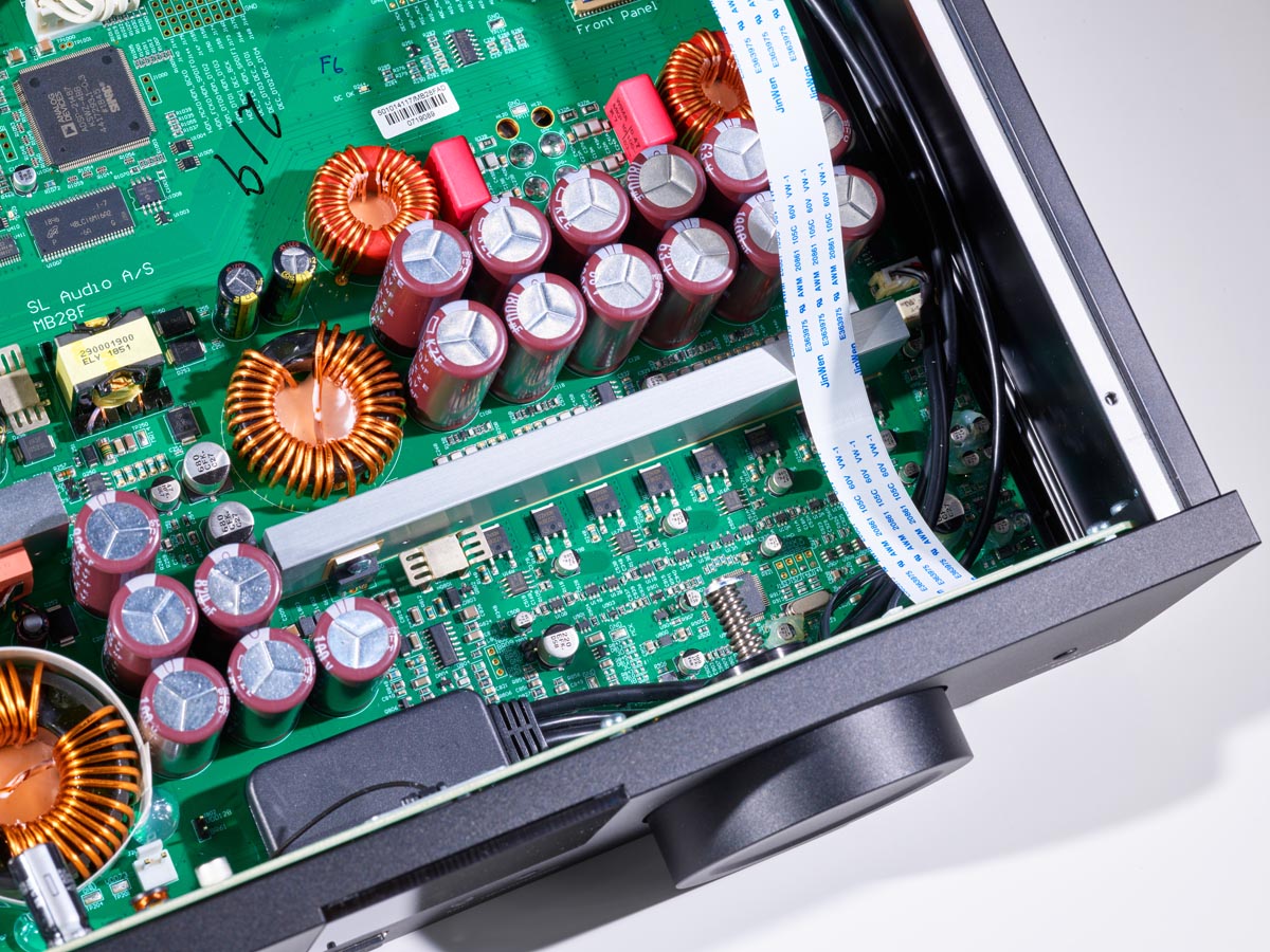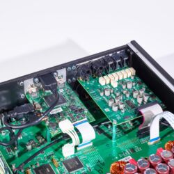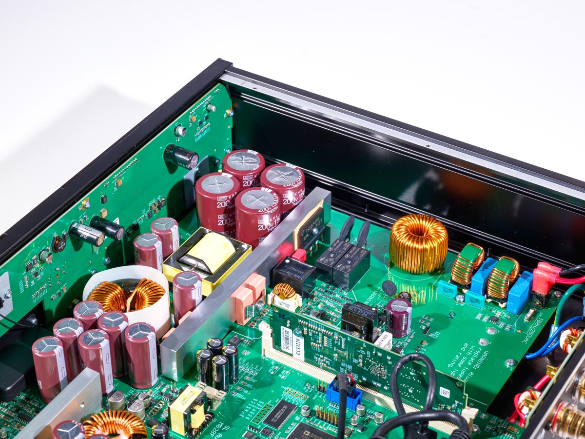 Im Innern erinnert wenig an einen normalen Verstärker, alles läuft auf digitaler Ebene und verbleibt weitgehend im Dunkel. Da sich Lyngdorf seiner Vorreiterrolle in dieser Technologie bewusst ist, kann eine Eigenentwicklung der wichtigen Baugruppen nur Ehrensache sein. Nein, die üblichen Module à la ICE, NCore und Anverwandten lassen sich hier nicht ausmachen – noch nicht mal als umgesäbelte OEM-Version. Man kann es, genießt und schweigt.