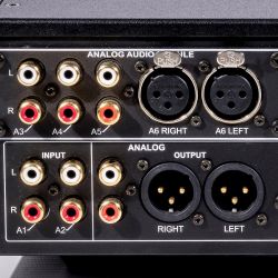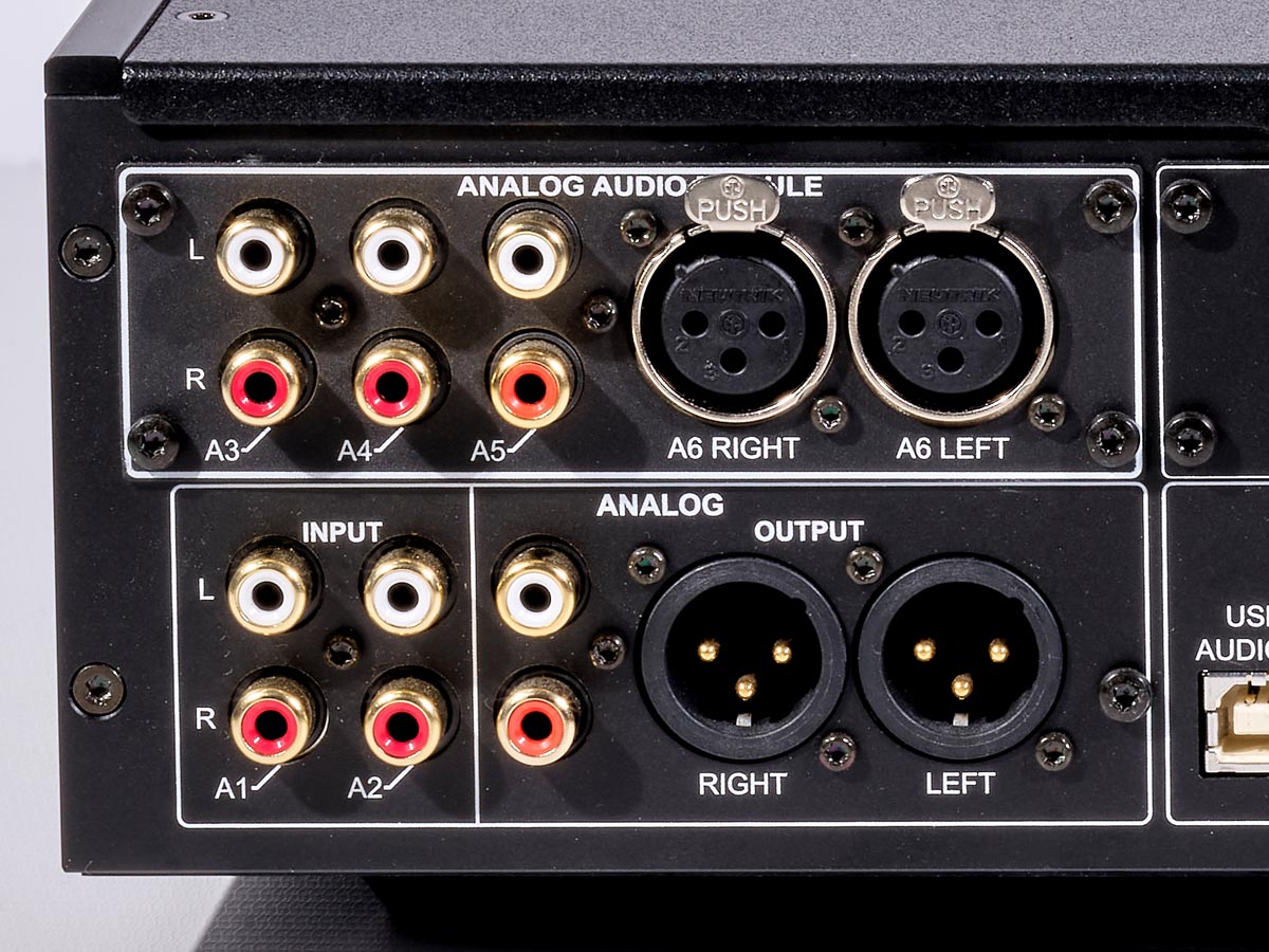 Eingänge digital: 1 x XLR (AES/EBU, 24/192), 2 x koaxial (24/192), 3 x optisch (24/96), 1 x USB-B (32/384, DSD128, DXD)