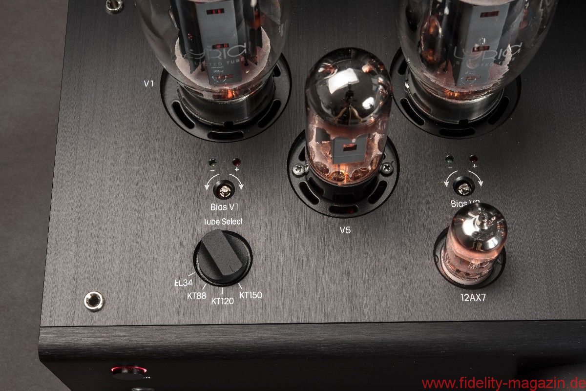 Ein paar Worte zur Röhrenbestückung: Als Eingangsröhre dient eine rauscharme12AX7, die hohe Dynamik sowie einen breiten Frequenzgang garantiert. Als Treiberröhre wählte Lyric eine 6V6 in Triodenschaltung. Diese Leistungsröhre ist im Verhältnis zu den „normalen“ Treiberröhren wesentlich stromstärker und hat eine sehr geringe Ausgangsimpedanz. Dadurch erreicht der Lyric Ti 200 eine große Stabilität und kennt keine Probleme mit Eingangskapazitäten in der nachfolgenden Leistungsverstärkung. Abgesehen davon zeichnet sich der eingesetzte Röhrentyp durch hervorragende Klangeigenschaften aus. Der Lyric Ti 200 liefert konturierte Bässe, wunderbare Mitten und feine, luftige Höhen.