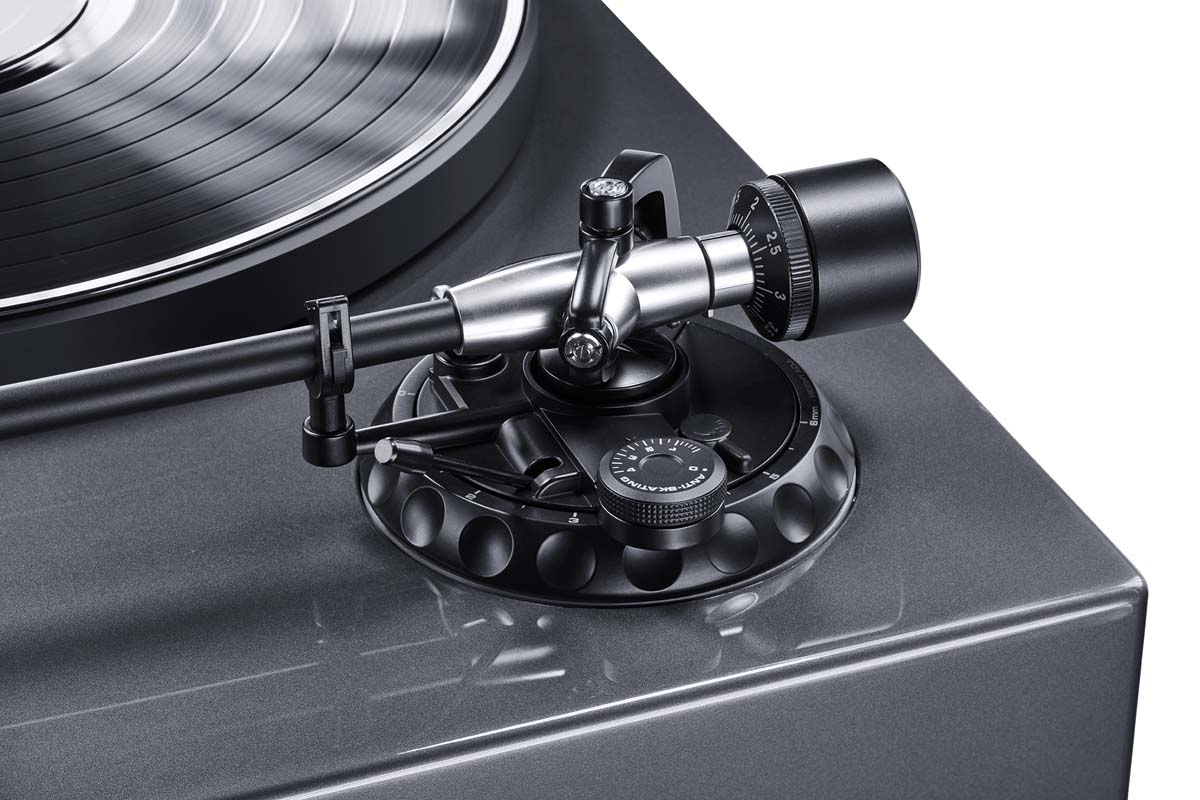 Der kardanisch gelagerte Tonarm erinnert an die schon seit Jahrzehnten, vornehmlich in japanischen Plattenspielern verwendete Form. Bei genauerer Betrachtung erkennt man jedoch das J-förmige Tonarmrohr. Helmut Thiele erläuterte mir im Gespräch, dass mit dieser Formgebung eine höhere Steifigkeit im Vergleich zu den sonst üblichen S-förmigen Tonarmen erreicht wird. Auch die Tonarmlänge von 10 Zoll – der Vorteil liegt hier in einem geringeren Spurfehlwinkel – und die Mogami-Innenverkabelung weichen vom Standard ab, der auf diesem Qualitätslevel üblich ist. Der statisch balancierte Tonarm ist durch seine Einstellmöglichkeiten mit fast allen gebräuchlichen Tonabnehmern kompatibel. Die Tonarmhöhe lässt sich bequem über einen mit Griffmulden versehenen Ring justieren. Mithilfe der Millimeterskala sind Einstellungen leicht reproduzierbar, mit einem kleinen Hebel wird die Tonarmhöhe verriegelt. Die Headshell mit Bajonett-Anschluss ist einfach zu montieren und macht einen Tonabnehmerwechsel unkompliziert.
