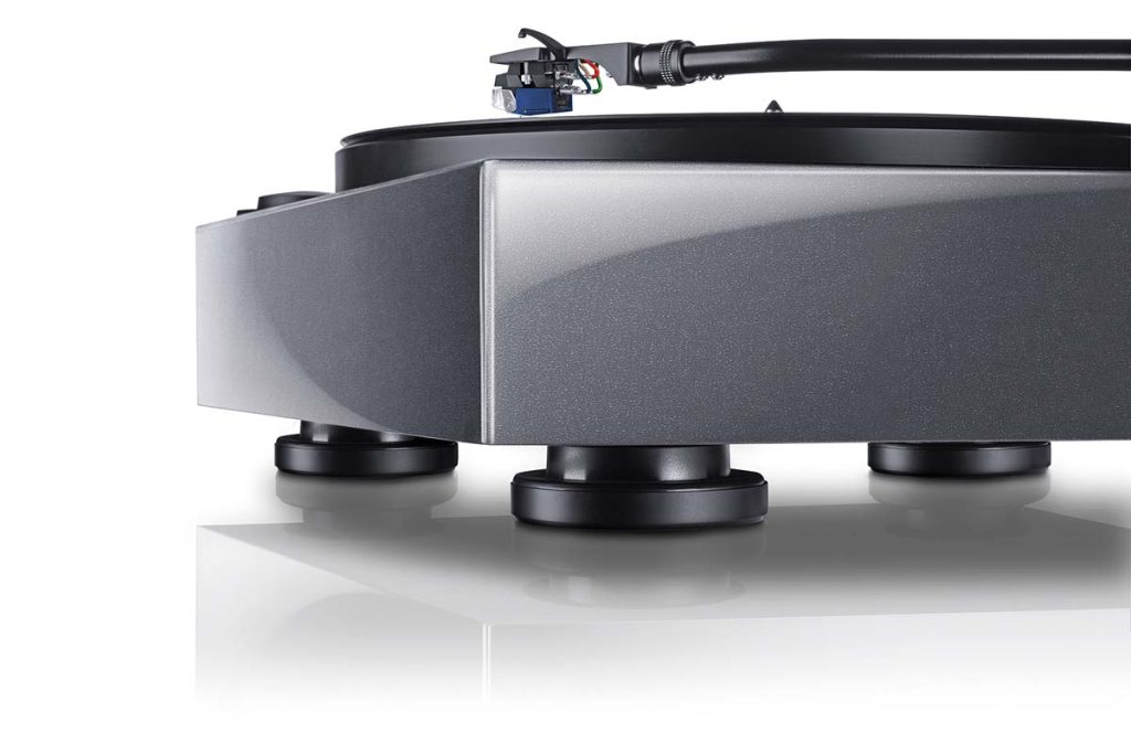 In der klaren Formensprache und praxistauglichen Bedienbarkeit erkennt man die Handschrift von Helmut Thiele. Mit ausführlichen Testreihen an eigens entwickelten Apparaturen hat er das Resonanzverhalten optimiert. Gerade die Auswahl der Entkopplungsfüße – sie sind mit einer Kombination aus Feder und Elastomer-Einlagen versehen – war zeitaufwendig, so der Designer. Doch die Maßnahmen waren offensichtlich von Erfolg gekrönt: Das Laufwerk zeigte sich im Betrieb von äußeren Einflüssen vollkommen unbeeindruckt. Der Plattenteller aus präzise gedrehtem Polyoxymethylen wird von einem Direktantrieb mit quarzgesteuerter Geschwindigkeitskontrolle in Bewegung versetzt. Der Trafo des Netzteils ist schwingend aufgehängt und mit Mu-Metall abgeschirmt. Diese Maßnahmen verhelfen dem Dreher zu einem absolut ruhigen Lauf. Die Geschwindigkeit wird perfekt gehalten, wie auch meine Prüfung mittels Stroboskopscheibe bestätigte.