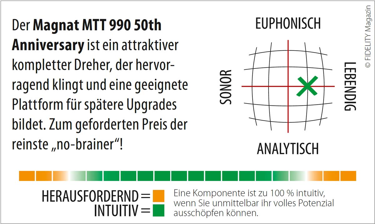 Der Magnat MTT 990 50th Anniversary ist ein attraktiver kompletter Dreher, der hervorragend klingt und eine geeignete Plattform für spätere Upgrades bildet. Zum geforderten Preis der reinste „no-brainer“!