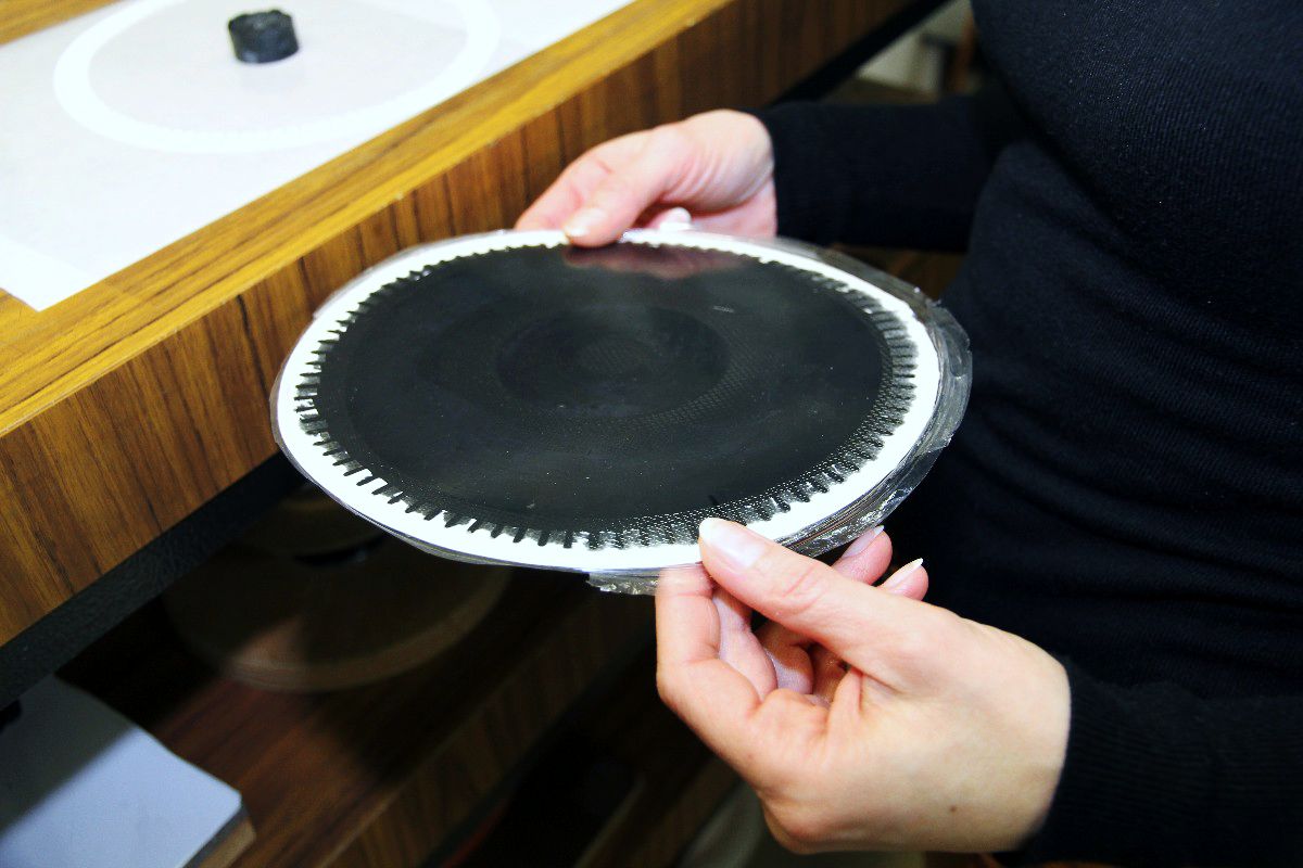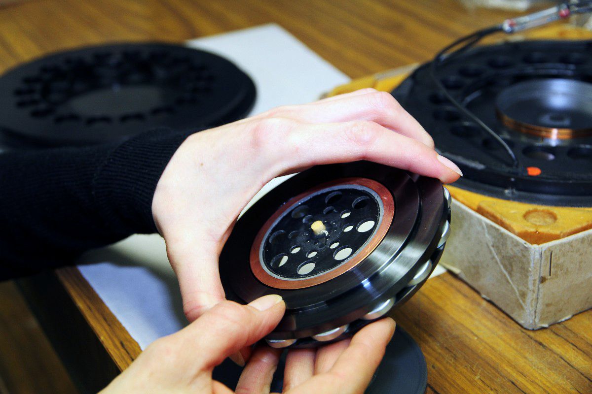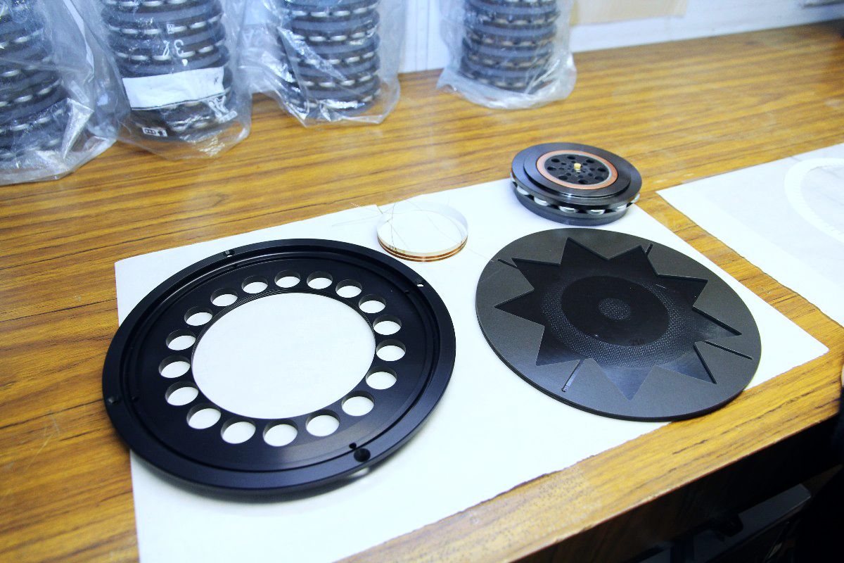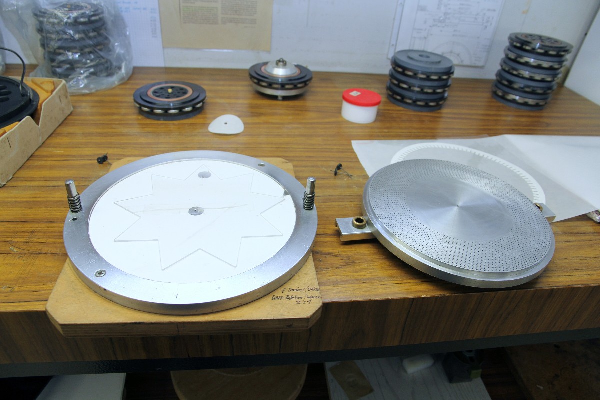 Im linken Teil des Raumes kümmert sich Petra Schwamm um die Herstellung der Biegewellenmembran sowie um den Magnetantrieb des MSW. Zu ihrem Hoheitsgebiet gehört zum Beispiel eine übermannshohe Vier-Säulen-Presse. In Form gepresst wird hier heute allerdings gar nichts. Denn die Präzisionsmaschine mit der Vierfachhydraulik, wie sie früher auch Schallplattenpresswerke benutzten, bekommt gerade selbst einen Service verpasst, um auch weiterhin minimale Toleranzen – „Wir sprechen hier von 1?m“, also einem tausendstel Millimeter! – einhalten zu können. Daher sind heute auch nicht die beiden Wärmeöfen gegenüber in Betrieb; normalerweise werden dort Schwingspulen verbacken oder Werkstoffe vorgewärmt.