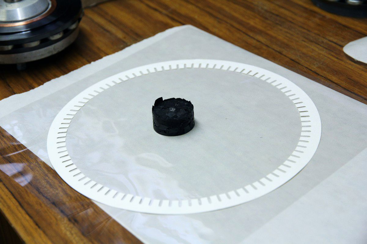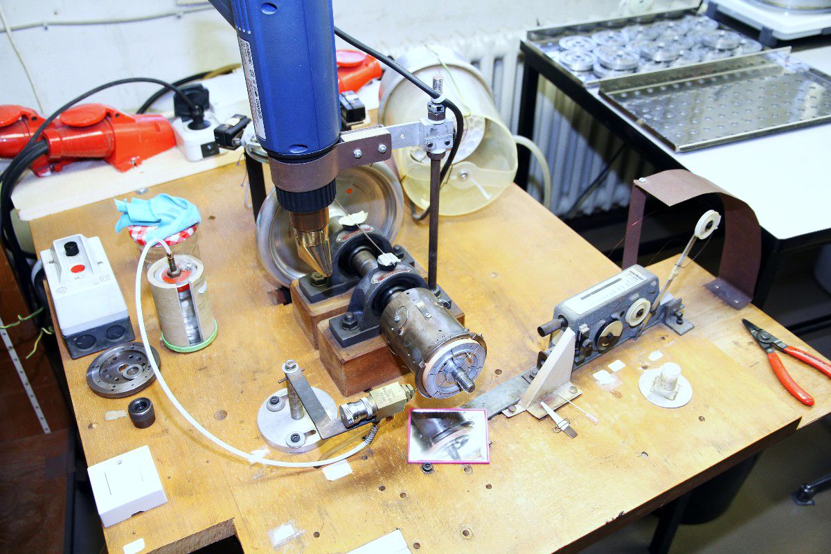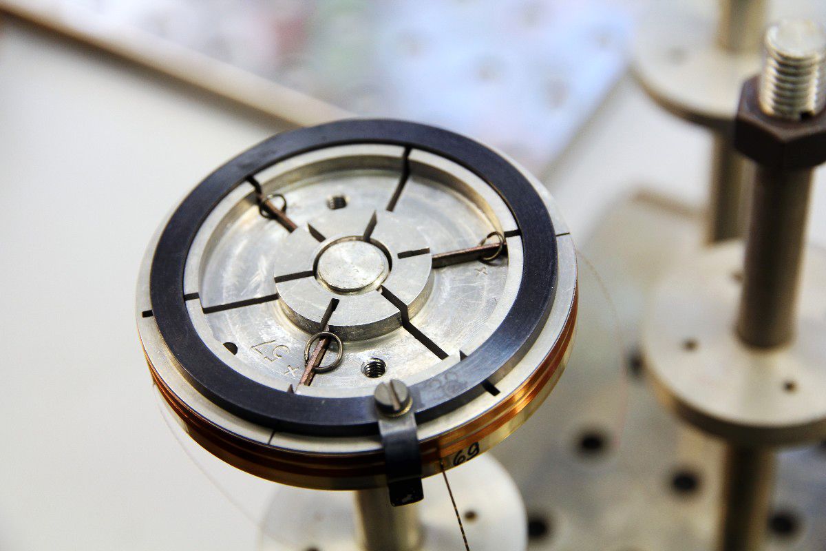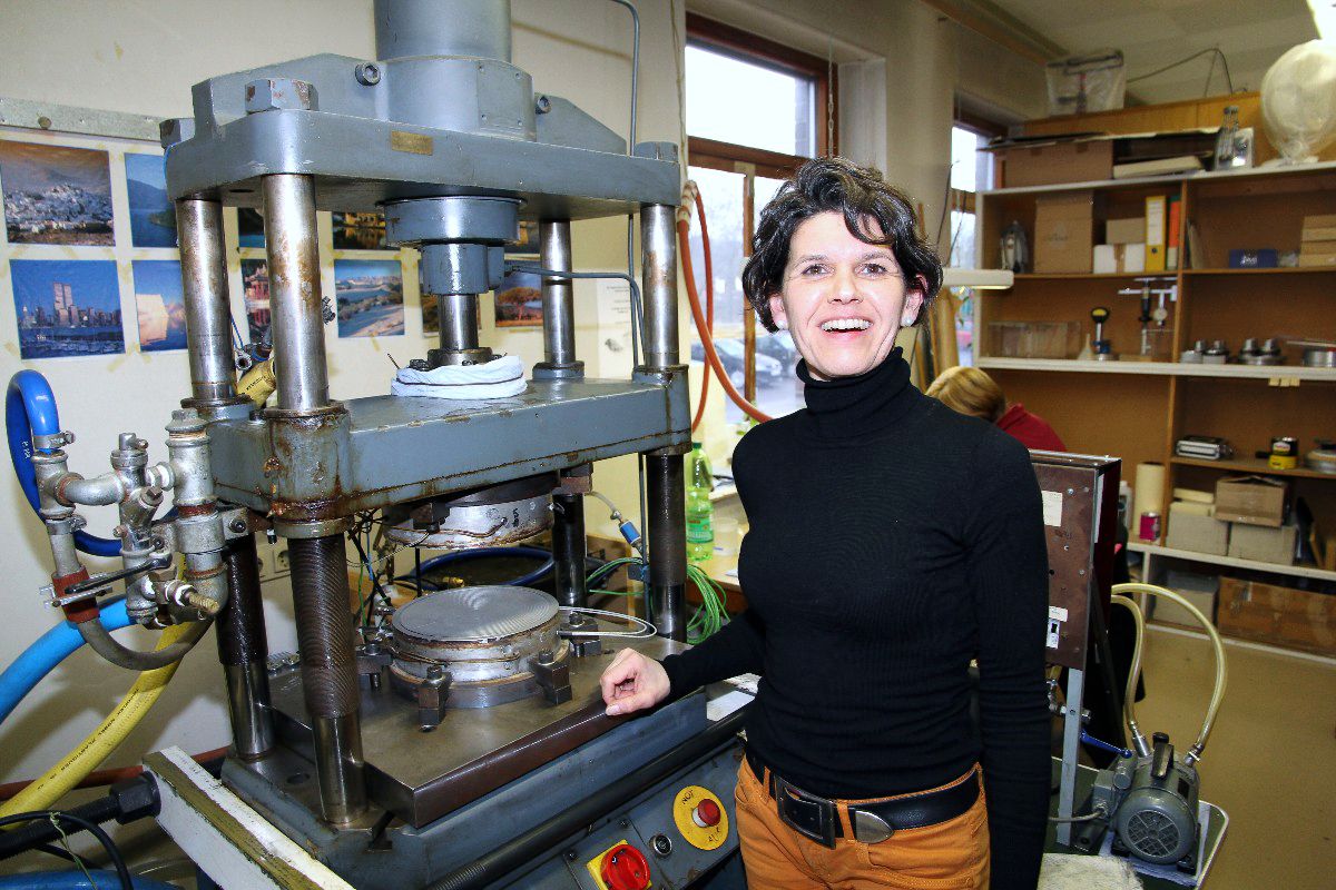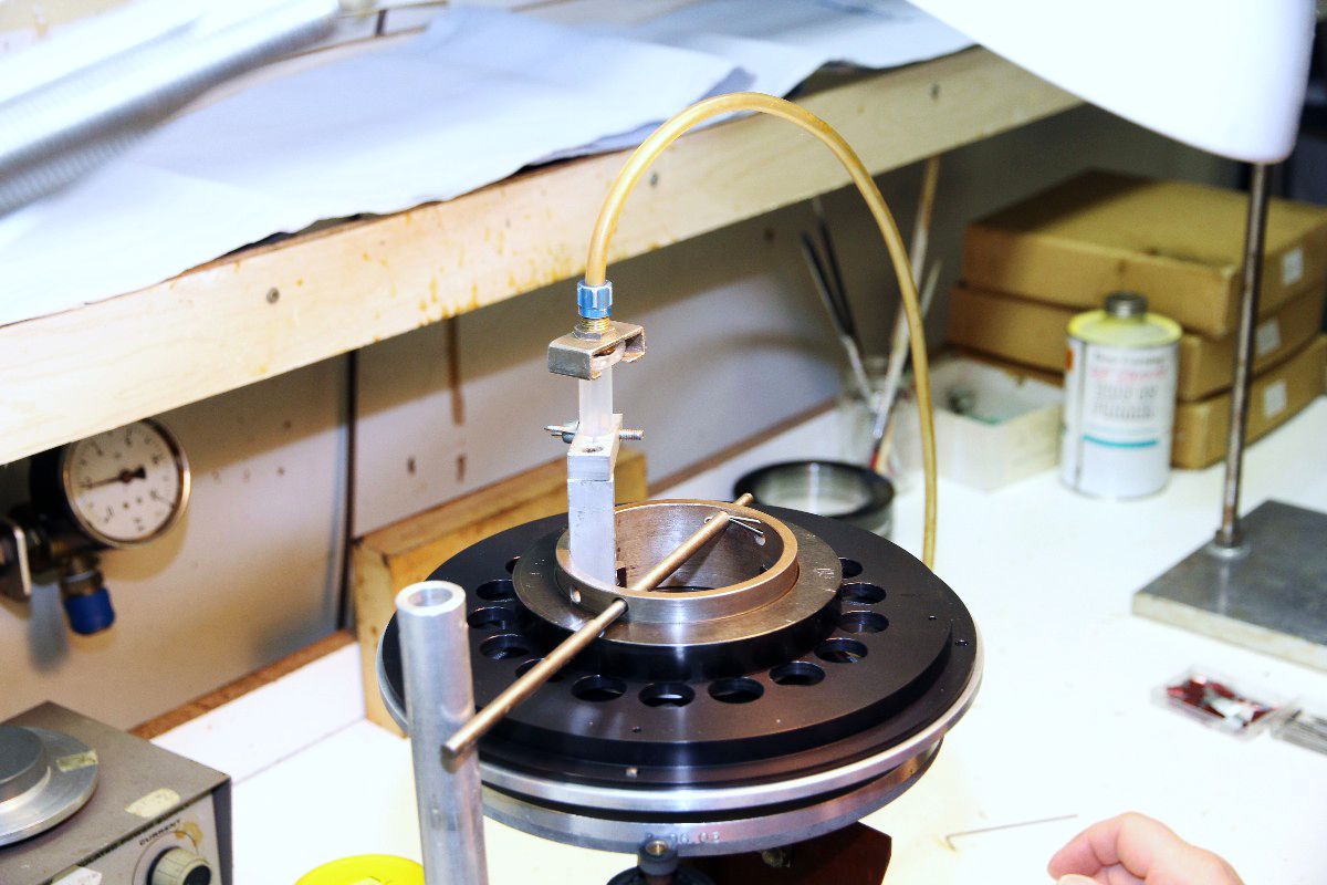 Im linken Teil des Raumes kümmert sich Petra Schwamm um die Herstellung der Biegewellenmembran sowie um den Magnetantrieb des MSW. Zu ihrem Hoheitsgebiet gehört zum Beispiel eine übermannshohe Vier-Säulen-Presse. In Form gepresst wird hier heute allerdings gar nichts. Denn die Präzisionsmaschine mit der Vierfachhydraulik, wie sie früher auch Schallplattenpresswerke benutzten, bekommt gerade selbst einen Service verpasst, um auch weiterhin minimale Toleranzen – „Wir sprechen hier von 1?m“, also einem tausendstel Millimeter! – einhalten zu können. Daher sind heute auch nicht die beiden Wärmeöfen gegenüber in Betrieb; normalerweise werden dort Schwingspulen verbacken oder Werkstoffe vorgewärmt.