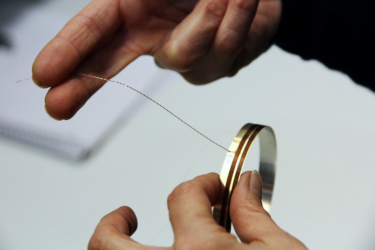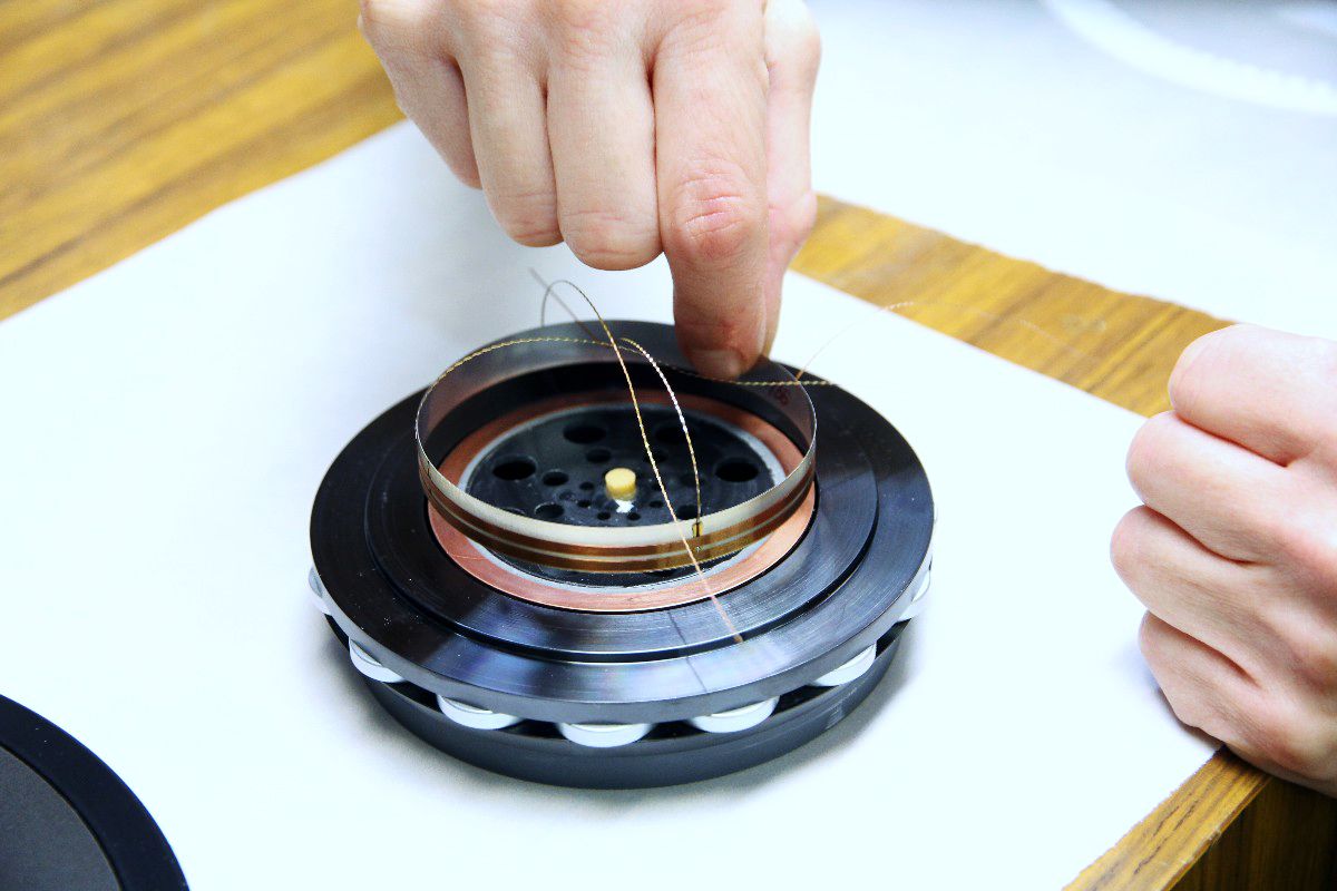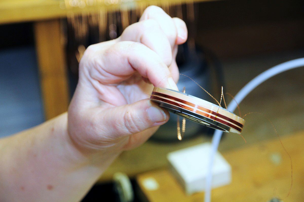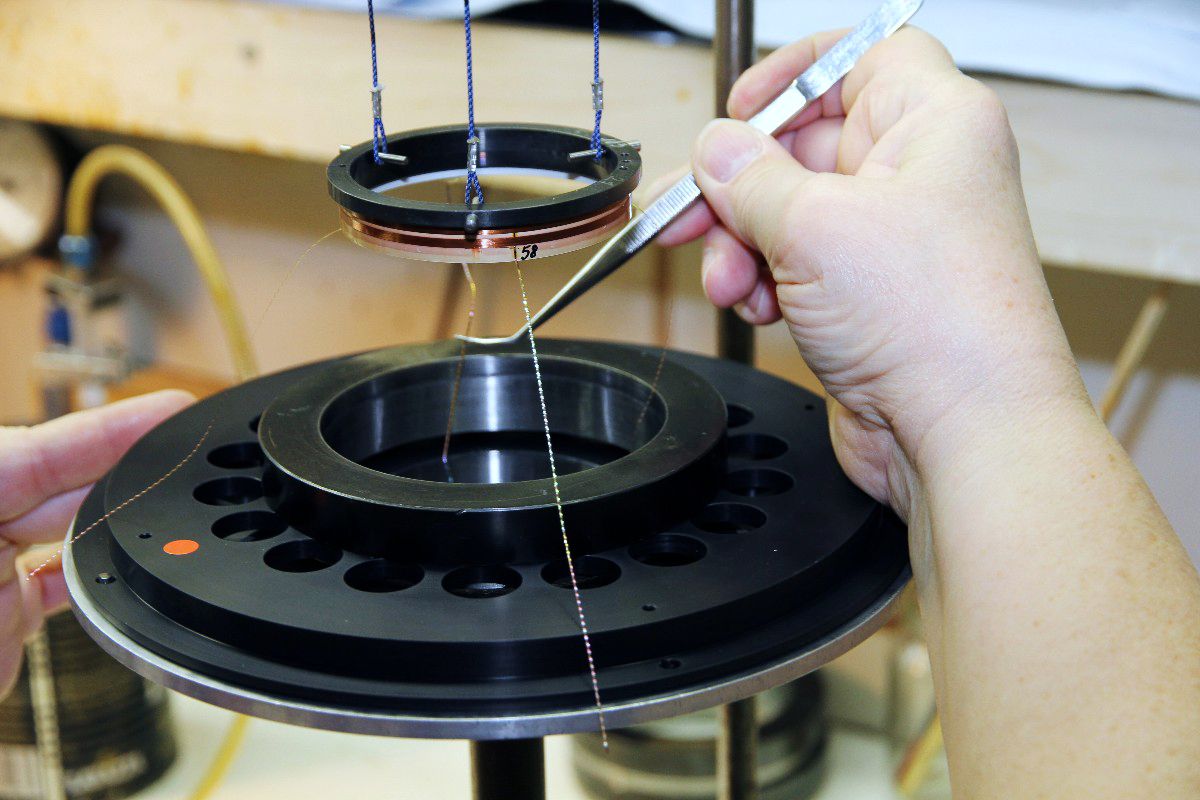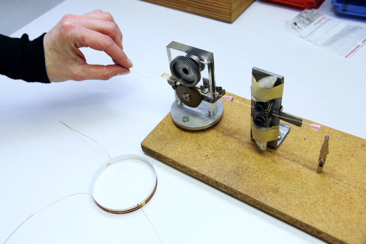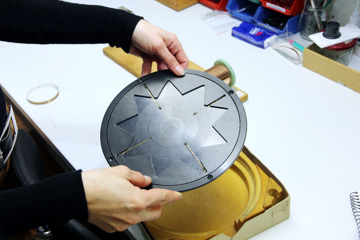 Martin Schuldt wird jetzt nebenan in der hauseigenen Servicewerkstatt einen Monitor auf den neuesten Stand bringen. Daniela Manger führt mich über den Flur ins Herzstück der Manufaktur, den Produktionsraum, wo die einzigartige Erfindung des J. W. Manger in akribischer Handarbeit immer wieder aufs Neue entsteht. Warm ist’s hier und irgendwie auf Anhieb gemütlich. Die Szenerie hat den Charme eines Laboratoriums, in dem seit Jahrzehnten in aller Ruhe konstant gearbeitet wird. Im langgestreckten Raum von gut 80 Quadratmetern ist kein einziger Computer, kein LCD-Display oder Ähnliches zu sehen. Und statt Radiogedudel sind die Betriebsgeräusche alter, gut gepflegter Maschinen zu hören – und ein paar Worte Berlinerisch. Das ist die Stimme von Sieglinde Rauch, die im rechten Teil des Raumes ihrer feinmechanischen Tätigkeit nachgeht. Die gelernte „Mechanikerin für Datenverarbeitungs- und Informationsmaschinen“ beherrscht ihren Maschinenpark mit souveräner Gewandtheit und absolut sicheren Handgriffen. „Tja, jelernt is’ jelernt.“ Diese Feststellung weiß auch Daniela Manger für sich zu beanspruchen – und schon macht sich die Chefin daran, an der Wickelmaschine den Aufbau der speziellen Manger-Schwingspule zu demonstrieren. Mit einem fröhlichen „Hier saß ich schon als Twen und durfte aushelfen“ wickelt sie einen dünnen Streifen Aluminium um einen fixierten Wickeldorn, montiert Anschlussstücke und Drahtlitze, Klebstoff und Lack, hantiert mit Stahlschere und Windungssteuerung. Am Nebentisch präsentiert sie eine mobile Apparatur, die einzig dafür gebaut wurde, flache Kupferlitze mit einer exakt definierten Wellenstruktur zu prägen. Vier dieser Stücke werden später auf einer Biegewellenmembran aufliegen, ohne deren Bewegungen zu beeinflussen. Auf einer weiteren Werkbank dreht sich langsam der markante Korb eines MSW. Mithilfe einer fixierten Kanüle trägt Frau Rauch eine penibel bemessene Menge Spezialklebstoff exakt kreisförmig auf die Rückseite der Membran auf. Direkt neben diesem Ensemble wartet schon eine Montageeinrichtung, die mich kurz an ein Lichtobjekt erinnert, auf manuelle Bedienung. Hier werden Schwingspule und Membran miteinander verklebt. Und weil das alles mit äußerst engen Toleranzen geschehen muss, sind Ruhe und Präzision auch hier „oberstes Jebot“.