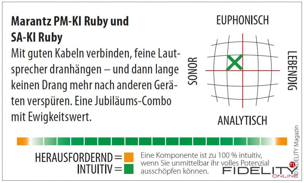 Dass der wie sein großes Gegenstück PM 10 in Schaltverstärker-Technik aufgebaute Ruby-Vollverstärker ein paar Watt weniger Leistung an die bei Marantz allmählich zum Standard in der Premium-Klasse werdenden Edel-Lautsprecherklemmen aus Kupfer liefert, werden wohl auch nur jene merken, die daheim gerne Schwermetall-Hörsessions mit Trommelfell sprengenden Original-Lautstärkepegeln veranstalten und auch die Nachbarn im nächsten Dorf nicht im Unklaren über ihren Musikgeschmack lassen möchten.
