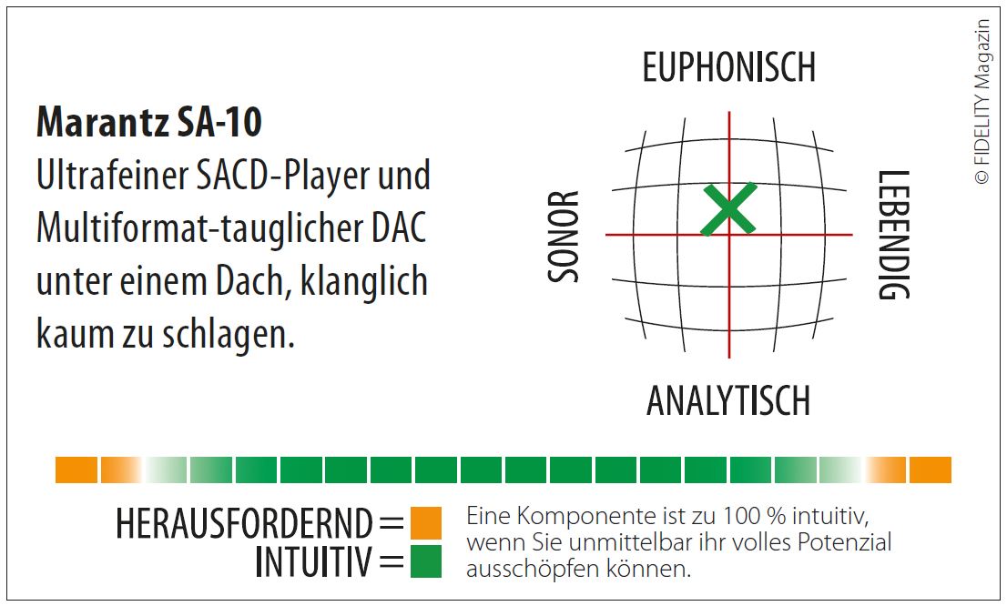 Festzuhalten bleibt, dass der SA-10 bestens als „Dolmetscher“ taugt und durch seine Upsampling-Technik auch betagtere Digitalquellen ebenso wie gestreamte Musikinhalte auf ein zeitgemäßes Klangniveau zu heben versteht. Wobei die Zulieferung durch ältere CD-Player schon unter Nostalgie einzuordnen ist, denn aufgrund der Solidität seines neu entwickelten Laufwerks toppt der Marantz-Player die meisten separaten Laufwerkslösungen deutlich. Wer diesen Mehrfachkönner besitzt, hat auf dem Musiksektor für ganz lange Zeit keinen Erneuerungsbedarf mehr.