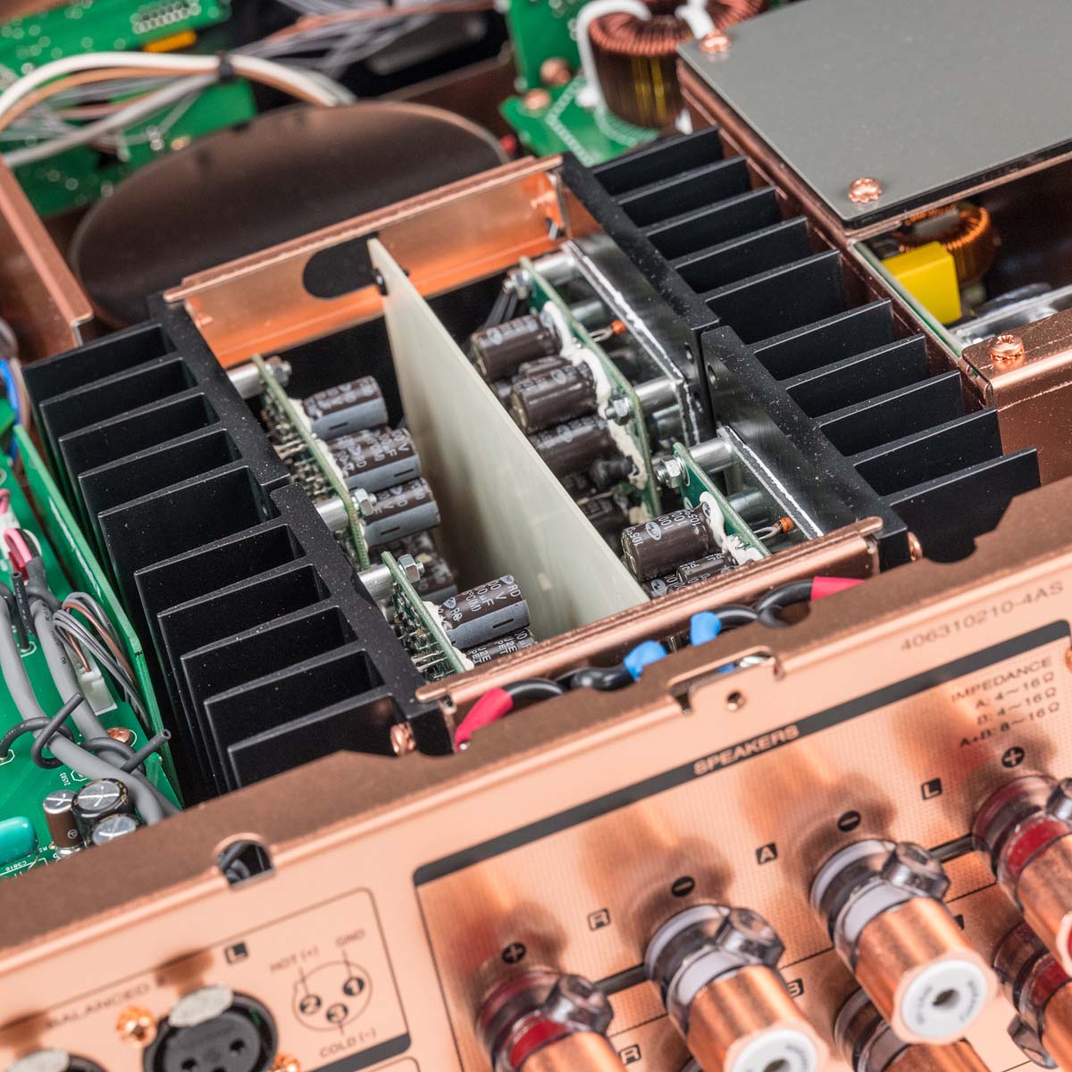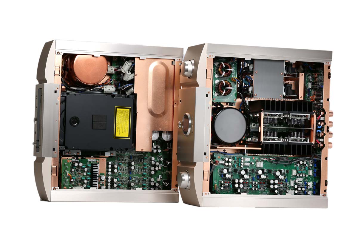 Verkörpert der SA-10 schon einen gewaltigen Innovationssprung, so ist der Vollverstärker PM-10 geeignet, auf Jahre hinaus heißes Diskussionsthema zu werden. Setzt Marantz doch hier erstmals in der Premiumklasse auf ein Class-D-Konzept, das vom Eingang bis zum Lautsprecher vollsymmetrisch aufgebaut ist – „für massefreies Signalmanagement“, so Rainer Finck. Mit den digitalen „Kraftwaffeln“ geht hohe Leistung einher: 200 Watt pro Kanal bei 8 Ohm und 400 Watt bei 4 Ohm gibt Marantz an und vergisst nicht, auf die hohe Stromstabilität des Konzeptes hinzuweisen, bei dem je zwei gebrückte Verstärkerzüge für einen Stereokanal zuständig sind. Damit sollen sich so gut wie alle Lautsprecher des Weltmarktes adäquat antreiben lassen – einschließlich impedanzkritischer Monster wie der alten Infinity Kappa 9. In der FIDELITY-Redaktion konnten wir das zwar mangels Vintage-Kappa nicht ausprobieren, verbandelten SA-10 und PM-10 aber nicht nur mit verschiedenen anderen Playern und Verstärkern, sondern auch mit charakterlich grundverschiedenen Schallwandlern, vom MartinLogan-Elektrostaten bis zur Wilson Audio Yvette.