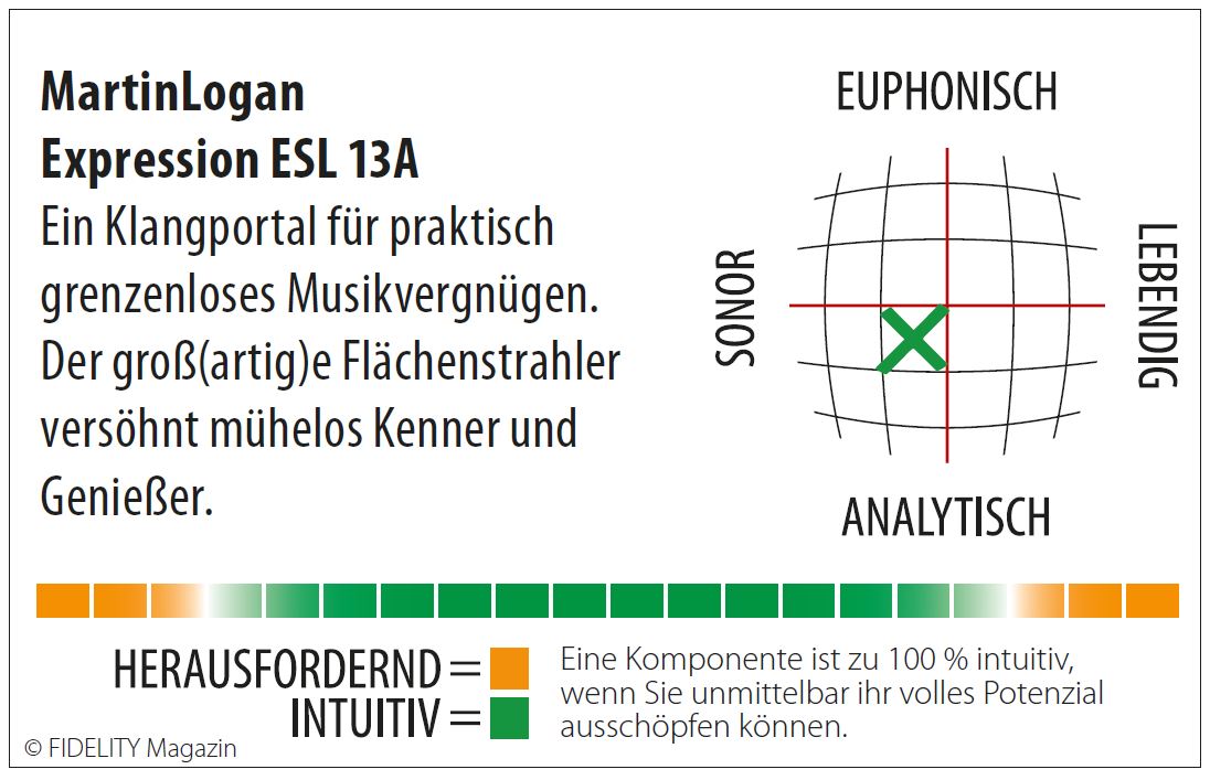 Die Expression ESL 13A mag vielleicht nicht das allerletzte Wort in Sachen Präzision, Perfektion oder schiere Bassgewalt sein, schließlich gibt es im Hause MartinLogan noch ein paar größere Geschwister, sie kommt aber dem gedachten Ideal dennoch schon so nah, dass ehrlicherweise keine Wünsche übrig bleiben. Mit der MartinLogan Expression ESL 13A kann man extrem lange stressfrei und beglückend Musik hören. Denn sie stößt die Tür ins Klangparadies ganz locker ganz weit auf – und plötzlich spielt die Welt da draußen keine Rolle mehr.