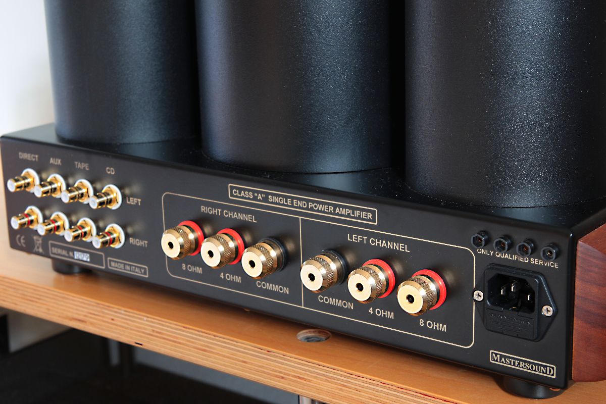 Der Mastersound 300B PSE ist ein italienischer Röhren-Vollverstärker von unaufdringlicher Erscheinung, geringer Leistung und schnickschnackloser Technik. Was drinsteckt, verrät die Modellbezeichnung: Die Endverstärkung obliegt Trioden des Typs 300B, derer pro Kanal zum Zwecke der Leistungserhöhung jeweils zwei parallel arbeiten (das P im Namen), und zwar in Eintakt- Betrieb, englisch „single ended“ (das SE im Namen). Es handelt sich um einen reinen Hochpegel-Vollverstärker, dessen einziger, dafür aber hochwillkommener Luxus im Vorhandensein einer Funkfernbedienung besteht. Wie die meisten italienischen HiFi-Manufakturen huldigt auch Mastersound durch Einsatz von Massivholz dem nationalen Instrumentenbauer- Erbe – hier bestehen die Seitenwangen des Verstärkers und der Fernbedienungsgeber aus Walnussholz.
