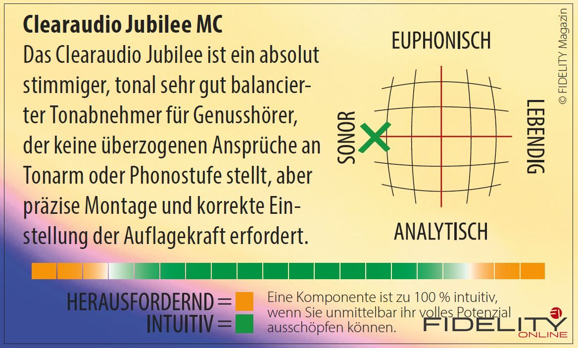 Eine Eier legende Wollmilchsau also? In gewisser Hinsicht schon. Nun sagt man Alleskönnern ja gerne nach, dass die Talente auf vielen Gebieten mit dem Problem erkauft werden, im Gegenzug nichts hundertprozentig zu können. Solche aus der Vielseitigkeit geborenen Schwächen wird man beim Jubilee MC jedoch vergebens suchen. Allerdings ist der Panzerholz-Preziose auch jede Vordergründigkeit, jeder Effekt um des Effekts willen fremd. Wer also einen Tonabnehmer mit vorlaut blitzenden Höhen oder einem weit überzogenen Bassbereich sucht, um High-End-Novizen zu beeindrucken oder gewisse Schwächen der eigenen Anlage auszugleichen, sollte um das Jubiläums-MC lieber einen Bogen machen. Das Clearaudio Jubilee MC ist grundehrlich und schnurgerade, ohne auch nur eine Zehntelsekunde langweilig zu wirken.
