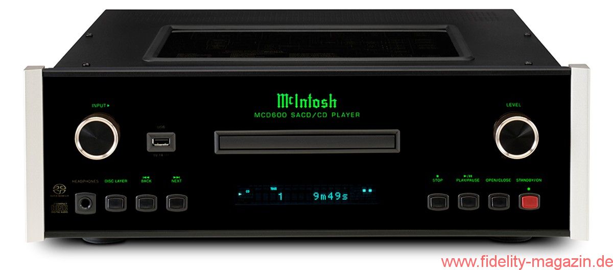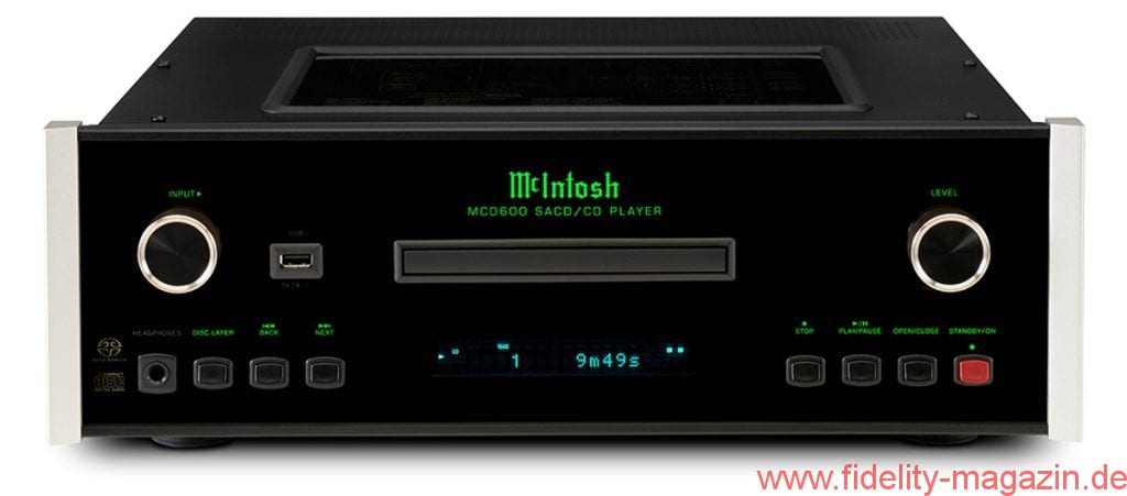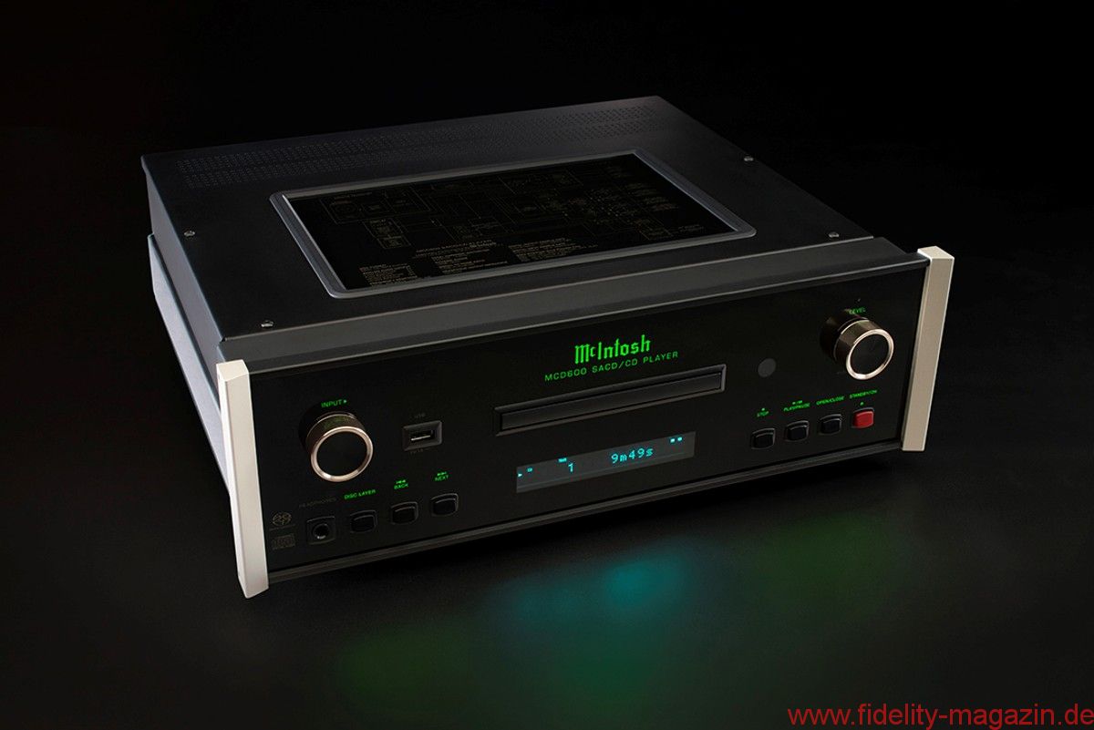 The MCD600 is wrapped in classic McIntosh styling with a polished stainless steel chassis, black glass front panel, illuminated logo, knobs and aluminum end caps. The front panel features new direct LED backlighting for improved appearance, while the top has a new screen printed glass panel listing performance specs and a block diagram.