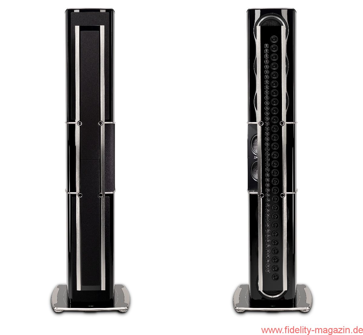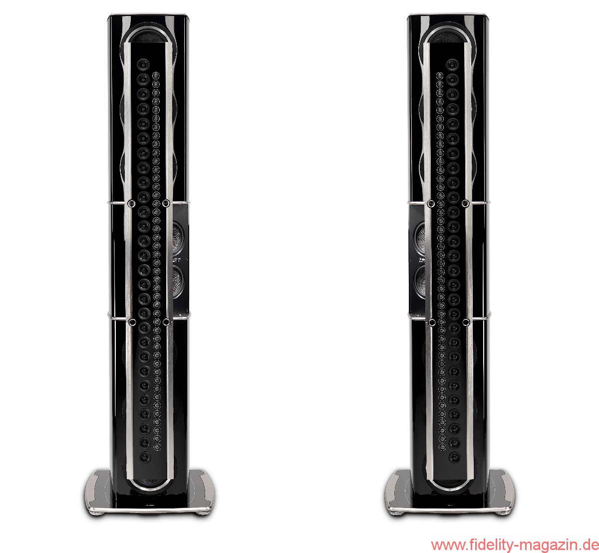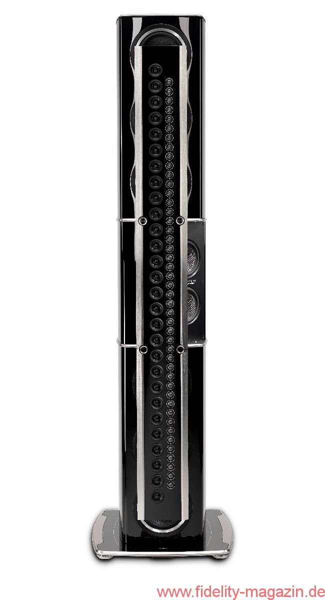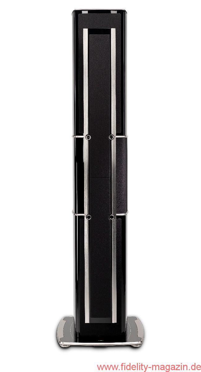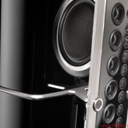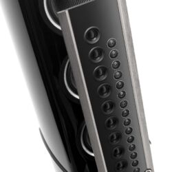 Visually, the XRT2.1K is as striking as it sounds. The reinforced bass cabinet is a combination of brushed and black aluminum and is finished with 7 layers of high gloss piano black paint. The line array mimics the timeless McIntosh front panel appearance with a glossy black center section and 2 silver aluminum end caps. It is suspended from the front of the bass cabinet via steel spiders that are capped with covers that look like a McIntosh control knob. The removable speaker grilles are attached via magnets and feature black knit cloth with high gloss trim.