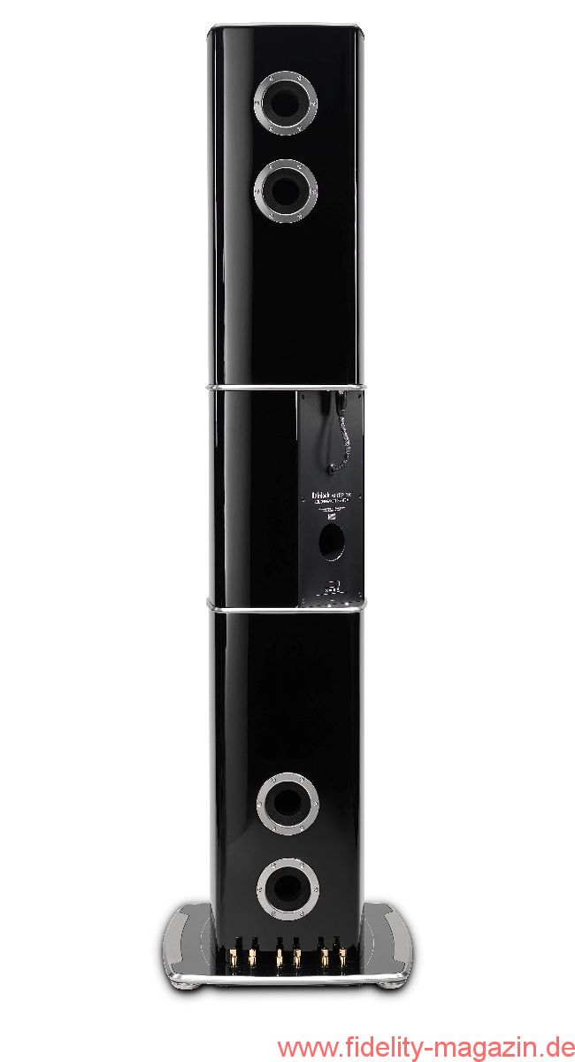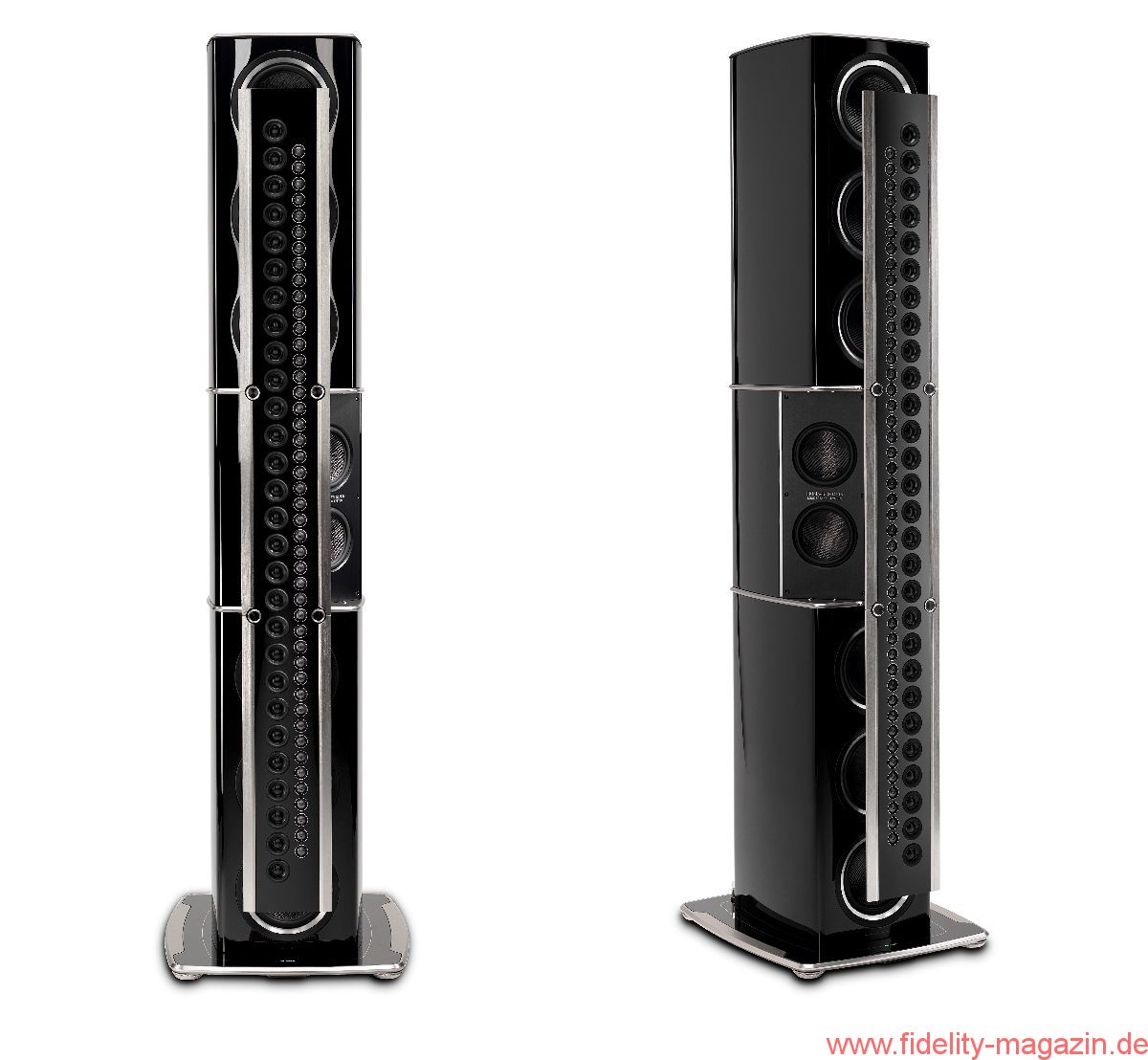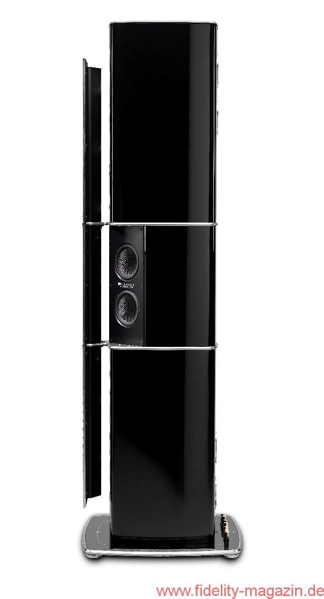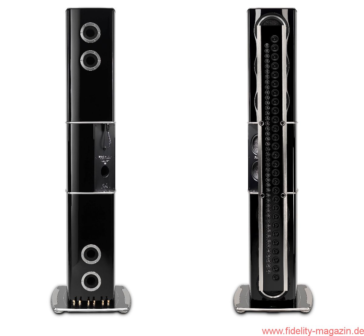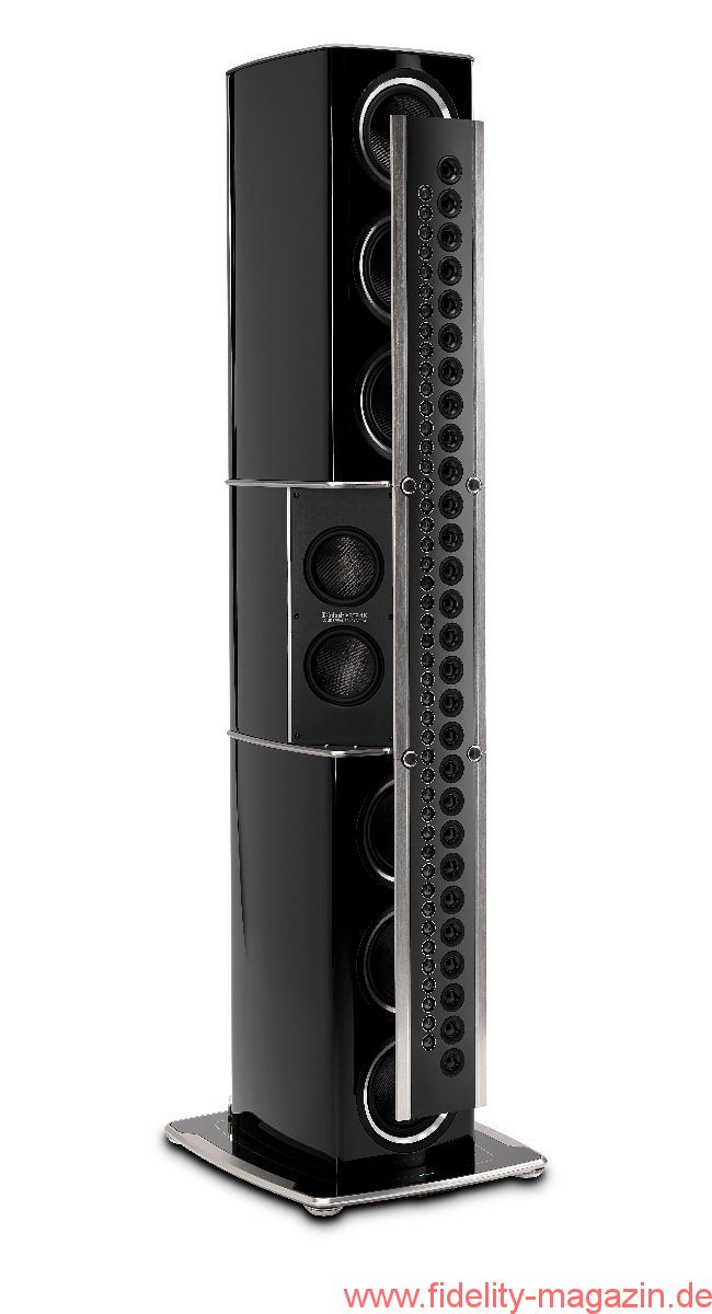 Visually, the XRT2.1K is as striking as it sounds. The reinforced bass cabinet is a combination of brushed and black aluminum and is finished with 7 layers of high gloss piano black paint. The line array mimics the timeless McIntosh front panel appearance with a glossy black center section and 2 silver aluminum end caps. It is suspended from the front of the bass cabinet via steel spiders that are capped with covers that look like a McIntosh control knob. The removable speaker grilles are attached via magnets and feature black knit cloth with high gloss trim.
