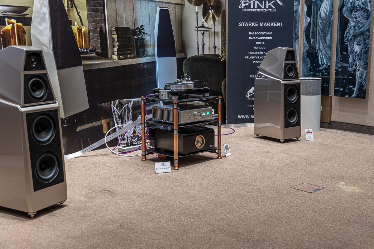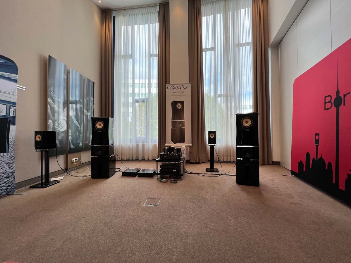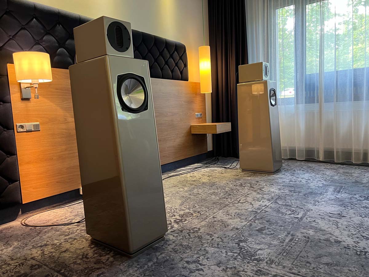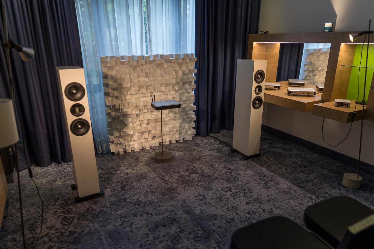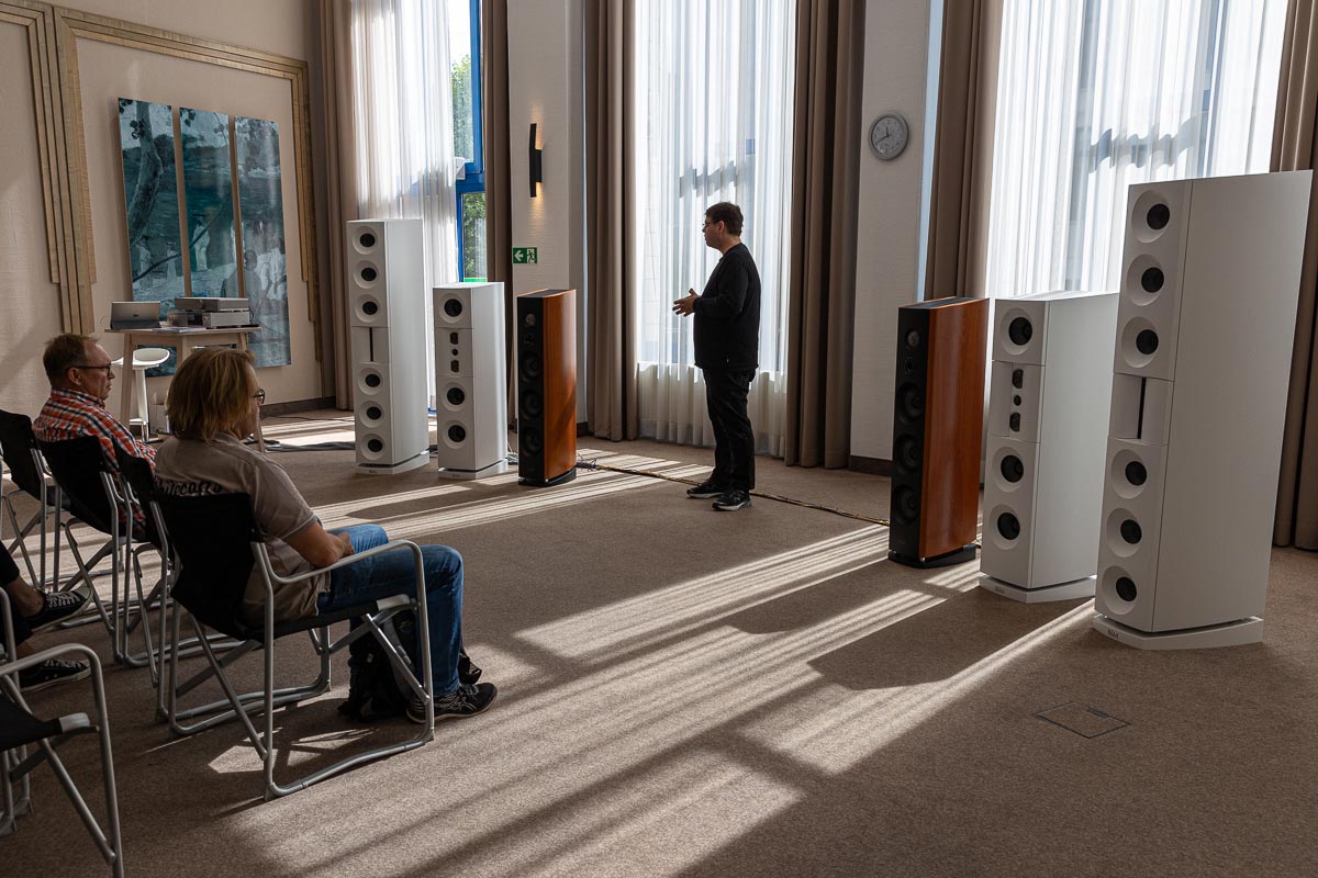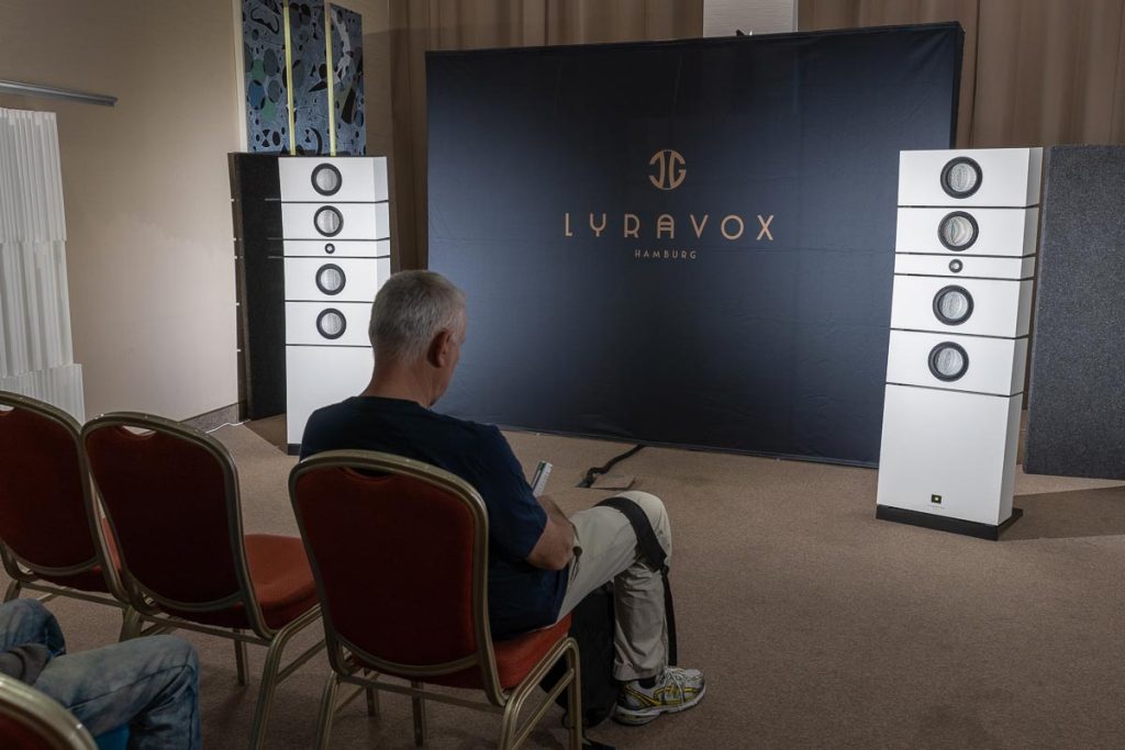 Mit separaten Gehäusen und DSP-basierten Weichen setzt Lyravox wie kaum ein anderer Aussteller auf Kontrolle in allen Belangen. Trotz der schon sehr guten Ausgangslage ließ man es sich aber dennoch nicht nehmen, die Stärken des vollaktiven Hünen Karl 2 inklusive Raumanpassung auszuspielen: Penibel auf die Raumakustik ausgemessen, bot mir der Turm eine herausragend durchhörbare Performance dar.