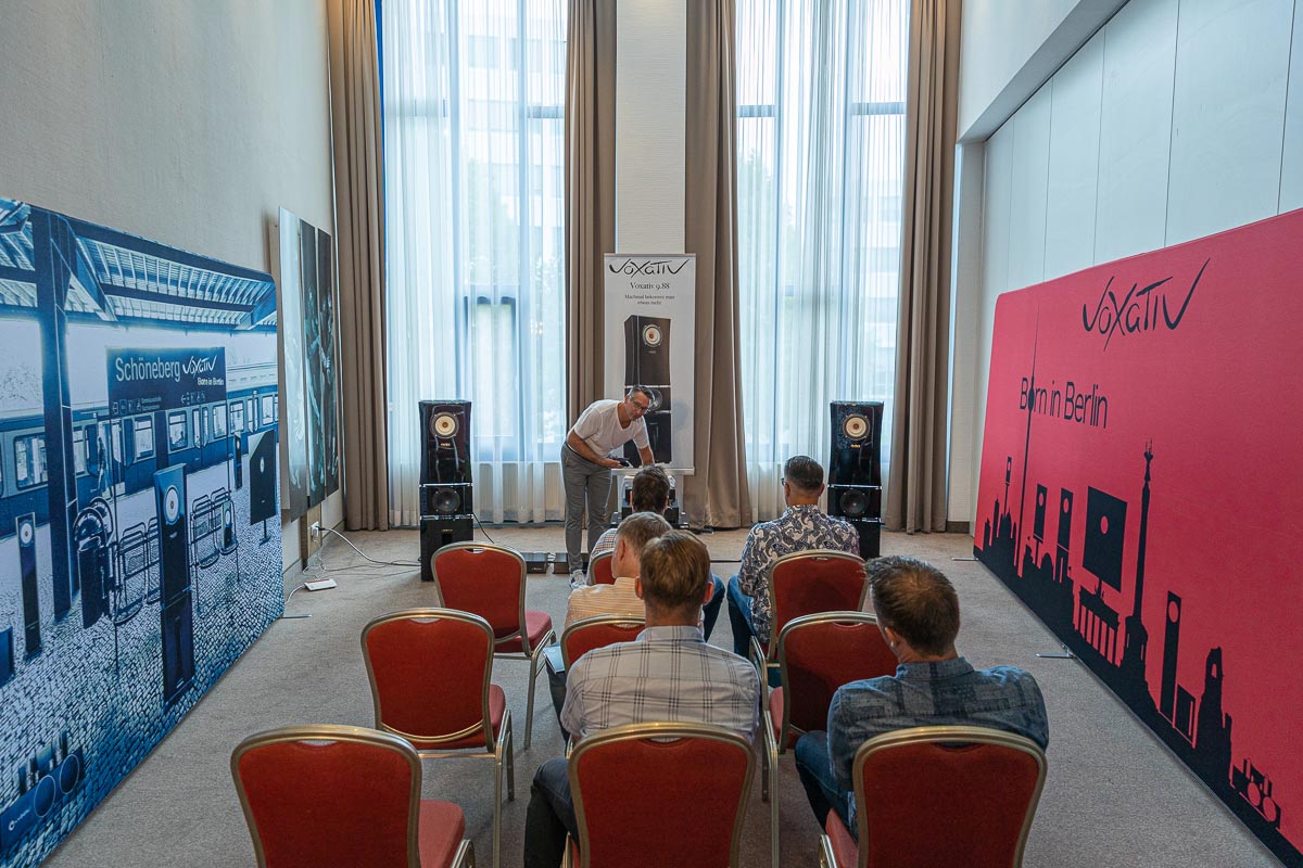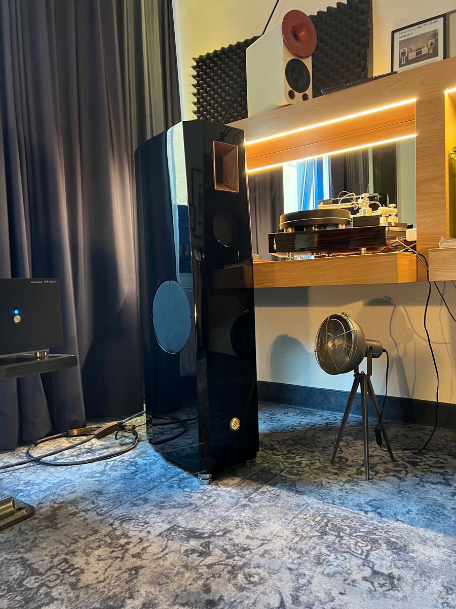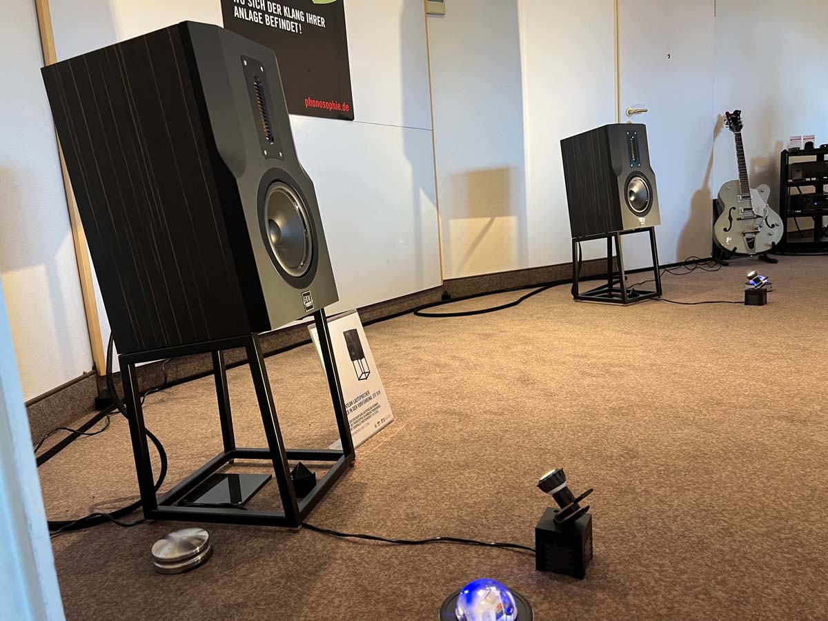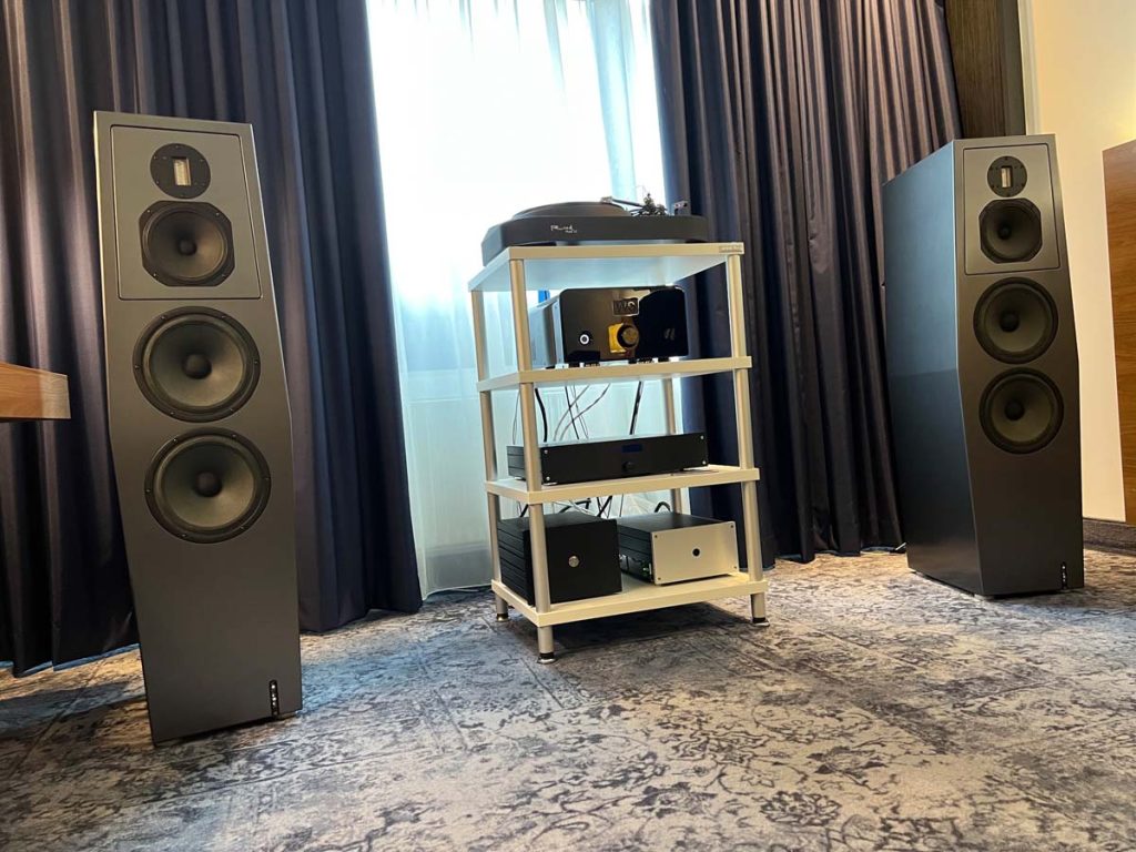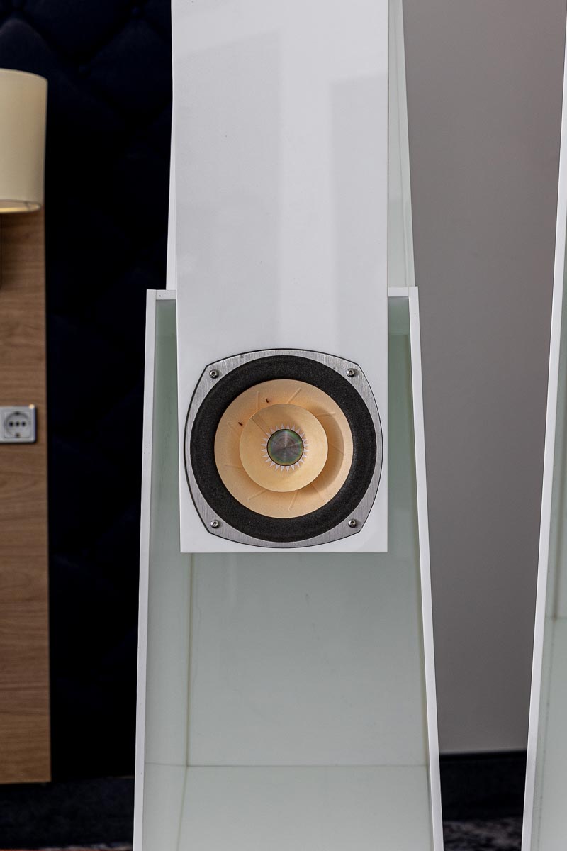 Mit separaten Gehäusen und DSP-basierten Weichen setzt Lyravox wie kaum ein anderer Aussteller auf Kontrolle in allen Belangen. Trotz der schon sehr guten Ausgangslage ließ man es sich aber dennoch nicht nehmen, die Stärken des vollaktiven Hünen Karl 2 inklusive Raumanpassung auszuspielen: Penibel auf die Raumakustik ausgemessen, bot mir der Turm eine herausragend durchhörbare Performance dar.