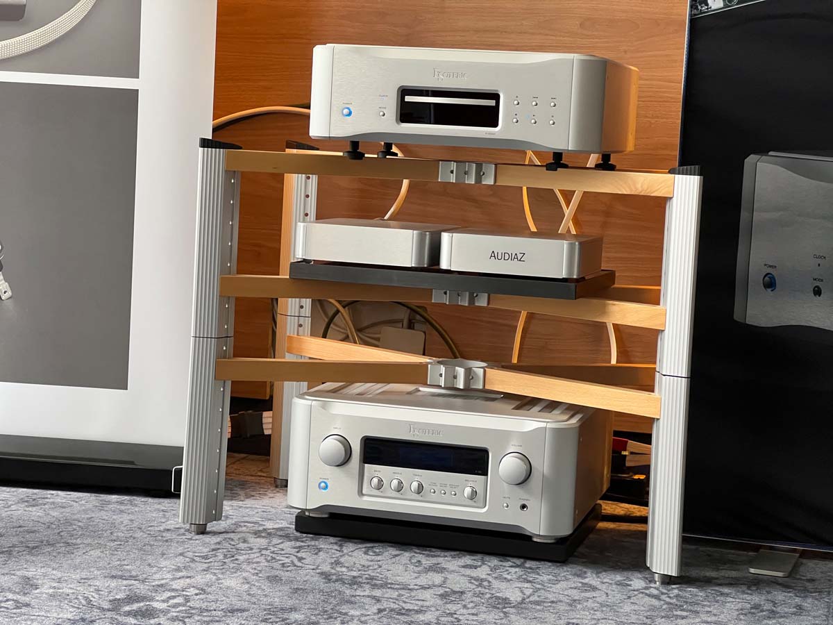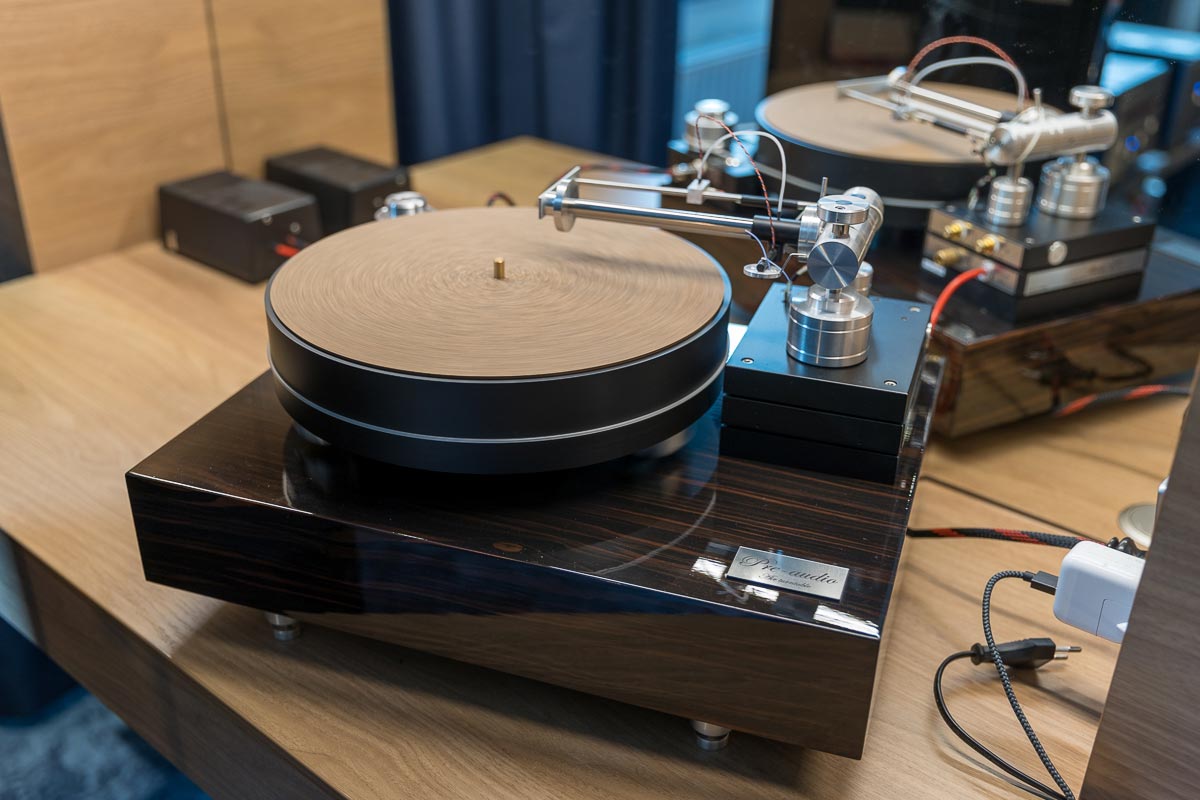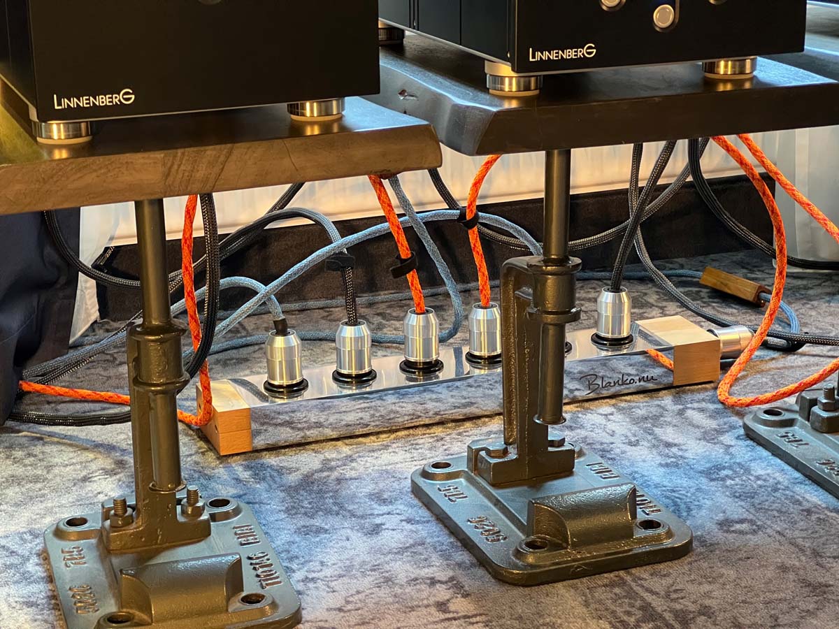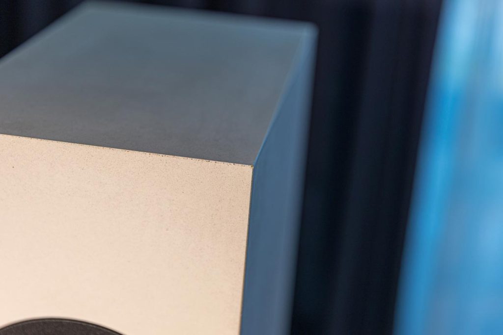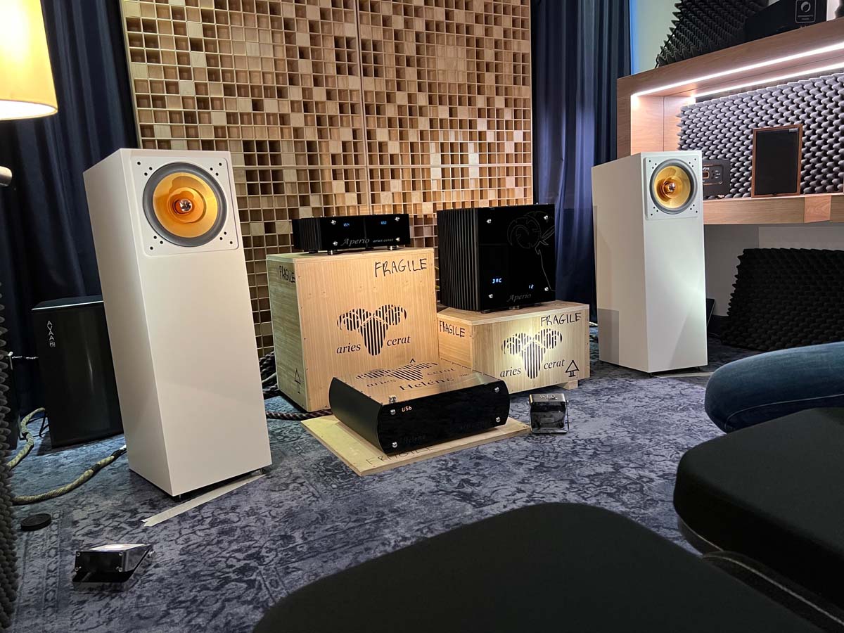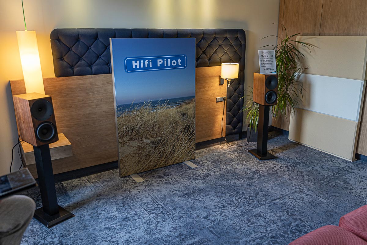 Im zweiten Obergeschoss führt mir Buchardt seine aktive Kompakte A500 vor, die bei einem Preis von deutlich unter 4000 Euro als Komplettsystem gelten darf, das sich ganz simpel per Smartphone ansteuern lässt. Verblüfft verweile ich auch im AcouLab-Raum: Mit DSP-Zauberei und einer Sensorregelung für den Tiefmitteltöner kitzelt der Newcomer verzerrungsfreie 25 Hertz aus seiner Kompakten Première S. Und schließlich klärt sich für mich bei Houchmand das Mysterium der massiven Marmorplatte: Zwei solcher Platten bilden hier das exakt auf die Zimmerbreite maßgeschneiderte Fundament, auf dem sich das System aus Streamer und Aktivlausprechern unbehelligt von jeglichen Bodenvibrationen präsentieren kann.