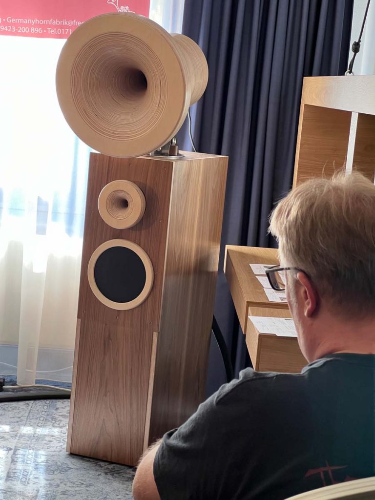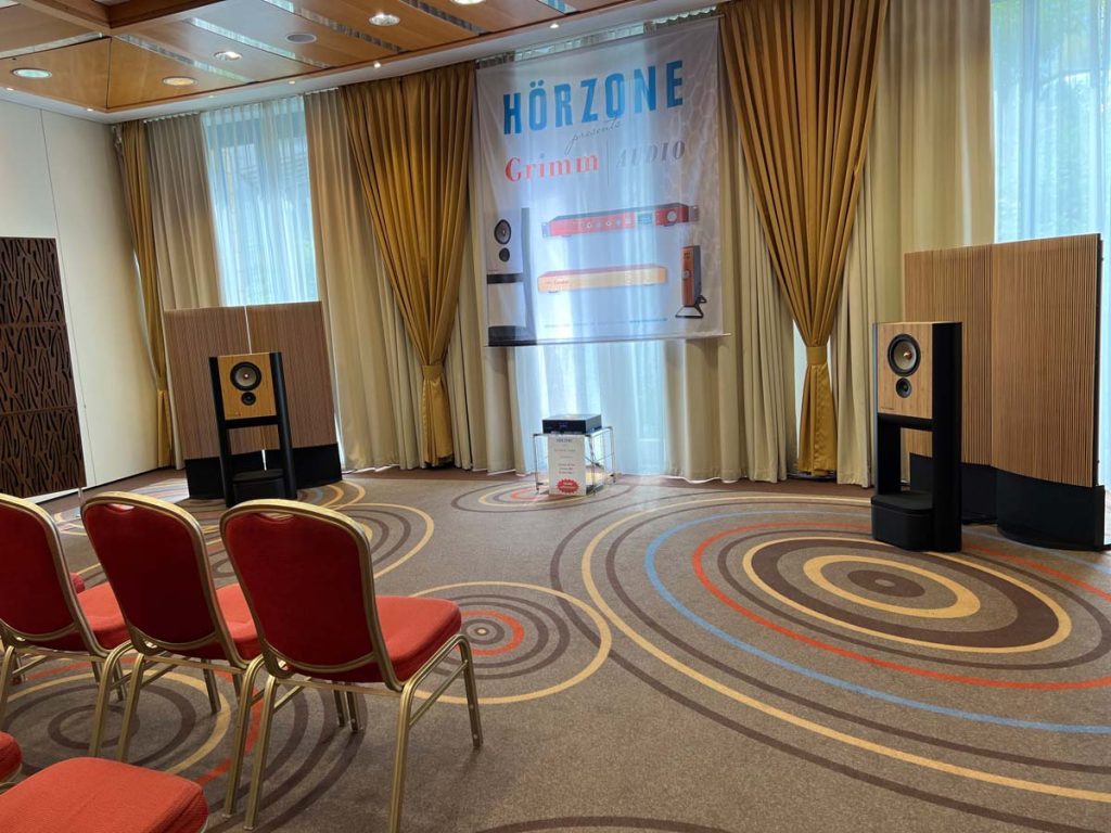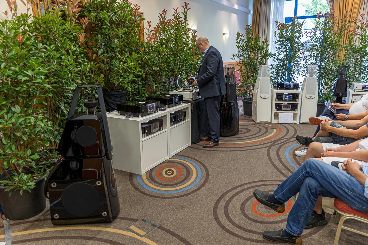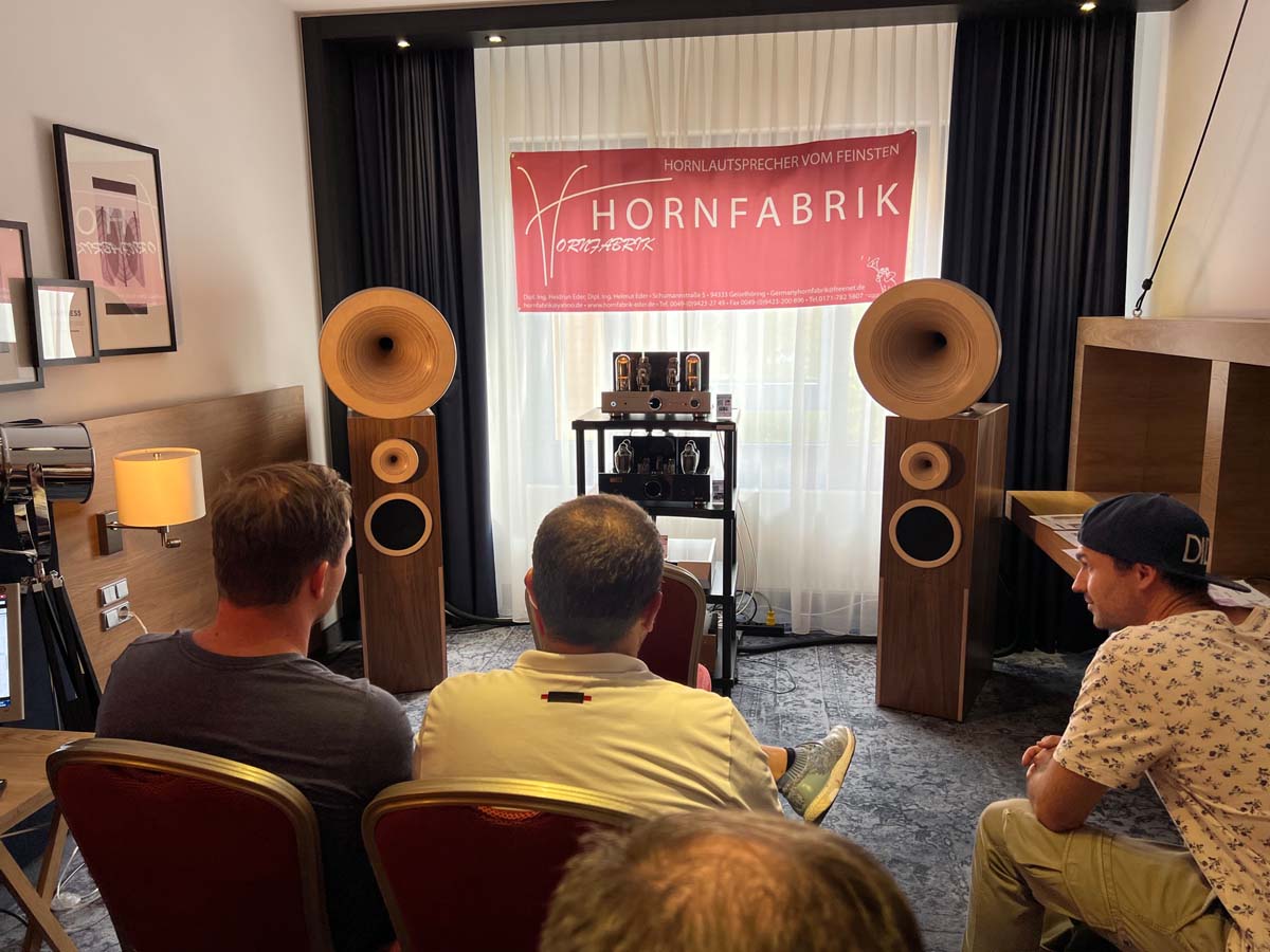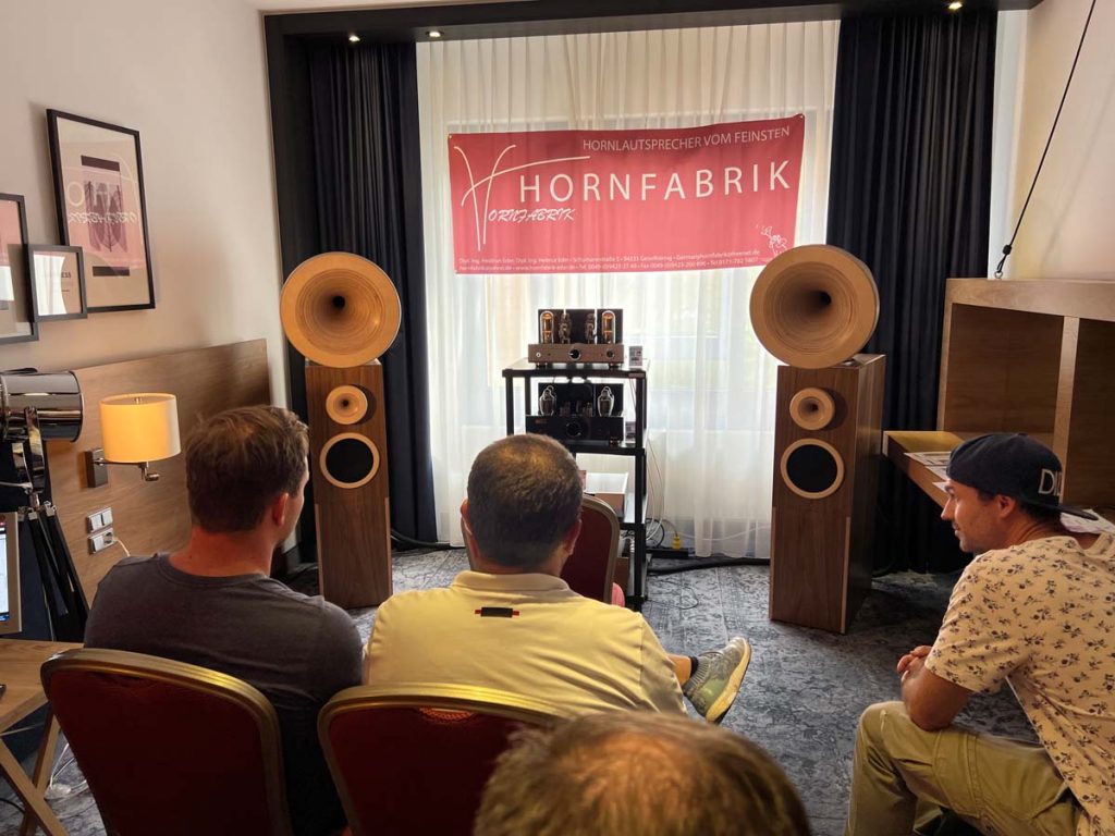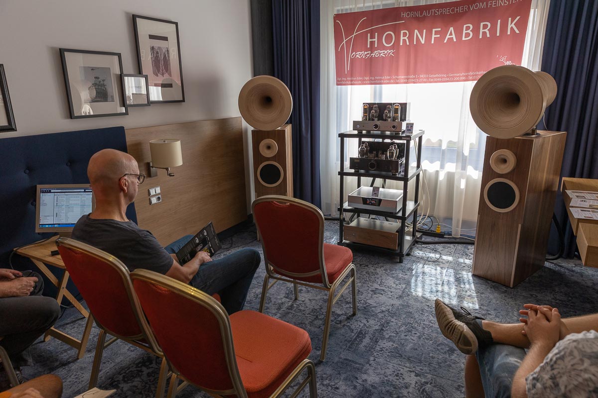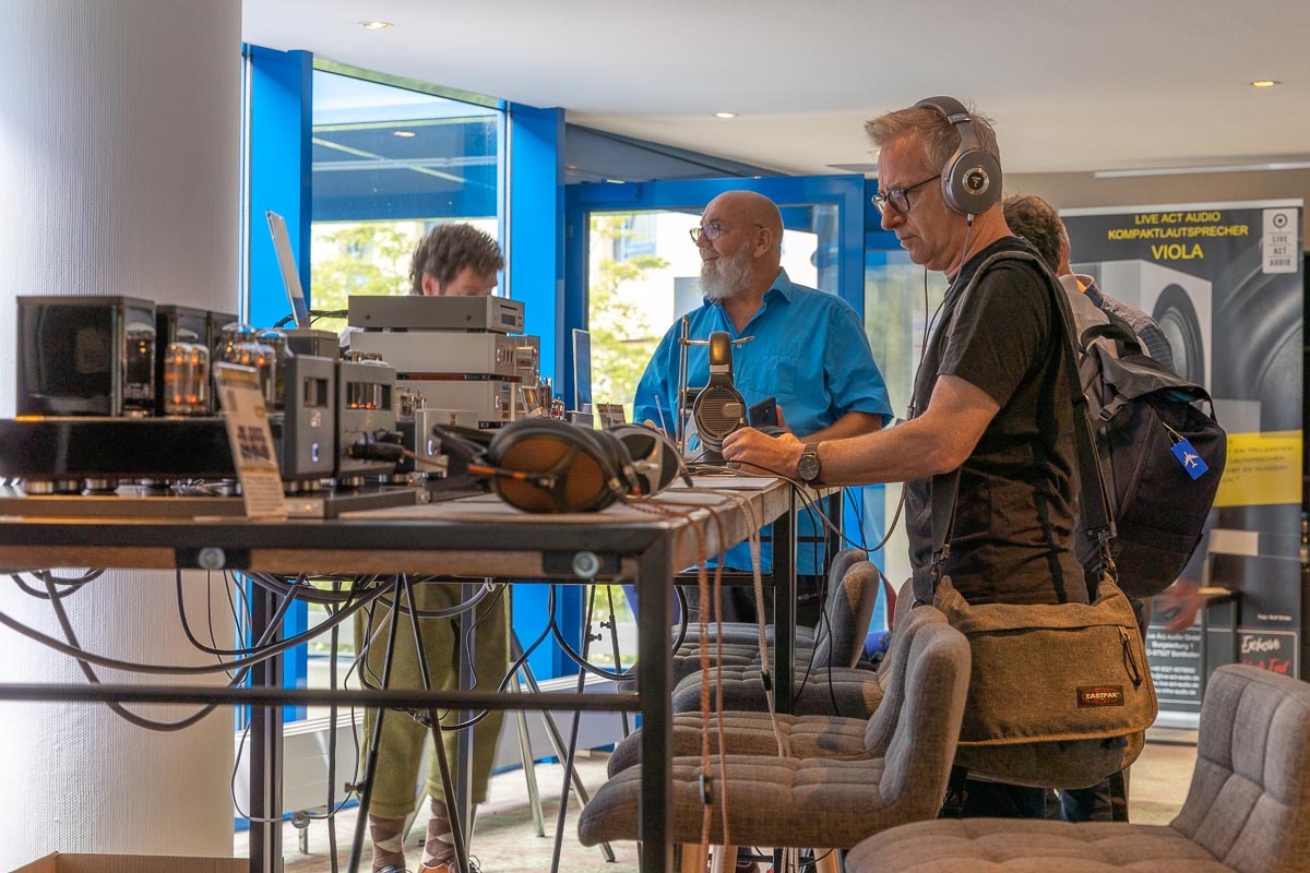 Es ist undankbar, doch zeigt sich die Qualität einer guten Organisation oft in Details, die man nur allzu gern übersieht: Niemand muss hier lange nach dem Hallenplan suchen, der direkt am Eingang hundertfach ausliegt. Und selbst ohne das kleine Heft kann man sich dank klarer Ausschilderung gut zurechtfinden. Entsprechend schnell verteilen sich die ersten Besucher: Man lauscht den Anlagen und Vorführungen von bekannten Größen, Exoten und Newcomern oder trifft sich anschließend in dem gut frequentierten Café des Hotels oder im „Biergarten“, der leise Erinnerungen an die HIGH END in München weckte. Überall tauschen Besucher bei Kaffee, Kuchen oder Käsespätzle ihre Erfahrungen aus und diskutieren über das gerade Gehörte. Eine vergleichbar entspannte und familiäre Atmosphäre kann sich bei einer großen Hallenmesse einfach nicht einstellen. Dimensionen und Anzahl der Aussteller waren dieses Jahr selbstredend etwas kleiner als noch 2019, doch das brachte einen merklichen Vorteil: Auf meinem Weg durch die Zimmer und Säle der Aussteller dämmert mir schnell, dass die Messe an den beiden Tagen bequem zu schaffen ist. Automatisch verlangsame ich meinen Schritt, nehme beinahe in jedem Raum Platz und höre mir mehrere Titel über die Systeme und Ketten an. Diese Muße scheint sich auch bei allen anderen Besuchern eingestellt zu haben. Alle wirken entspannt, und es kommt praktisch nie zur Bildung von „Pfropfen“ in den Eingängen der Zimmer, weil manche „einfach nur kurz die Nase reinstecken“ möchten.
