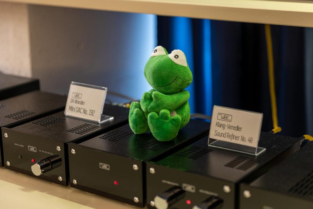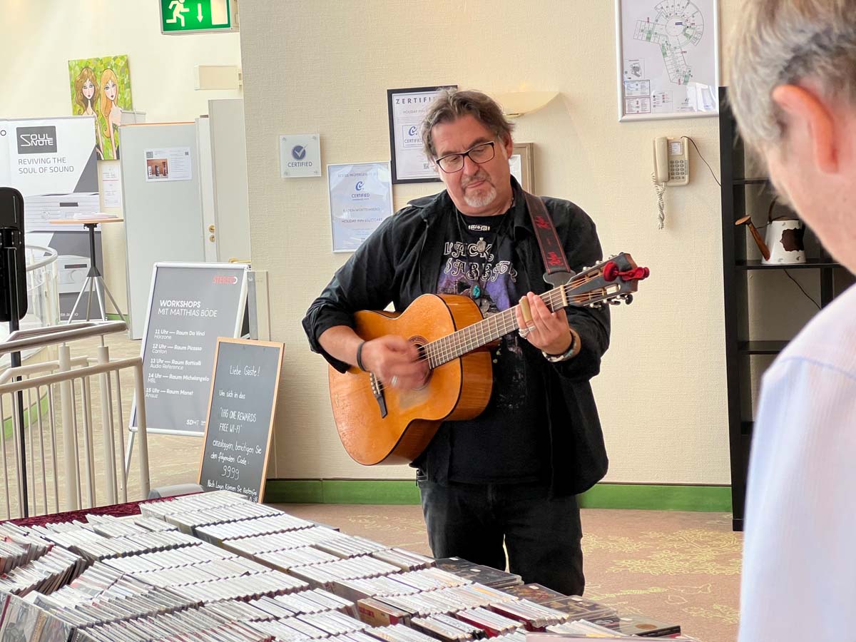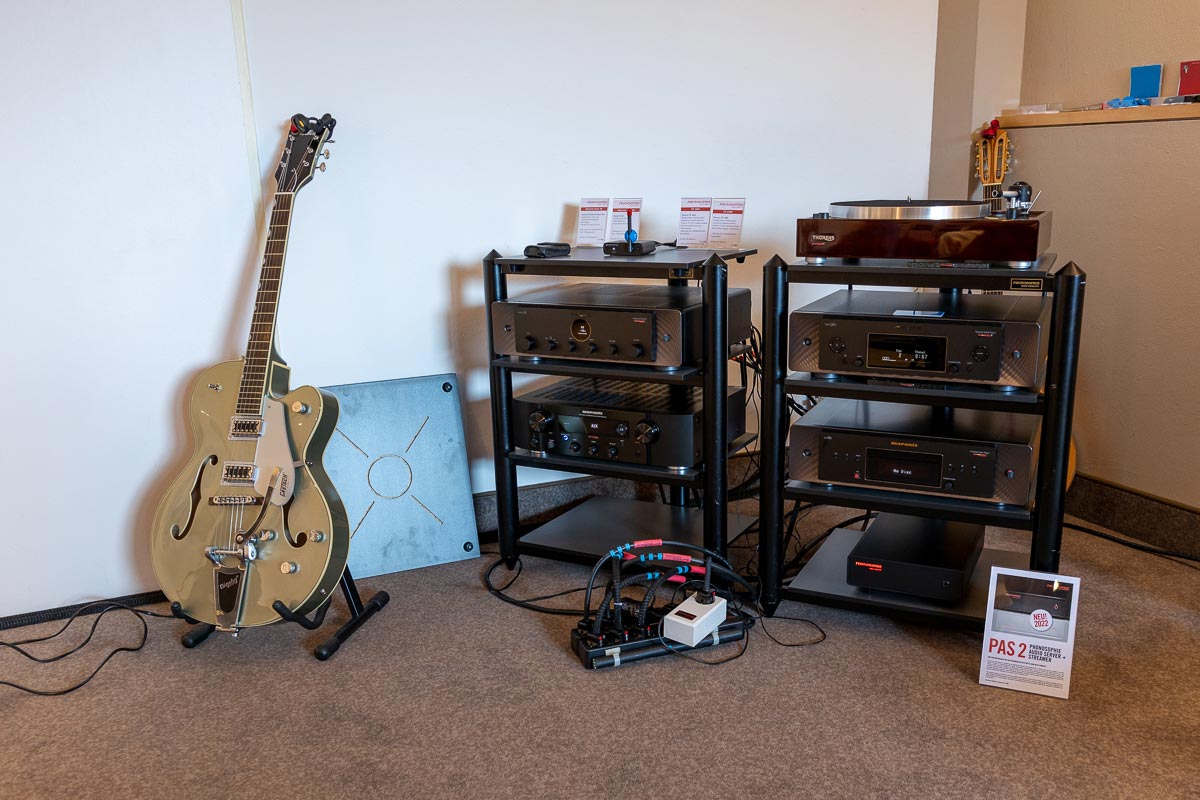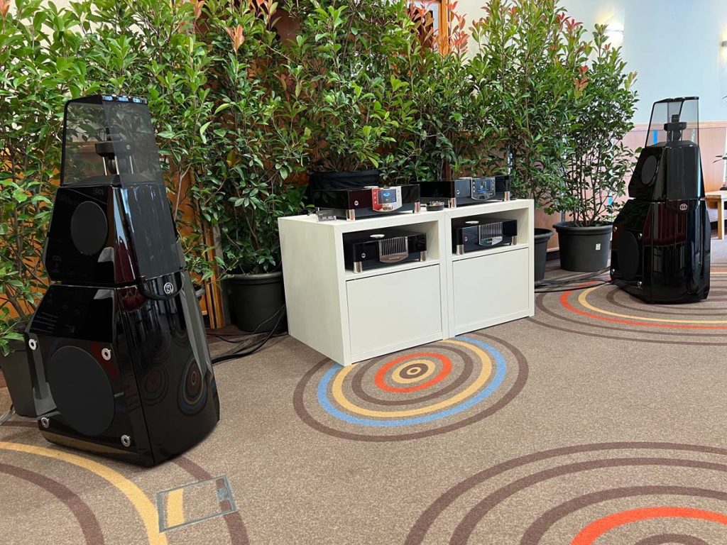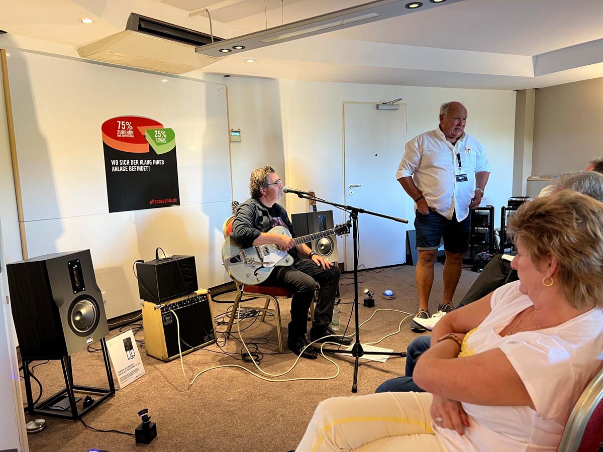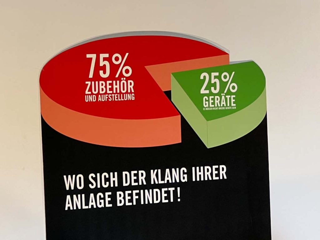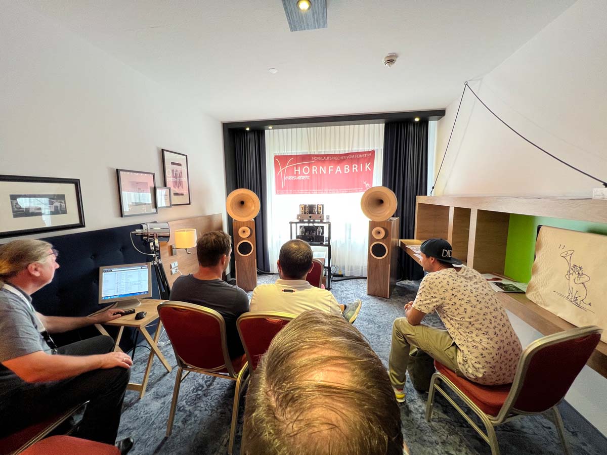 Es ist undankbar, doch zeigt sich die Qualität einer guten Organisation oft in Details, die man nur allzu gern übersieht: Niemand muss hier lange nach dem Hallenplan suchen, der direkt am Eingang hundertfach ausliegt. Und selbst ohne das kleine Heft kann man sich dank klarer Ausschilderung gut zurechtfinden. Entsprechend schnell verteilen sich die ersten Besucher: Man lauscht den Anlagen und Vorführungen von bekannten Größen, Exoten und Newcomern oder trifft sich anschließend in dem gut frequentierten Café des Hotels oder im „Biergarten“, der leise Erinnerungen an die HIGH END in München weckte. Überall tauschen Besucher bei Kaffee, Kuchen oder Käsespätzle ihre Erfahrungen aus und diskutieren über das gerade Gehörte. Eine vergleichbar entspannte und familiäre Atmosphäre kann sich bei einer großen Hallenmesse einfach nicht einstellen. Dimensionen und Anzahl der Aussteller waren dieses Jahr selbstredend etwas kleiner als noch 2019, doch das brachte einen merklichen Vorteil: Auf meinem Weg durch die Zimmer und Säle der Aussteller dämmert mir schnell, dass die Messe an den beiden Tagen bequem zu schaffen ist. Automatisch verlangsame ich meinen Schritt, nehme beinahe in jedem Raum Platz und höre mir mehrere Titel über die Systeme und Ketten an. Diese Muße scheint sich auch bei allen anderen Besuchern eingestellt zu haben. Alle wirken entspannt, und es kommt praktisch nie zur Bildung von „Pfropfen“ in den Eingängen der Zimmer, weil manche „einfach nur kurz die Nase reinstecken“ möchten.