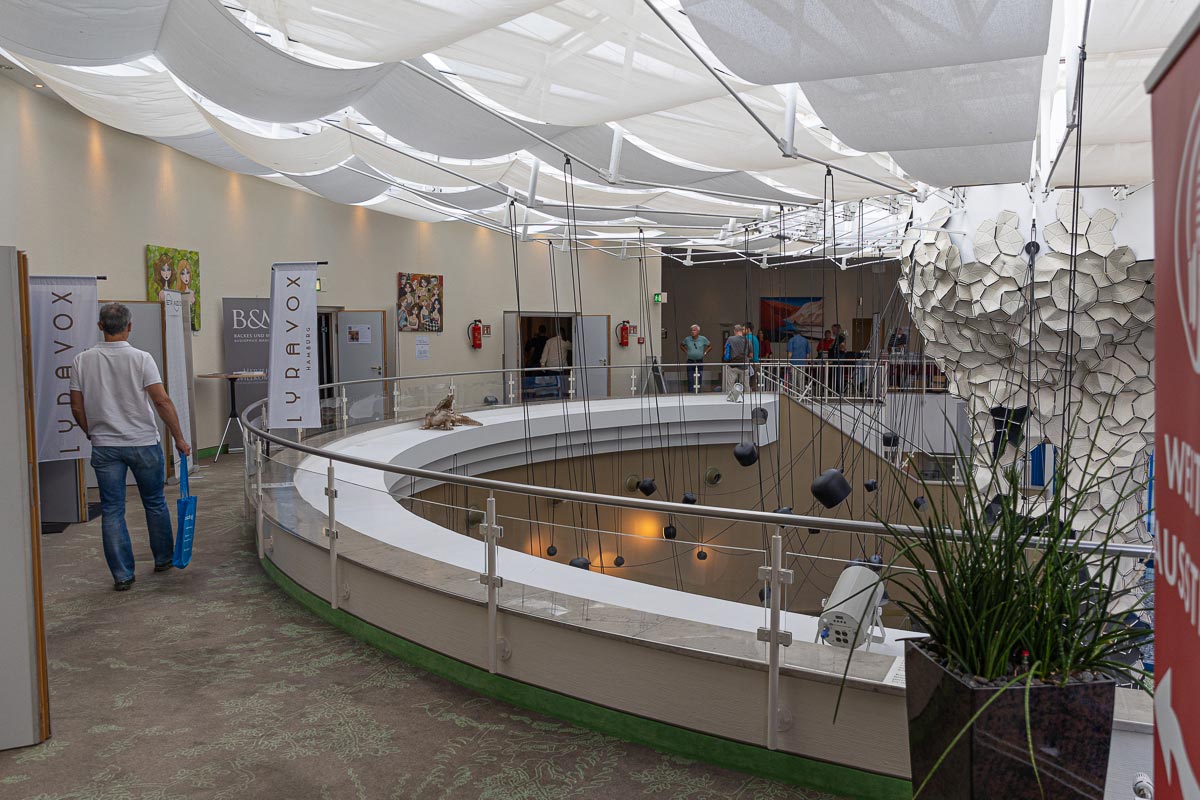 Bevor ich mich aber in das Gewusel in den regulären Hotelzimmern stürze, lasse ich mich von den großen Konferenzräumen des Hotels ködern, die im Bereich hinter dem Speisesaal ringförmig angeordnet sind. Besonderen Eindruck macht auf mich der Konferenzraum „Vargas“. Als ich ihn betrete, spielt Voxativs 9.88 gerade eine Orgelaufnahme. Die Klänge verleihen dem hohen Raum mit seinen langgestreckten Fenstern beinahe die Anmutung einer Kathedrale, die Anlage scheint regelrecht zu atmen und kann zeigen, zu was für einer Bühnenabbildung ein gut abgestimmtes, um einen Breitbänder herum entwickeltes System fähig ist. Die 9.88 basiert auf der bekannten 9.87 (hier finden Sie den Test), die sich aus einem Mittelhochtonmodul mit besagtem Breitbandtreiber und einem aktiven Ripol-Subwoofer zusammensetzt, und rundet das Konzept mit einem Grundtonmodul ab, das die Brücke zwischen den beiden Frequenzzweigen schlägt und für einen deutlich griffigeren, körperhafteren Gesamteindruck sorgt. Ein Voxativ T-805, der aus der namensgebenden Triode 30 Single-ended-Watt pro Kanal mobilisiert, liefert standesgemäßen Antrieb. Was mir direkt auffällt, ist, wie gut der Raum funktioniert. Hier und auch bei allen anderen Vorführungen höre ich deutlich, dass die Aussteller im Stuttgarter Hotel mit statt gegen die Raumakustik arbeiten können. Ein gewichtiges Pfund, mit dem die Süddeutschen HiFi-Tage wirklich wuchern können.