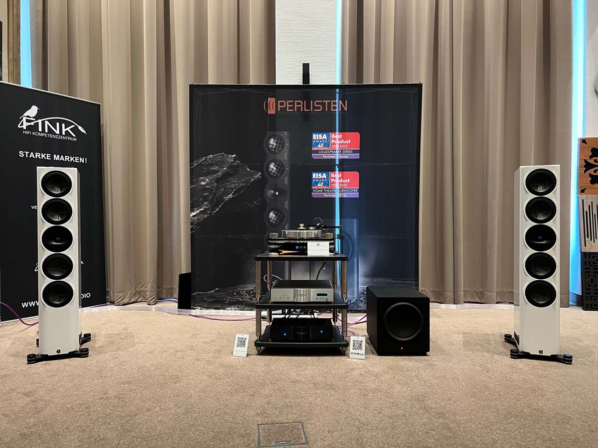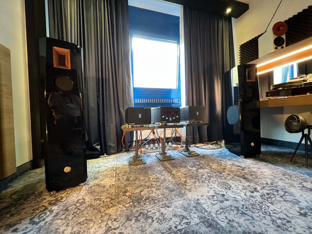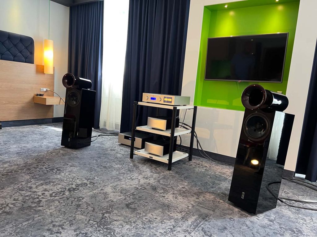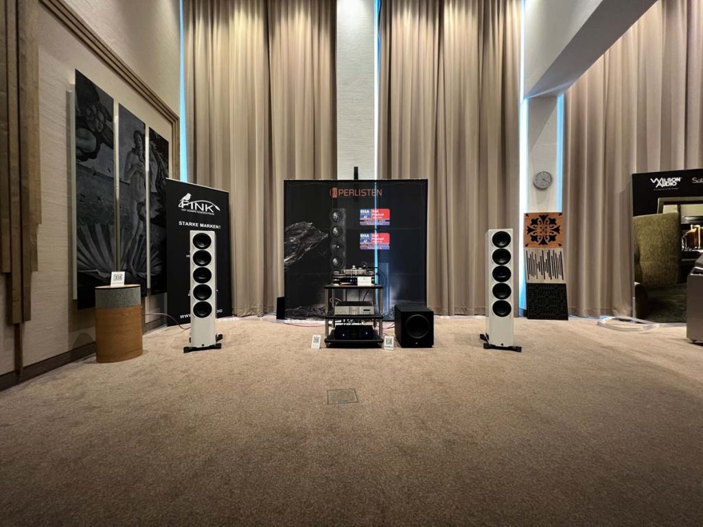 Audio Reference hatte sich mit „Botticelli“ den größten Raum des Hotels gesichert, und das aus gutem Grund: Zugezogene Vorhänge sorgen hier für herrlich gedämmtes Licht, das die Vorführung zum Kino für die Ohren macht. Flankiert von hochkarätigen Exponaten habe ich die Wahl zwischen zwei Weltklasse-Setups: Wilson Audios Sasha DAW an Dan D’Agostino oder die Perlisten S7t an Elektronik von Krell. Der junge Hersteller hat vor allem mit Heimkino-Meriten von sich reden gemacht – allerdings kann ich mich hier wieder einmal davon überzeugen, dass die Lautsprecher dank ihrer clever gesteuerten Abstrahlcharakteristik auch und gerade im Stereobetrieb beeindruckend kontrolliert und sauber aufspielen.