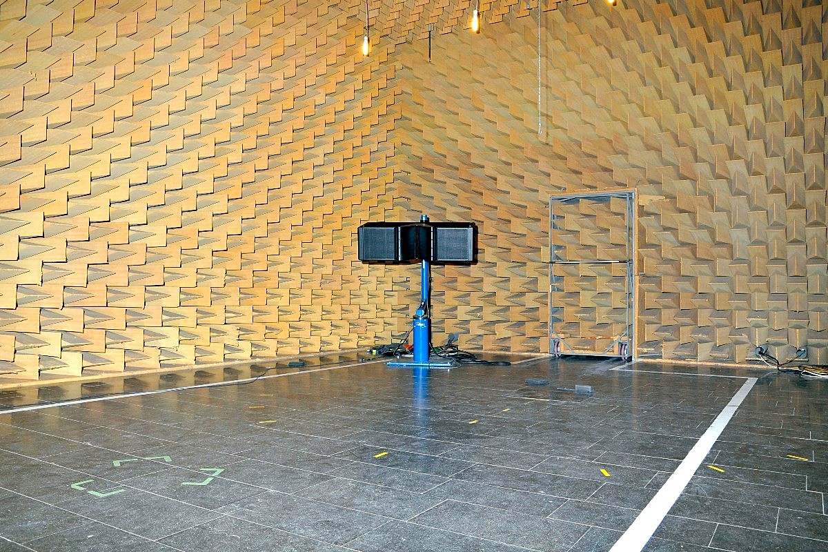 Wenn es einmal ernst wird und Bedarf nach viel Leistung besteht, kommen eine Crown Reference I oder eine Crown I-T12000 HD zum Einsatz. Der Messraum ist als reflexionsarmer Halbraum mit einem absolut schallharten Granitboden aufgebaut und ermöglicht Freifeldbedingungen ab ca. 100 Hz aufwärts. Das Messmikrofon wird dabei immer auf dem Boden platziert, sodass es für das Mikrofon keine sichtbaren Reflexionen von der Bodenfläche gibt. Messungen für den Frequenzbereich unterhalb von 100 Hz werden als Nahfeldmessungen direkt vor den Quellen durchgeführt und später in der Software mit der Fernfeldmessung automatisch kombiniert. Die Messentfernung sollte einer typischen Hördistanz entsprechen und kann maximal acht Meter betragen. Kleine Lautsprecher werden meist in zwei Meter Entfernung gemessen, größere in vier oder acht Metern Entfernung.