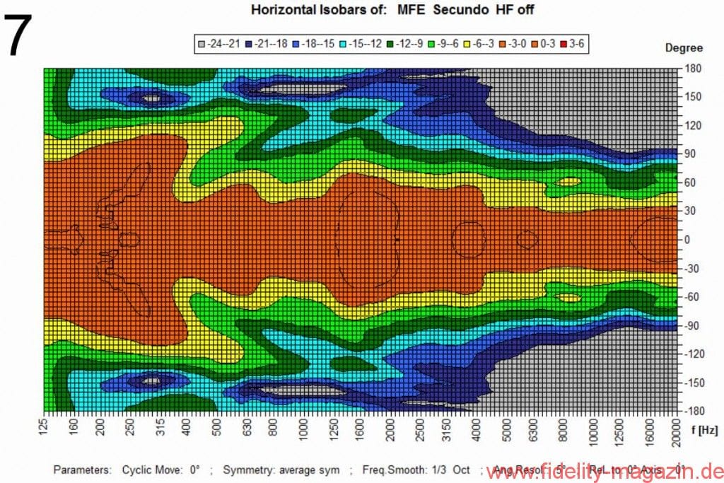 Die Directivity eines Lautsprechers wird in erster Linie durch die Ausdehnung der Strahlerflächen bestimmt. Typischerweise gilt: je höher die Frequenz, desto kleiner die Membran, sodass auch hohe Frequenzen noch mehr oder weniger breit abgestrahlt werden. Die horizontalen Isobaren der Secundo aus Abb. 7 zeigen dazu anschaulich, wie man mit einem 3-Wege-System den Abstrahlwinkel in Grenzen weitgehend konstant halten kann. Hinzu kommt der Ansatz eines Waveguides am Hochtöner, der im Übergangsbereich die Anpassung an den Mitteltöner verbessert und eine Sprungstelle verhindert. Im Mittel liegt so der Öffnungswinkel oberhalb von 1 kHz bei 133° mit einer Schwankungsbreite von 22°. Beide Werte sind praxisgerecht und ermöglichen eine gute Bewegungsfreiheit vor dem Lautsprecher in der horizontalen Ebene. Die Vertikale gestaltet sich dagegen deutlich anders. Der Hochtöner bringt durch seine Bauform eine ausgeprägte Bündelung mit sich, die nicht unbedingt von Nachteil ist. Die Bewegungsfreiheit wird dadurch zwar ein wenig eingeschränkt, aber dafür werden auch störende Reflexionen von Boden und Decke des Raumes merklich reduziert. Den Bewegungsspielraum benötigt man in der Vertikalen ohnehin nicht unbedingt, und ein für akustisch schwierige Räume etwas toleranter Lautsprecher ist immer von Vorteil.