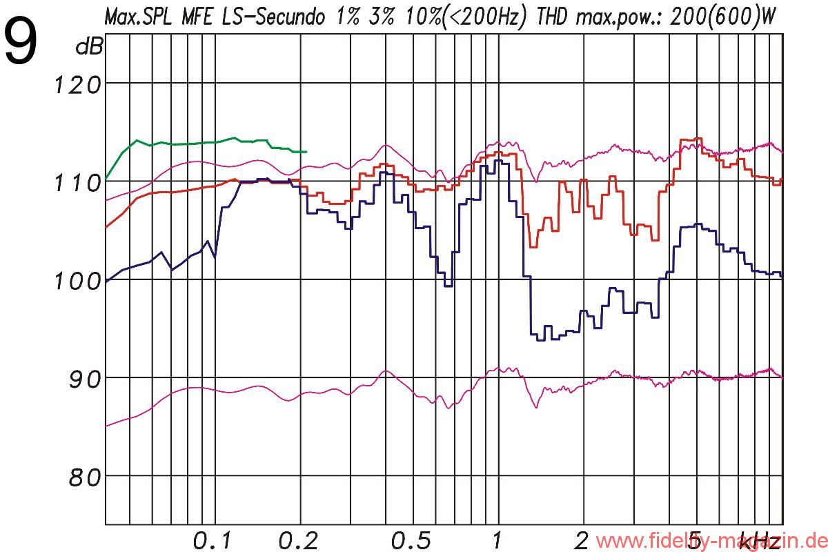 An einen hoch belastbaren Lautsprecher mit einer zudem noch sehr hohen Sensitivity stellt man hohe Erwartungen für den erreichbaren Maximalpegel. Macht man die bekannte Rechnung auf, um 85 dBA Mittlungspegel in 4 m Entfernung zu erzielen, dann muss der Lautsprecher bezogen auf 1 m 97 dBA und je nach spektraler Zusammensetzung des Signals ca. 100 dBZ liefern können. Das wäre der Mittlungspegel. Geht man von einem Verhältnis vom Spitzenwert zum Effektivwert im Signal von 12 dB aus, dann wären das 112 dB in 1 m Entfernung. Bei einer Sensitivity von 89 dB würde somit ein 100-W-Verstärker (+3 dB Peak) zum Ziel führen. Möchte man das Gleiche mit einem Lautsprecher erreichen, der nur eine Sensitivity von 83 dB hat, dann wäre dafür schon die vierfache Leistung erforderlich. Eine gleichmäßig hohe Sensitivity ist daher der entscheidende Aspekt für ein dynamische Wiedergabe. Wie gut die MFE Secundo in der Lage ist, hohe Leistungswerte auch in Schalldruck umzusetzen, ist in Abb. 9 zu erkennen. In der Messreihe wurde der maximal erreichbare Schalldruck bei Verzerrungsgrenzwerten von höchstens 1 % und höchstens 3 % gemessen. Die Leistung wurde dabei zunächst auf 200 W limitiert. Die rote Drei-Prozent-Kurve kommt bei dieser Art der Messung der rechnerisch ermittelten oberen rosa Kurve aus Sensitivity und maximaler Leistung bereits sehr nahe, d. h. der Lautsprecher ist auch tatsächlich in der Lage, die Leistung ohne größere Verzerrungen in adäquaten Schalldruck umzusetzen. Bis 200 Hz wurde dann noch eine weitere Messreihe für maximal 600 W und höchstens 10 % Verzerrungen durchgeführt. Der Tieftöner setzt auch das noch locker um und steigert seinen Pegel wie erwartet. Die Secundo liefert somit hohe Pegel bei niedrigen Verzerrungen im gesamten Frequenzspektrum. Genau das sind die Voraussetzungen für eine authentische und dynamische Musikwiedergabe.