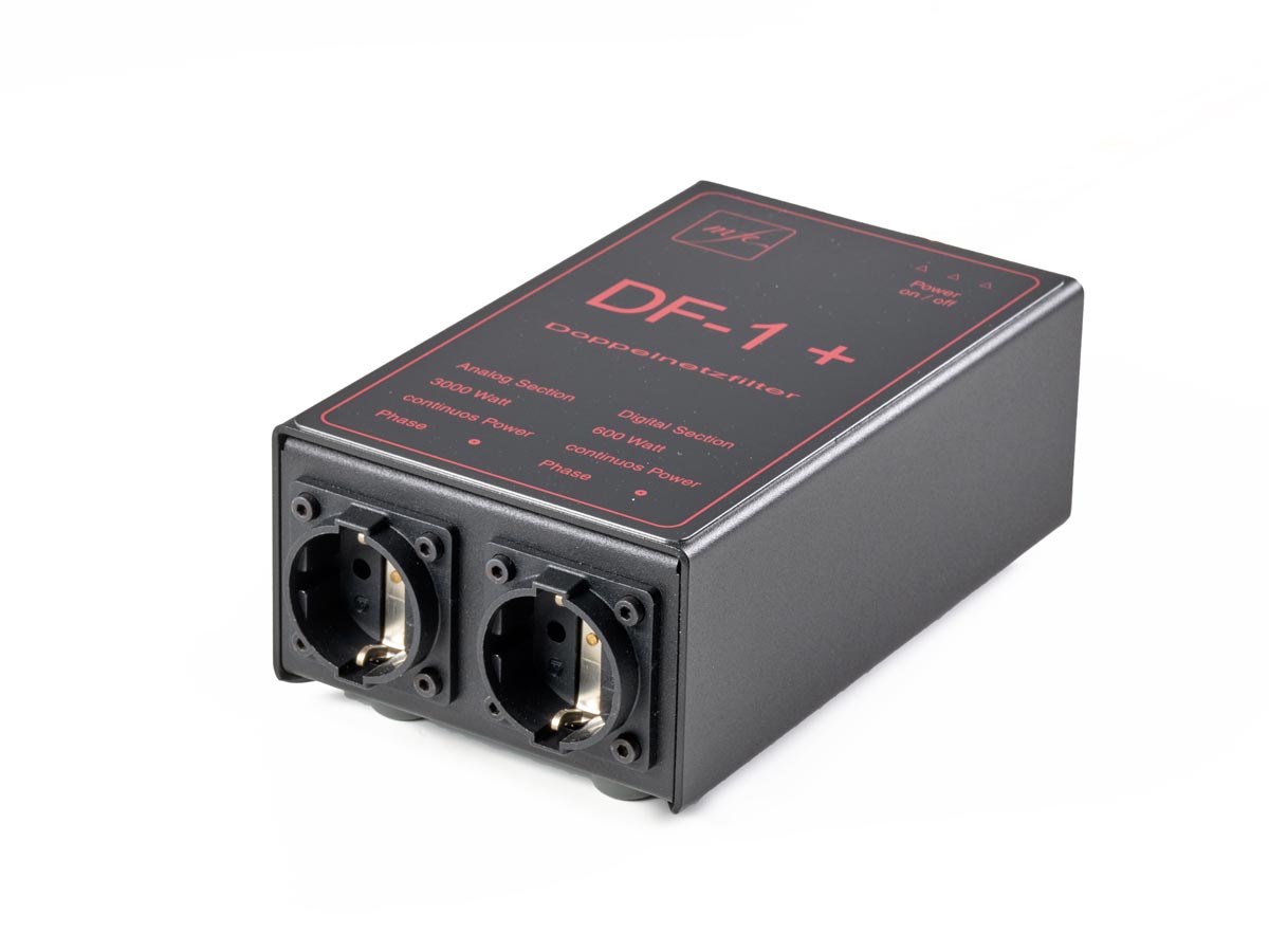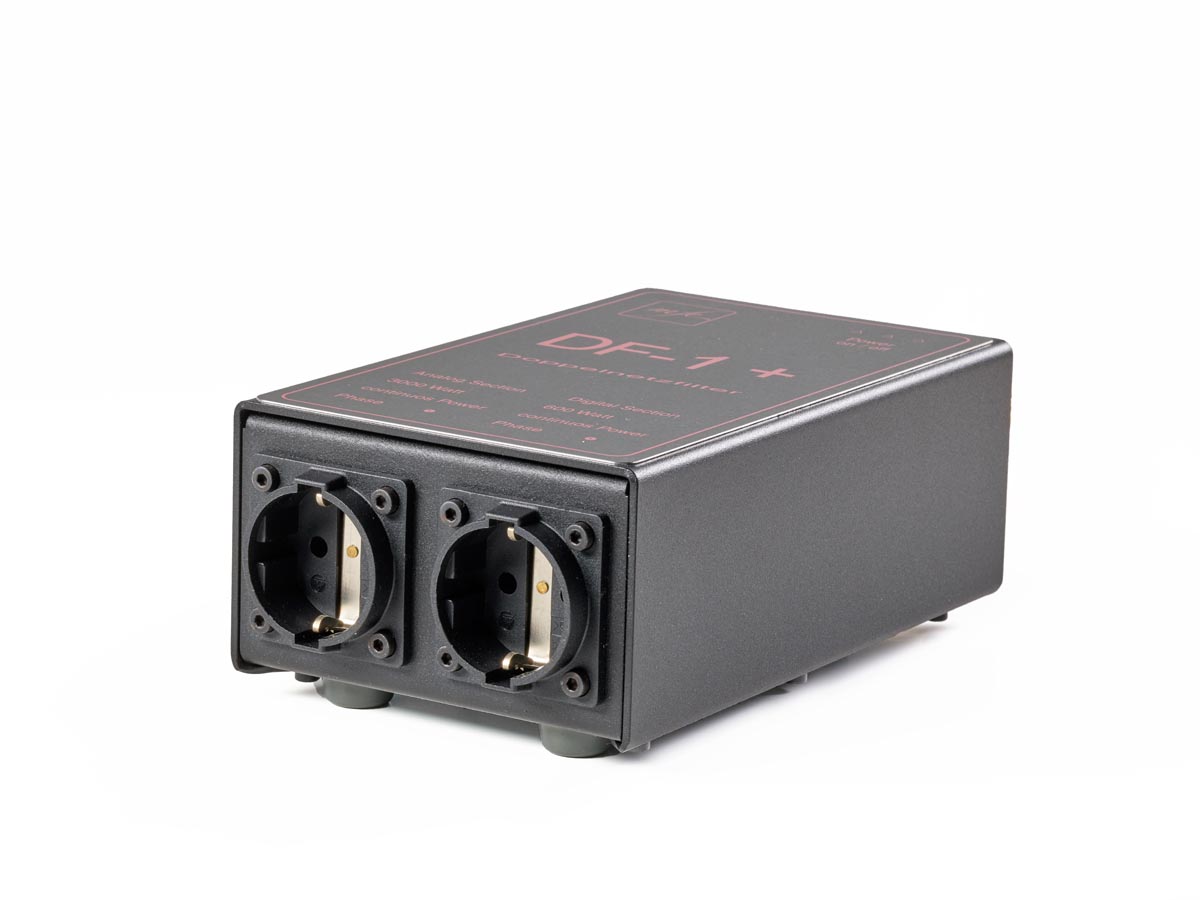 Dem eleganten schwarzen Kästchen von mfe-electronic sieht man auf den ersten Blick nicht an, was in ihm steckt. Der Netzfilter DF-1+ wird mit einem hochwertigen Kabel per Schukostecker an das Netz angeschlossen. Er verfügt über zwei getrennte Filter, die über eine Schukosteckdose nach außen geführt werden. Einer für analoge Geräte wie Vorverstärker und Endstufen und ein zweiter für digitale Komponenten. Diese Schukosteckdosen lassen sich mittels Mehrfachsteckdosen erweitern. Dankenswerterweise sind die Phasen gekennzeichnet, was zeitraubendes Herumprobieren erspart.