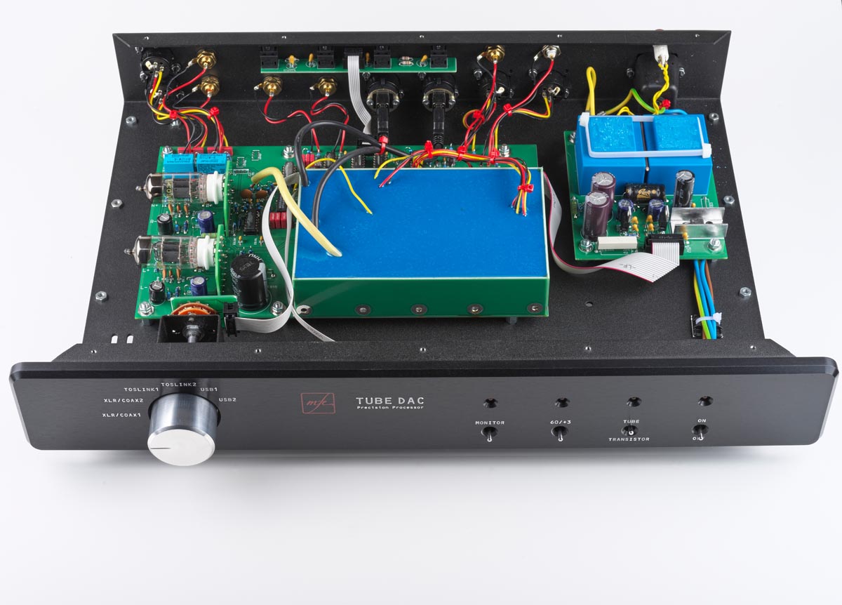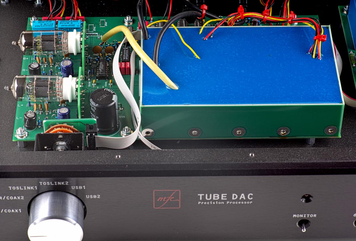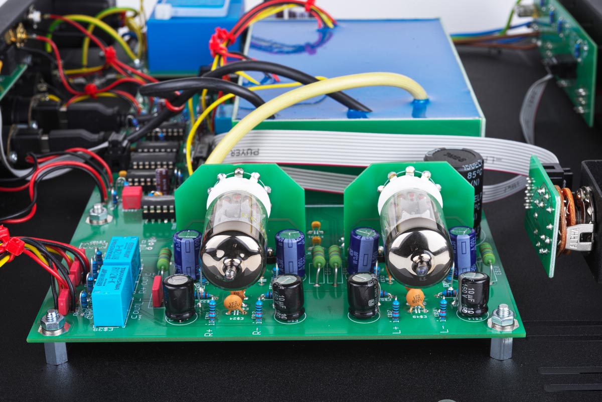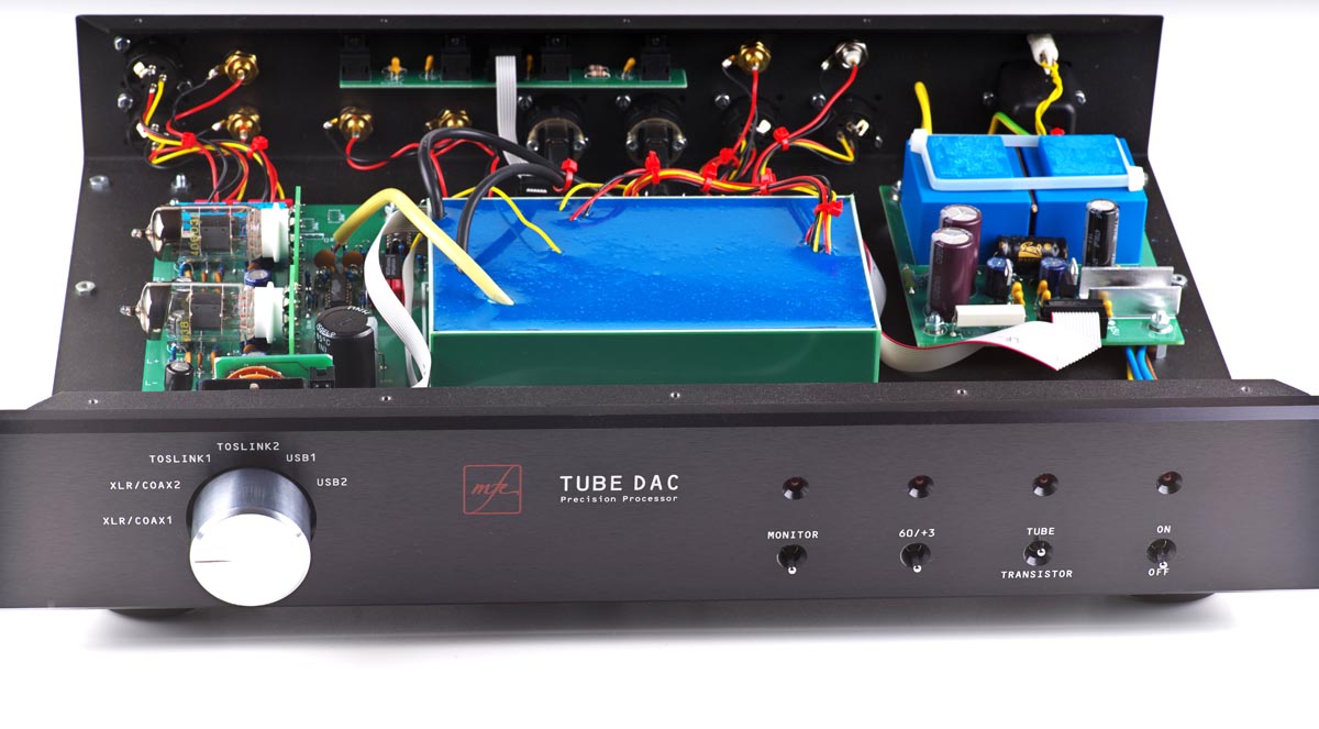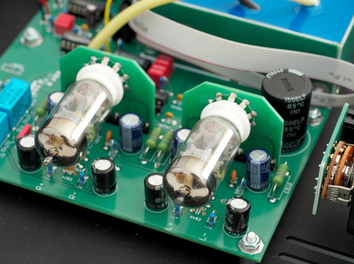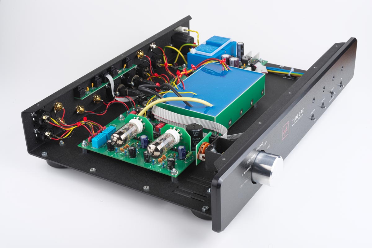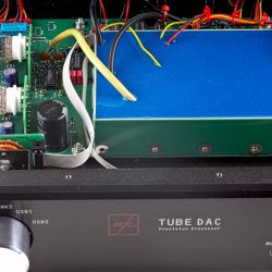 Deswegen soll nach dem Willen des Entwicklers die Identität der Wandler-Chips im Tube DAC geheim bleiben. Entscheidend ist, dass im MFE-Wandler ein aktiver Tiefpass mit Röhren zum Einsatz kommt und den Klang formt. Zwei Doppeltrioden des Typs PCC88 – alternativ dürfen auch PCC85, ECC88 und andere kompatible Typen in der Ausgangsstufe verwendet werden – sind als aktives Bauelement für die Wohlklangformung zuständig. Wobei in puncto Glaskolben Michael Franken die pragmatische Einstellung des Ingenieurs hat: „Die Röhren müssen RoHS-konform und als solche technisch State of the Art sein. Den Hype um alte Telefunken-Röhren, die zu teilweise grotesken Gebrauchtpreisen gehandelt werden, finde ich übertrieben. Obwohl ich verstehen kann, wenn ein Liebhaber den altersbedingt weichen Klang solcher Röhren liebt. Die lassen sich ohne Weiteres in den Tube DAC SE einbauen.“