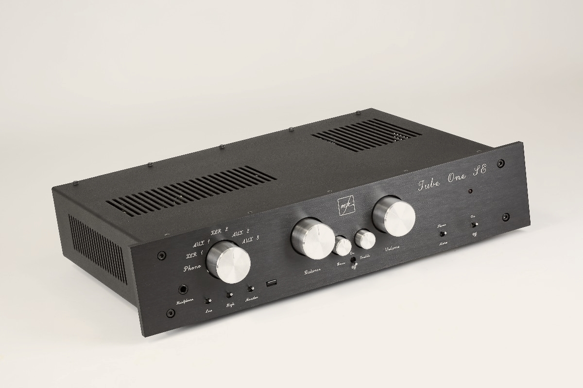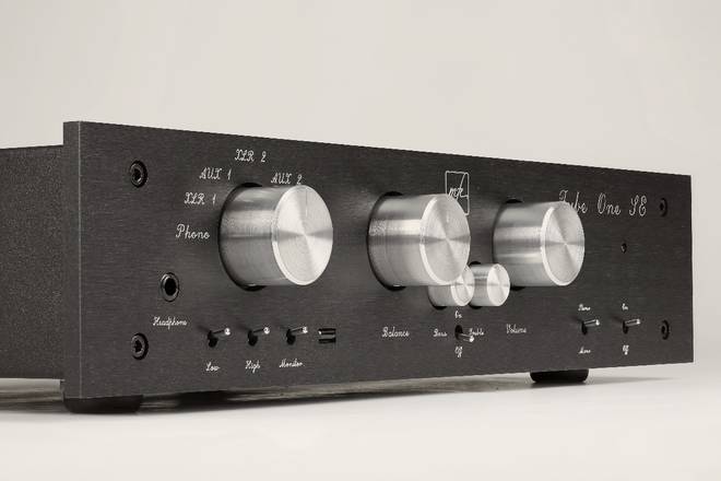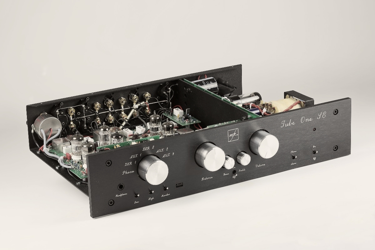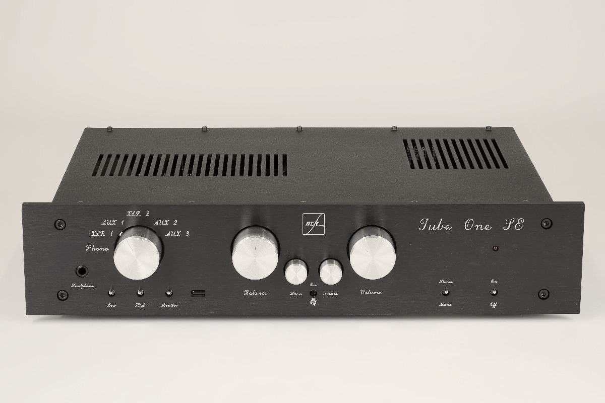 Bezeichnen wir ihn einfach mal als „robust“. Oder vielleicht als „herbe Schönheit“? Geschmäcker sind nun mal verschieden – erst recht, wenn es um Schrauben, Frontplattenbeschriftung, Knöpfe oder Deckel geht. Fakt ist, der Tube One SE von MFE ist fast so stabil gebaut wie ein Panzer. Und das sieht man ihm auch an. Was noch gar nichts über seine inneren oder gar klanglichen Werte aussagt. Unter dem schwarzen, dicken Lochblech-Deckel stecken eine Hochpegel- sowie eine komplette Phonostufe. Das macht die MkII-Inkarnation des Tube One zu einem Komplettpaket, inklusive einiger zusätzlicher Filter und einer Klangregelung. Die wohlbemerkt abschaltbar ist. Und die der Vorverstärker – nach Meinung des Autors dieser Zeilen – ungefähr so dringend braucht wie sein Besitzer die Grippe. Doch Dipl.-Ing. Michael Franken, Inhaber und Designer von MFE (Motto: „Das Beste zu fairen Preisen“) erzählt, dass durchaus jeder zweite oder dritte Tube-One-Kunde gerne eine Klangregelung und damit die MkII-Variante hätte. Erstaunlich, nicht wahr? Wie gesagt: Die Sache ist abschaltbar. Und wer es so nicht mag, der bestellt einfach einen Tube One „ohne“, was für die auf Sonderwünsche ohnehin eingestellte Manufaktur alles andere als ein Problem darstellt.