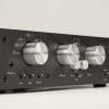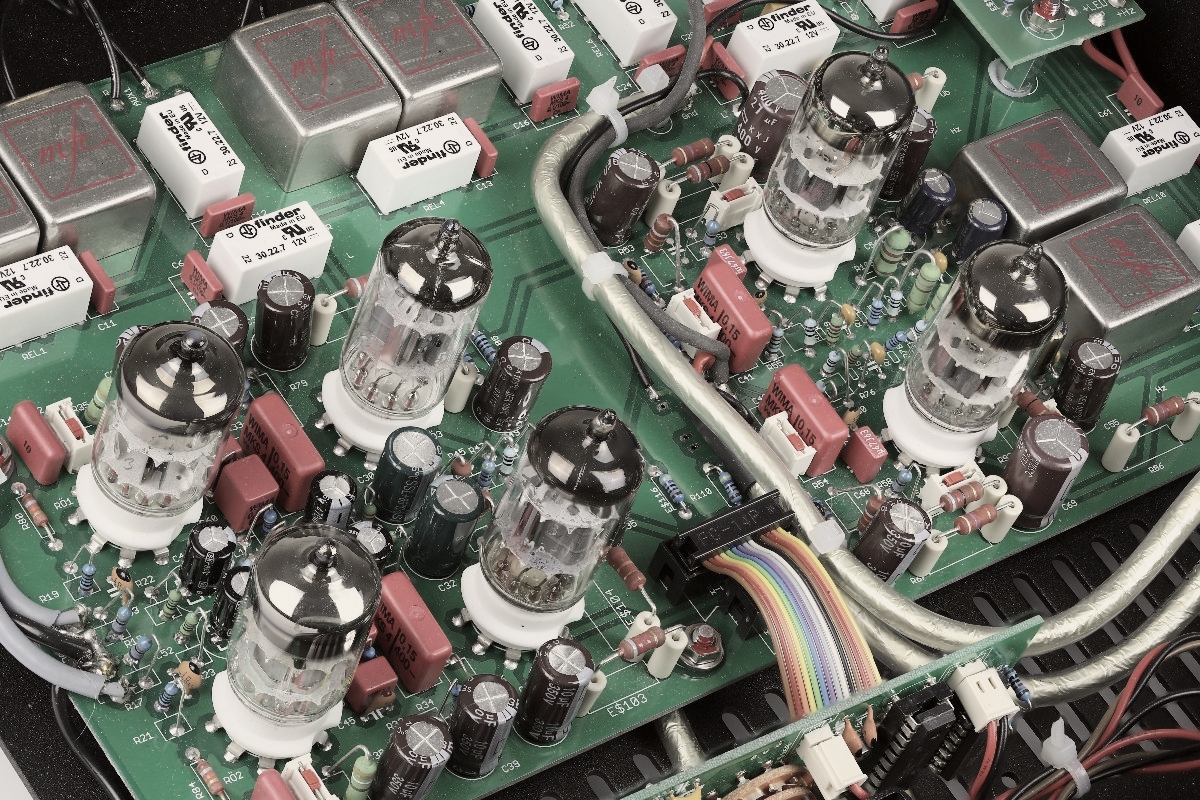In der zweistufig ausgelegten Linestufe, die hinter dem motorisierten Pegelsteller angeordnet ist, sitzt wie schon erwähnt normalerweise eine Doppeltriode PCC88. Sie liefert in einer zweistufigen Schaltung zehnfache Spannungsverstärkung, verbunden mit niedriger Ausgangsimpedanz von um die 100 Ohm. Einerseits können so praktisch alle denkbaren Endverstärker sicher angesteuert werden, andererseits ist zusätzlich ein Ausgangsabschwächer vorhanden, mit dessen Hilfe das Signal wahlweise um 13 Dezibel abgesenkt werden kann. Enorm praktisch, wenn sehr wirkungsgradstarke Lautsprecher, empfindliche Endverstärker und „laute“ Quellen zusammentreffen und schon bei „acht Uhr“ am Pegelsteller viel zu viel Lautstärke anliegt.