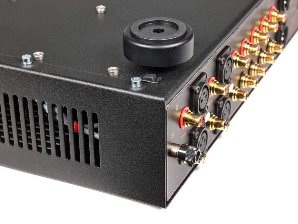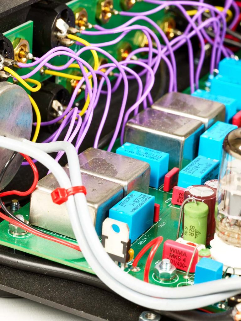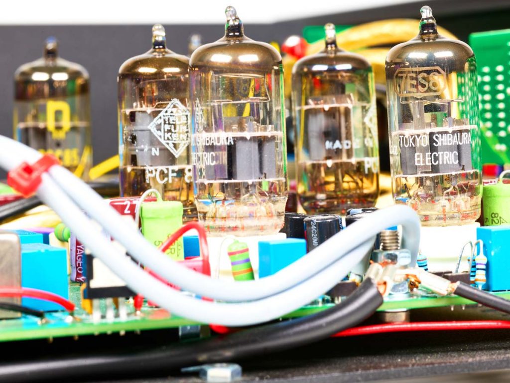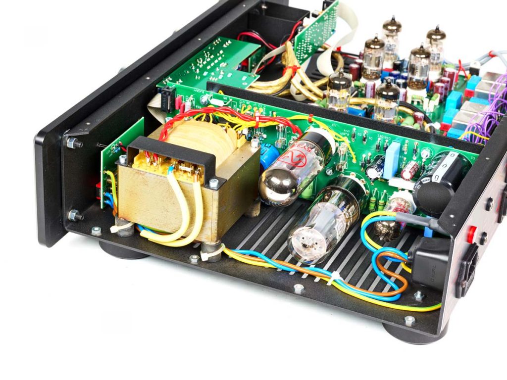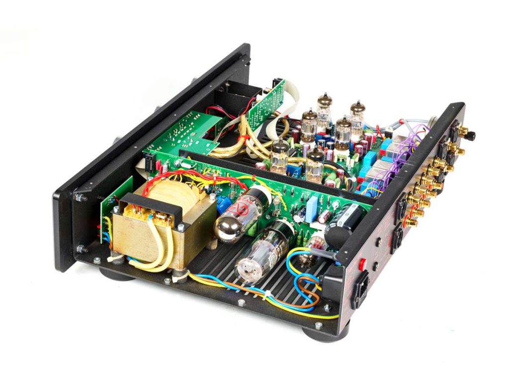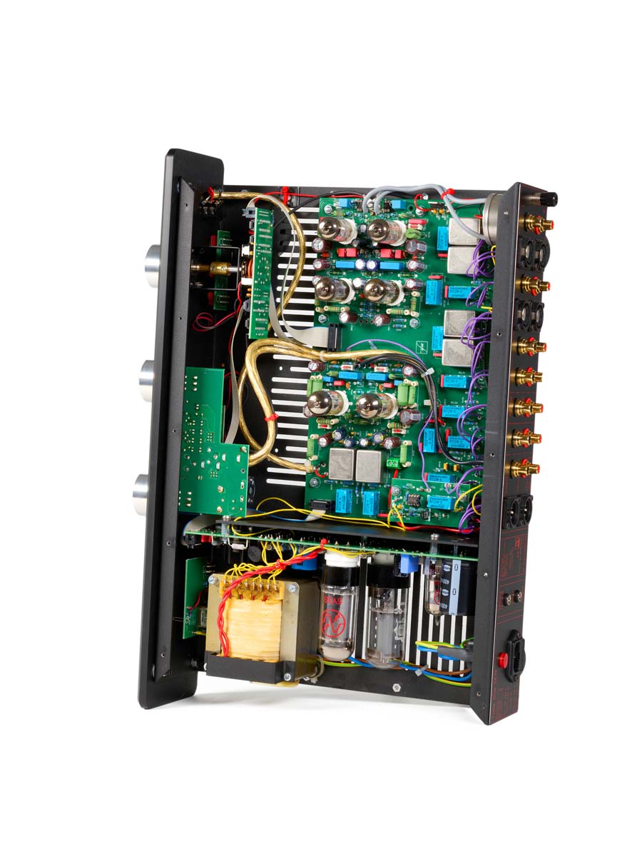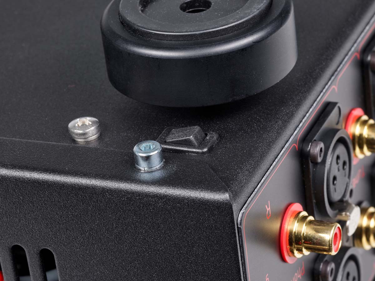 Der Phonoentzerrer nimmt die Hälfte der Hauptplatine ein. Direkt hinter den Eingangsbuchsen sitzt in einer abschirmenden Metallkapsel ein Step-up-Trafo (kurz: SUT), der das Signal von MC-Tonabnehmern hochtransformiert. Über einen darunter am Geräteboden montierten Wippschalter lässt er sich deaktivieren, wenn ein MM-System angeschlossen ist. Die Impedanz ist im MC-Zweig standardmäßig auf 200 Ohm eingestellt. Selbstverständlich lassen sich auf der Platine aber auch andere Werte stecken bzw. ein SUT mit einem anderen Übersetzungsverhältnis einbauen. Die folgende Schaltung arbeitet dreistufig. Im Testgerät waren als Röhren pro Kanal je eine Doppeltriode PCC88 als rauscharme Eingangsstufe und eine PCF80 verbaut, die in ihrem Glaskolben ein Trioden- und ein Pentodensystem vereint und dank eines niedrigen Ausgangswiderstands die folgende Line-Stufe sicher ansteuert. Dort finden sich Doppeltrioden des Typs PCC85, die ein symmetrisches und ein unsymmetrisches Ausgangssignal liefern.