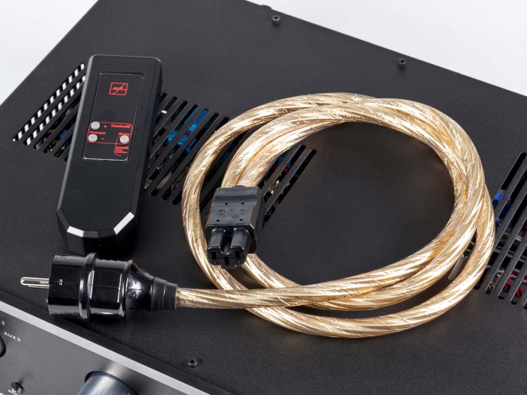Ich schließe den MFE-Pre mithilfe des mitgelieferten Netzkabels an meinen AudioQuest Niagara 3000 an. Das Kabel ist keine Verlegenheitsstrippe vom Grabbeltisch, sondern überaus solide Handarbeit aus dem Hause MFE mit Folienschirm, für Phase und Masse jeweils doppelt vorhandenen Kupferleitern und stabilen Steckern. Die Vorstufe zeigt mittels Phasenleuchte die korrekte Steckerposition an, ein weithin schmerzlich vermisstes Feature, das Bände spricht über Michael Frankens Arbeitsweise. Ebenso wie die etatmäßige Fernbedienung im dickwandigen Aluminiumgehäuse, die ausschließlich Lautstärke und die Mute-Funktion steuert und den Tube One vermutlich auch von der Garage aus erreichen würde. Es scheint jedenfalls keinen Winkel zu geben, von dem aus der IR-Sensor an der Gerätefront kein Signal erkennt. Sehr angenehm.