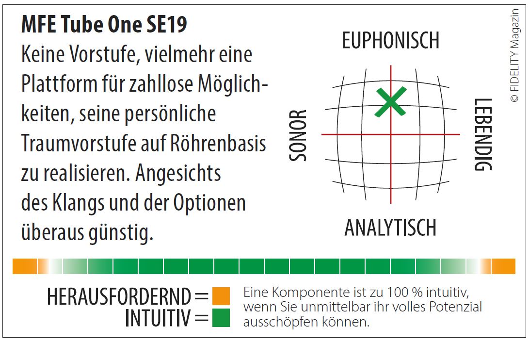 Dagegen zeigt der MFE durchaus Charakter. Der Tube One SE19 spielt genau, aber entspannt, hochauflösend und doch warm. Mit seiner in sich ruhenden, homogenen Wiedergabe, mit seiner Art, Töne, Geräusche, Stimmen plastisch nachzuzeichnen, unterstützt er das Verständnis des Gehörten.