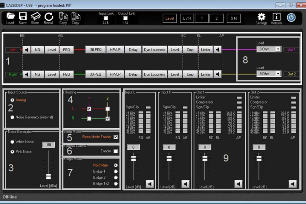 Gesteuert werden die Funktionen von einer Windows-Software, welche die Einstellungen drahtlos direkt an das Gerät überträgt. Dafür stellt der CA280DSP einen eigenen WLAN-Zugangspunkt zur Verfügung. Da das Gerät über eine Ein-und Ausschaltautomatik verfügt, kann es einfach unsichtbar hinter dem Rack verschwinden und dennoch jederzeit drahtlos konfiguriert werden. Aber auch sichtbar im Rack platziert macht der kompakte CA280DSO mit seiner schwarz-eloxierten Alu-Front eine gute Figur. Über den Taster an der Front lassen sich bis zu drei vom Nutzer konfigurierte Presets abrufen. Dadurch kann z.B. ein Preset für Musik und ein weiteres für Filme hinterlegt werden, oder unterschiedliche Presets für verschiedene Musikstile.