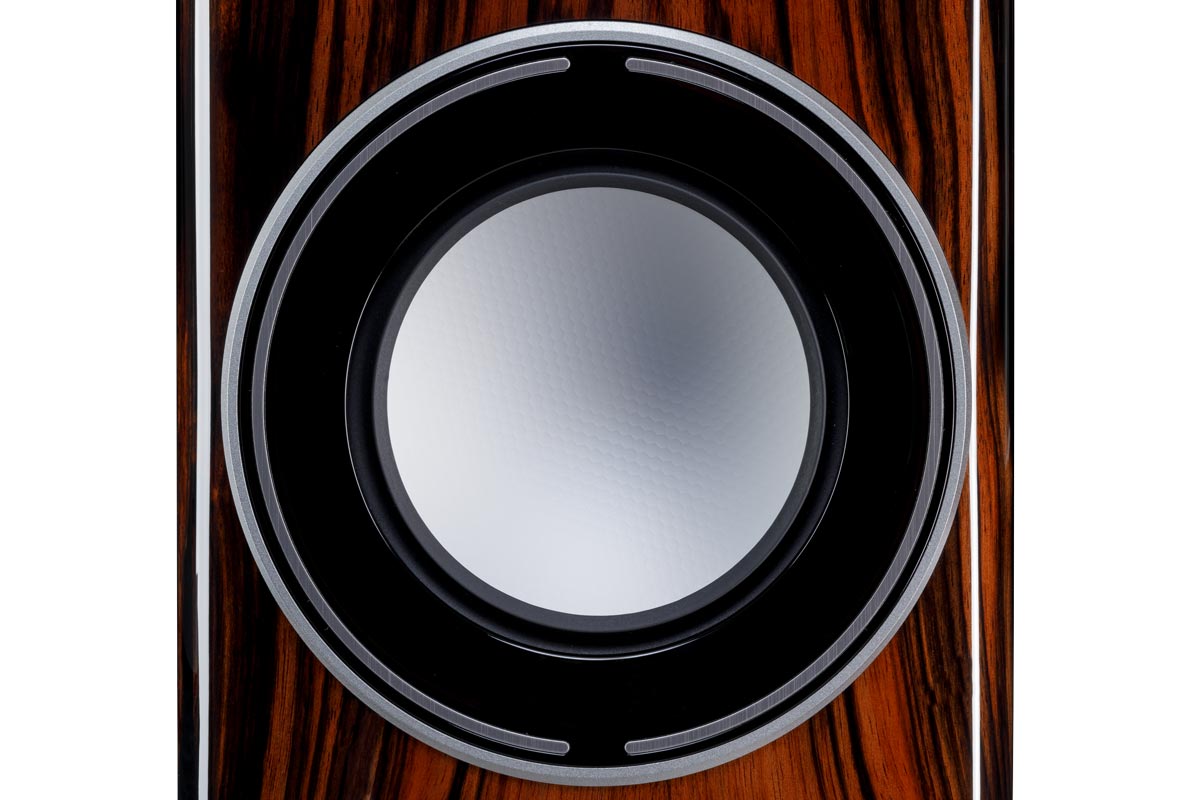Ebenso bekannt ist der grundlegende technologische Ansatz hinter dem 15-Zentimeter-Tiefmitteltöner, der für eine bestmögliche Kombination aus Steifigkeit (wichtig für eine kolbenförmige Membranbewegung) und Dämpfung (wichtig für die Unterdrückung von Resonanzspitzen) sorgen soll. Monitor Audio vertraut hier auf Hartmembranen, die die gewünschte Steifigkeit mitbringen, und züchtet ihnen mittels fortschrittlicher Materialforschung und einer cleveren Kompositstruktur ein exzellentes Dämpfungsverhalten an. Die Entwickler erreichen das, indem sie die Membranoberfläche aus einer keramikbeschichteten Aluminium-Magnesium-Legierung hauchdünn formen und auf eine wabenförmige Nomex-Trägerschicht aufbringen. Sieht man sich die parabolische Membranoberfläche aus der Nähe an, kann man tatsächlich das Hexmuster der darunterliegenden Strukturschicht erkennen. Auch hier profitiert die neue Kompakte von der im Rahmen des Jubiläumsprojektes durchgeführten Forschungsarbeit: Bei der neuesten Ausführung dieser Technologie sind auf der Membranrückseite jetzt noch zwei Kohlefaserschichten zur zusätzlichen Versteifung hinzugekommen. Der iterativen Verbesserungen Lohn sind um nochmals 8 Dezibel gesenkte Verzerrungswerte oberhalb von 300 Hertz.
