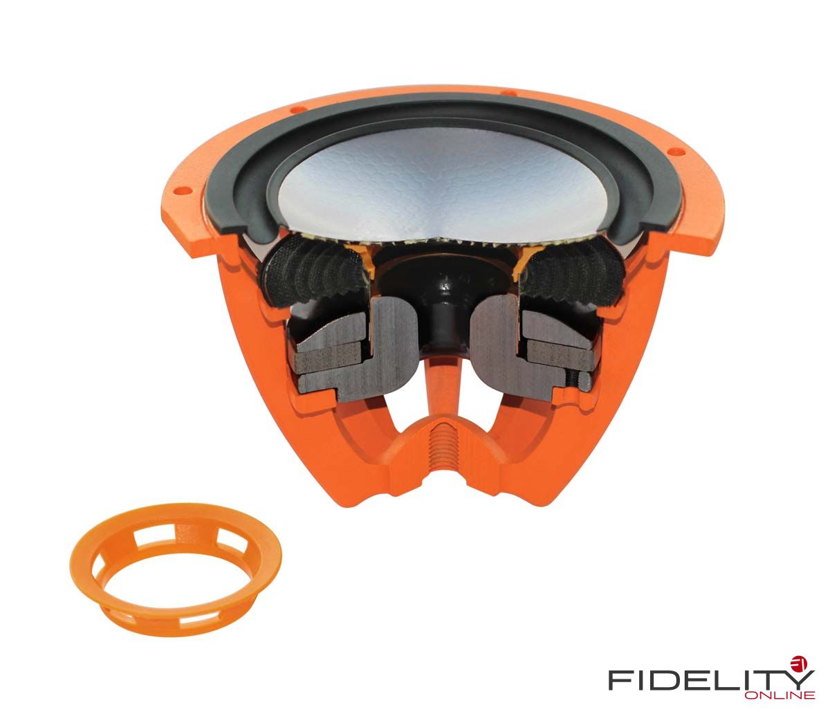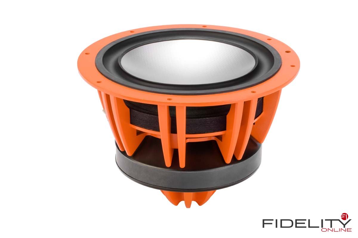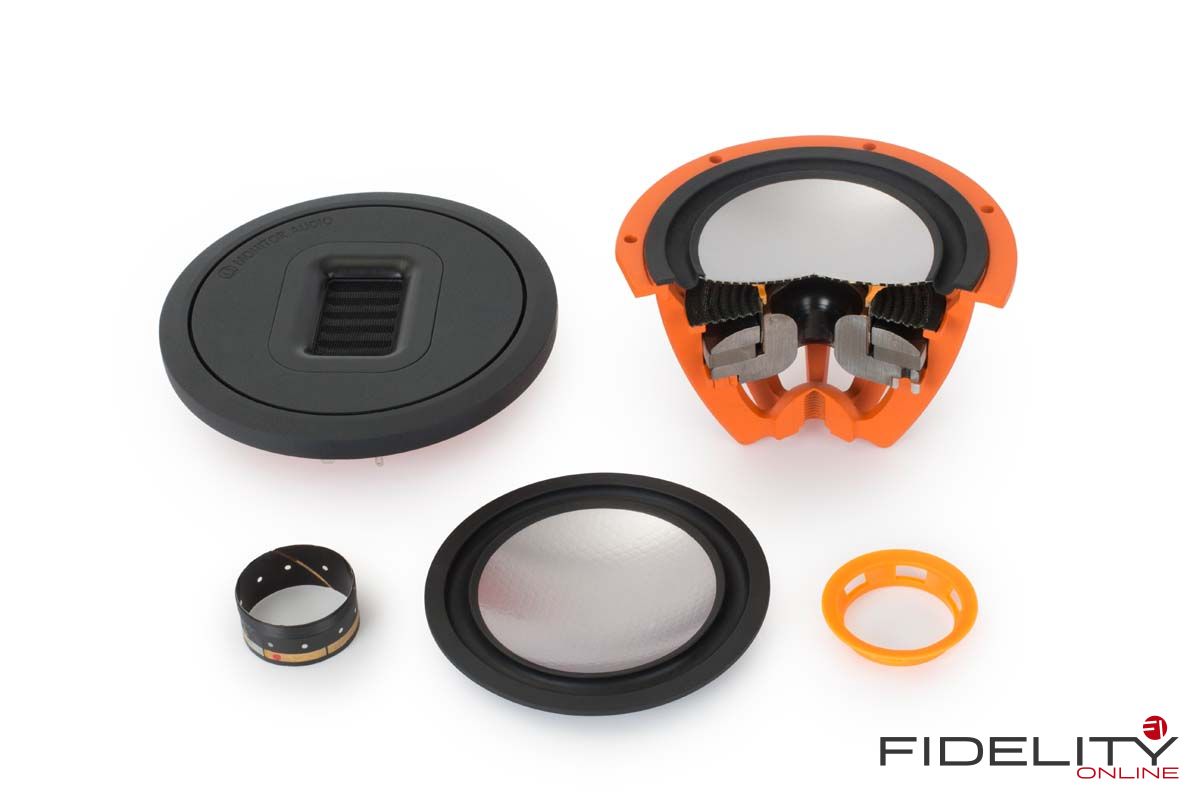 Für einen detaillierten Mittenbereich mit nicht zu starker Bündelung benötigt man vor allem eines: einen kleinen Mitteltöner. Der in diesem Fall zehn Zentimeter durchmessende Vertreter geht daher als wirklich idealer Treiber für diesen Job durch. Klein, mit leichter, extrem steifer Membran (ein Nomex-Aluminum-Sandwich wie auch bei den Tieftönern) und einem besonders starken Antrieb ausgestattet, arbeitet er auf ein durch eine gedämpfte Kunststoffröhre genau definiertes Luftvolumen und wird auf diese Weise außerdem zuverlässig vor Einflüssen durch die Tieftöner bewahrt.