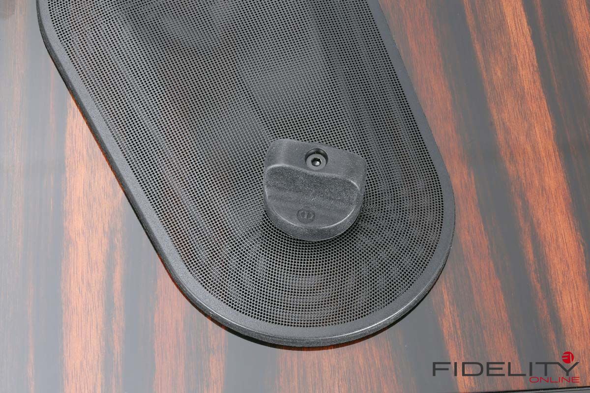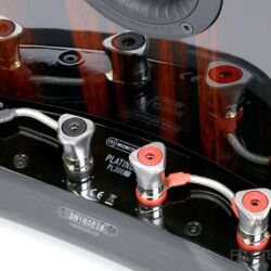 Besonderheiten: Treiberkonstruktion mit rückseitig verspannbarem Schraubgewinde, Bi-Wiring-Terminal, Spikes von der Oberseite einstellbar, einzeln abnehmbare Lochgitter
