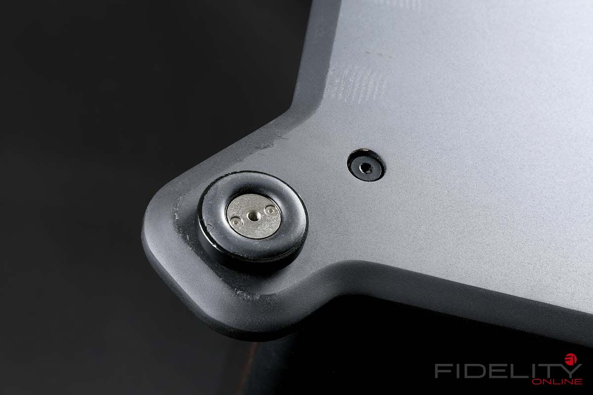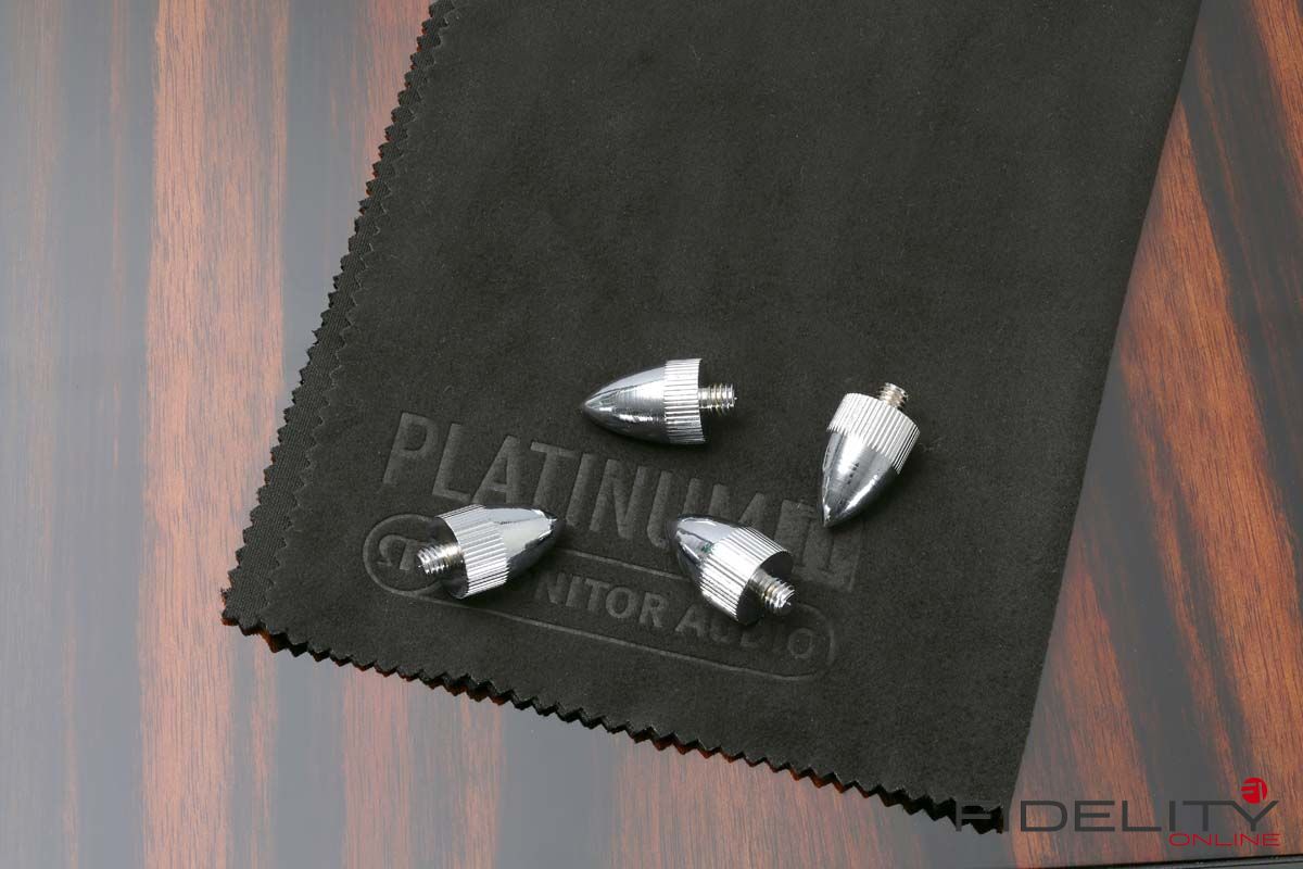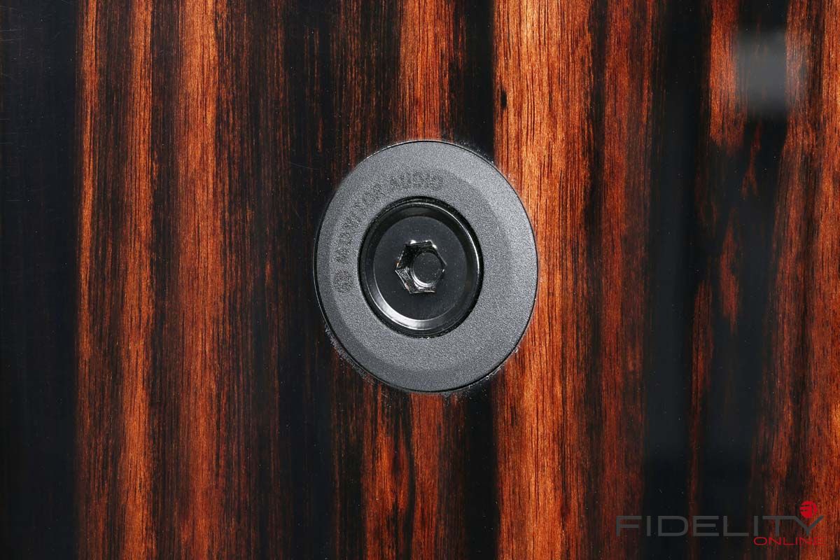 In aller Kürze: Beim Design strebten die Briten ein möglichst resonanzarmes Gehäuse an, das sich zudem mit seiner Form den abgestrahlten Schallwellen mit nur geringsten Auswirkungen in den Weg stellt. Mehrlagige Gehäusewände aus Kompositwerkstoffen sollen unerwünschtes Mitschwingen im Zaum halten. Dass Front- und Rückwand zudem mit Gewindestangen verspannt sind und die „Kiste“ gleichsam in die Zange nehmen, erhöht die Stabilität der Konstruktion beträchtlich. Die mit Leder bezogene Vorderseite ist schön, einen akustischen Sinn vermag ich allerdings in dieser Maßnahme nicht zu erkennen. Anwenderfreundlich sind dafür wieder die vier in die Grundplatte eingelassenen Spikes, deren Höhe man von oben regulieren und sich somit allzu viel unerfreuliches Herumkriechen sparen kann. Übrigens ein Detail, das dankenswerterweise von der Vorgängerin übernommen wurde.
