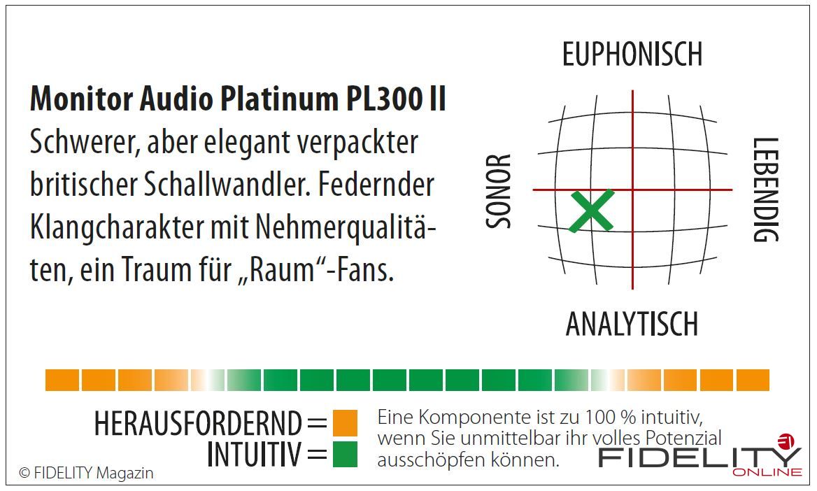 Mit dem Platinum PL300 II hat Monitor Audio einen wirklich großen Lautsprecher auf die fein justierbaren Füße gestellt, der einerseits sehr detailliert spielt, dabei andereseits aber nie zickig oder kühl wirkt, sondern alle Details in einen gut polierten Gesamtklang einbettet, der von der wirklich mühelosen Auflösung gerade in den mittleren und oberen Frequenzlagen herrührt. Und die Raumabbildung der PL300 II gehört zum Besten, was man derzeit kaufen kann.