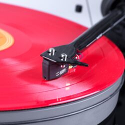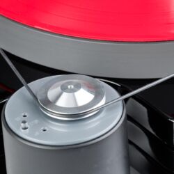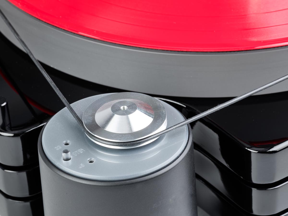 Aufgrund des integrierten Sinusgenerators kann der Motor auf eine korrigierende Nachregelung verzichten. Ein Ergebnis, das überzeugt. Hinzu kommt, dass ich selten einen leiseren Außenmotor gehört habe oder, um genauer zu sein, eben nicht gehört habe. Auch bei näherem Heranrücken an das Laufwerk sind weder Pulley noch Riemen zu vernehmen, lediglich eine leichte Wärme beim Berühren der Motordose zeigt, dass in diesem mächtig gewerkelt wird. Ebenso erfreut nehme ich im Verlauf des Albums wahr, dass der Tonarm, dessen Antiskatingqualität ich aufgrund der Technik des Überwurffadens zunächst misstraut habe, sich mit souveräner Führungsqualität auch durch die schwierigen Diskantlagen dieser Aufnahme arbeitet.