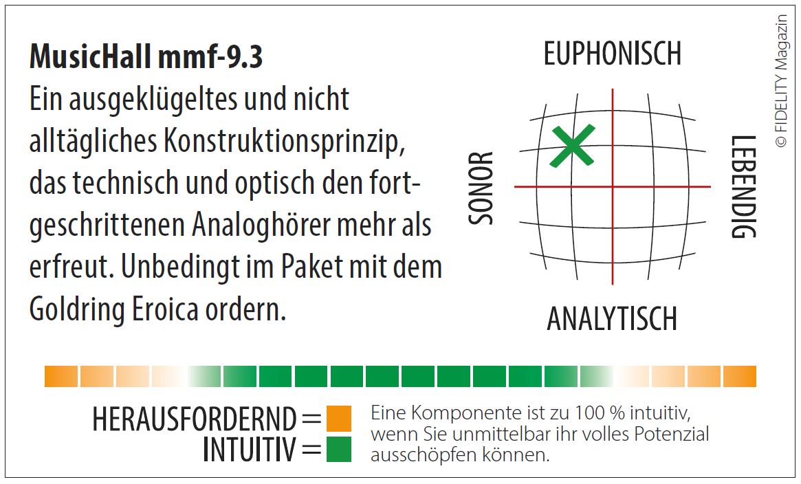 Roy Halls neuester Wurf ist ein echter Allrounder, der keine Musikrichtung bevorzugt und keine musikalischen Einzelparameter herausstellt. Der mmf-9.3. ist der richtige Spielpartner für all diejenigen, die deutlich mehr Genuss und Spielfreude von ihrem Plattenspieler als von einem Einsteigermodell erwarten, die sich aber deswegen auch nicht zum Laufwerksspezialisten ausbilden lassen wollen, um alle Eventualitäten zu berücksichtigen, die in dem Bermudadreieck von Laufwerk, Tonarm und Tonabnehmer versteckt liegen können. Das Goldring Eroica LX und der von Pro-Ject zugelieferte Carbon-Tonarm sind die perfekten Spielpartner für das Laufwerk. In der Summe kann man hier auf ein Paket aus 40-jähriger Konstruktionserfahrung vertrauen, das optisch, technisch und vor allem klanglich zu überzeugen weiß.