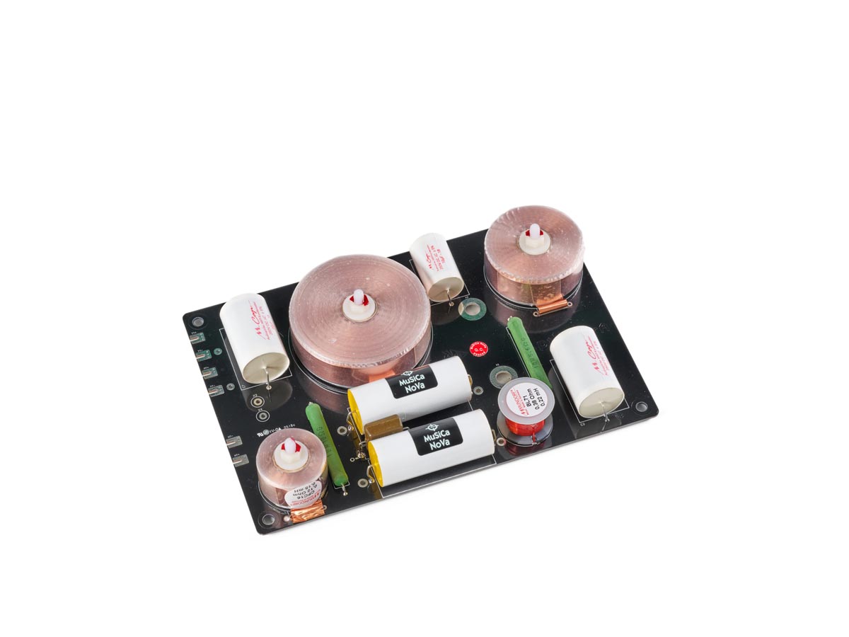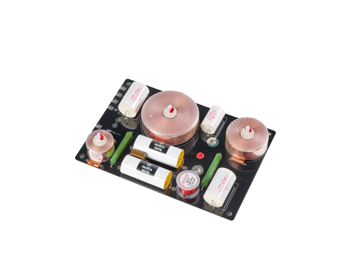 Dass für die PlethorA keine bei Vollmond unter einem Galgenbaum von irischen Jungfrauen handgepressten Chassis zum Einsatz kommen, sondern vergleichsweise handelsübliche Scan-Speak-Modelle, spricht für die Meriten der Frequenzweiche, deren endgültige Version in ungezählten Hörtests entstand. „Manche Boxenentwickler arbeiten nach dem Prinzip ‚Außen hui, innen pfui‘ mit billigsten Weichenbauteilen. Das entspricht nicht unserer Auffassung vom Lautsprecherbau“, konstatiert Andreas Krebs. Bis hin zum überaus stabilen Platinenmaterial wirkt die PlethorA-Weiche mit ihrem doppelseitigen Layout wohldurchdacht – und auch bei ihr werden Vibrationen ausgeschaltet, noch ehe sie entstehen können. Um Mikrofonie zu vermeiden, wird die Weiche in eine eigene Kammer direkt hinter der Rückwand des Schallwandlers eingebaut. Die Anschlussklemmen – sehr solide Exemplare vom MuSiCa-NoVa-Stammlieferanten Supra – werden direkt mit der Platine verschraubt.
