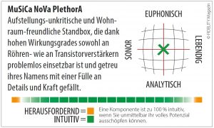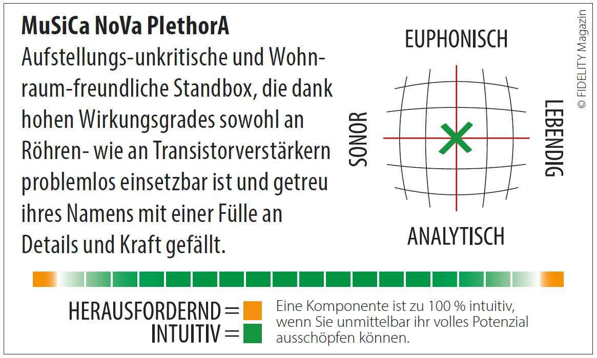 Quellgeräte und Verstärker basieren bei MuSiCa NoVa seit jeher auf Röhrentechnologie. Deshalb wurde die PlethorA auf hohen Wirkungsgrad und gutmütigen Impedanzverlauf getrimmt, sodass sie selbst schwachbrüstige Röhrenverstärker nicht vor Probleme stellt. In meinem Testgerätepark befindet sich derzeit der Audio-Note-Vollverstärker iZero mit passendem CD-Player. Das weiße Verstärkerchen im Mini-Format drückt aus vier ECL82-Röhren gerade einmal acht Watt pro Kanal bei sechs Ohm an die Lautsprecherklemmen. Mit der PlethorA hat der putzige Brite nicht die geringsten Probleme und stemmt bei Bedarf Pegel, die dem Gehör schon nicht mehr zuträglich sind. Das Klangfarben-Feuerwerk, das bei Audio Note im wahrsten Sinne zum guten Ton gehört, setzt die MuSiCa NoVa PlethorA wie ein guter Studio-Monitor um. Sie unterschlägt nichts, fügt auch nichts hinzu und hält sich aus dem Eigenklang der kompakten Kombi von der Insel praktisch völlig heraus.
