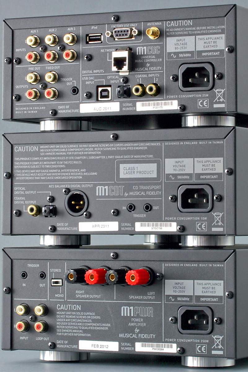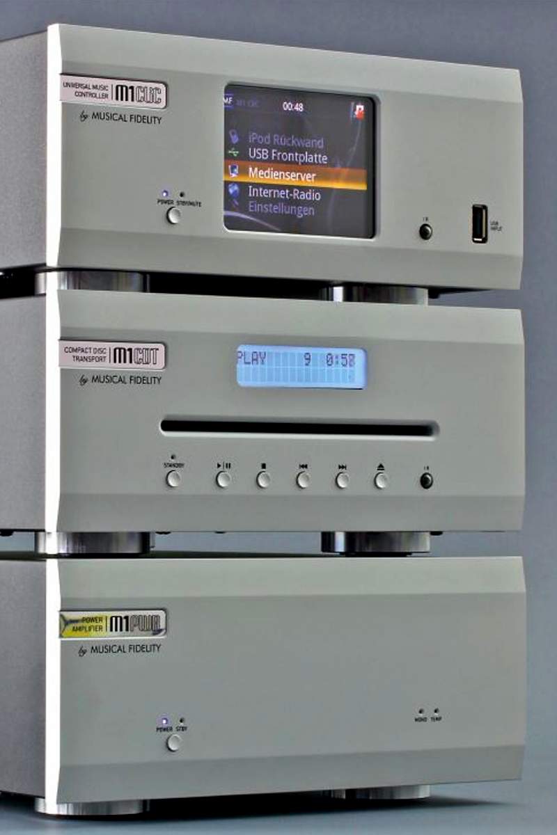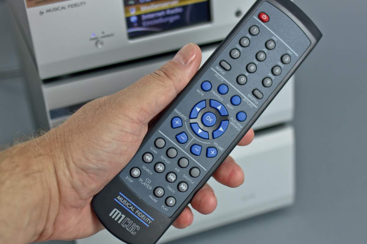 Immerhin kann ich mich via iPhone auch mit dem M1- CLiC! „unterhalten“, es gibt inzwischen, wen wundert’s, eine App dafür. „Die vorbildliche Verknüpfung der digitalen mit der analogen Welt“, so der Hersteller, bietet aber auch – bevor Puristen jetzt nicht weiterlesen – Analogeingänge, die das Signal bis zu den Ausgangsbuchsen auf der analogen Ebene belassen. Das ist sicher eine gute Nachricht für jene, die – wie ich – den digitalen Funktionsumfang eines solchen supermodernen Geräts durchaus begrüßen, aber andererseits wenig davon halten, das Signal ihrer Phonostufe spätestens im „Vorverstärker“ digitalisiert zu sehen. Apropos Phonostufe: Mit dem uns zur Verfügung gestellten Dreierpack aus M1-CLiC!, dem CD-Laufwerk M1-CDT und der Endstufe M1-PWR ist das M1-Arsenal von Musical Fidelity keineswegs erschöpft; so stehen etwa eine Referenz-Phonostufe namens M1-ViNL sowie ein Kopfhörerverstärker/Vorverstärker mit der Bezeichnung M1-HPA zur Verfügung. Ebenfalls unterhalten kann sich der Musical Fidelity CLiC! natürlich auch mit einer mitgelieferten Fernbedienung, die zudem das CD-Laufwerk anspricht; wer also nicht auf die Smartphone-Geschichte steht, darf sich an einer Infrarot-Verbindung erfreuen, die erstaunlich guten Empfang besitzt, es funktioniert meistens sogar „um die Ecke“, sprich: ohne direkte Sichtverbindung zum Gerät.